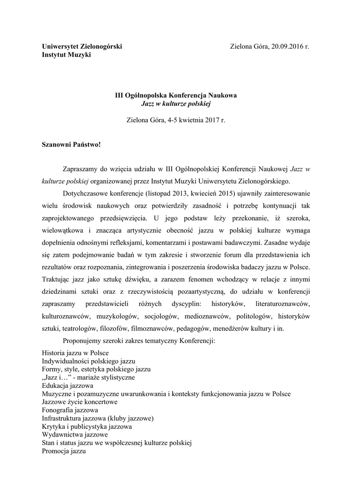 Uniwersytet Zielonogórski Instytut Muzyki Zielona Góra, 20.09.2016 r. III Ogólnopolska Konferencja Naukowa Jazz w kulturze polskiej Zielona Góra, 4-5 kwietnia 2017 r. Szanowni Państwo! Zapraszamy do wzięcia udziału w III Ogólnopolskiej Konferencji Naukowej Jazz w kulturze polskiej organizowanej przez Instytut Muzyki Uniwersytetu Zielonogórskiego. Dotychczasowe konferencje (listopad 2013, kwiecień 2015) ujawniły zainteresowanie wielu środowisk naukowych oraz potwierdziły zasadność i potrzebę kontynuacji tak zaprojektowanego przedsięwzięcia. U jego podstaw leży przekonanie, iż szeroka, wielowątkowa i znacząca artystycznie obecność jazzu w polskiej kulturze wymaga dopełnienia odnośnymi refleksjami, komentarzami i postawami badawczymi. Zasadne wydaje się zatem podejmowanie badań w tym zakresie i stworzenie forum dla przedstawienia ich rezultatów oraz rozpoznania, zintegrowania i poszerzenia środowiska badaczy jazzu w Polsce. Traktując jazz jako sztukę dźwięku, a zarazem fenomen wchodzący w relacje z innymi dziedzinami sztuki oraz z rzeczywistością pozaartystyczną, do udziału w konferencji zapraszamy przedstawicieli różnych dyscyplin: historyków, literaturoznawców, kulturoznawców, muzykologów, socjologów, medioznawców, politologów, historyków sztuki, teatrologów, filozofów, filmoznawców, pedagogów, menedżerów kultury i in. Proponujemy szeroki zakres tematyczny Konferencji: Historia jazzu w Polsce Indywidualności polskiego jazzu Formy, style, estetyka polskiego jazzu „Jazz i…” - mariaże stylistyczne Edukacja jazzowa Muzyczne i pozamuzyczne uwarunkowania i konteksty funkcjonowania jazzu w Polsce Jazzowe życie koncertowe Fonografia jazzowa Infrastruktura jazzowa (kluby jazzowe) Krytyka i publicystyka jazzowa Wydawnictwa jazzowe Stan i status jazzu we współczesnej kulturze polskiej Promocja jazzu Jazz w mediach Polski jazz w badaniach naukowych Polski jazz w perspektywie międzynarodowej Organizacje jazzowe Dokumentowanie polskiej muzyki jazzowej Inspiracje jazzowe w literaturze, sztukach wizualnych, filmie, teatrze… III Ogólnopolska Konferencja Naukowa Jazz w kulturze polskiej odbędzie się w dniach 4-5 kwietnia 2017 r. w Zielonej Górze, w Rektoracie Uniwersytetu Zielonogórskiego (ul. Licealna 9). Osoby zainteresowane udziałem w Konferencji prosimy o wypełnienie Karty zgłoszeniowej i przesłanie jej do 28 lutego 2017 r. na adresy: [email protected] lub dr Rafał Ciesielski Uniwersytet Zielonogórski Instytut Muzyki ul. Prof. Z.Szafrana 19 65-516 Zielona Góra Do 15 marca 2017 r. poinformujemy Państwa o przyjęciu zgłoszonych propozycji oraz o numerze konta i terminie wpłaty za udział w Konferencji. Koszt udziału wynosi 350.00 zł i obejmuje: opłatę konferencyjną, wyżywienie (obiady 4 i 5 kwietnia, uroczystą kolację 4 kwietnia) oraz napoje w trakcie konferencji. Nie pośredniczymy w organizacji zakwaterowania. W kolejnym komunikacie podamy adresy hoteli znajdujących się w okolicy miejsca obrad Konferencji. Planujemy, aby rezultatem konferencji była recenzowana publikacja przedstawionych materiałów. Ukazały się już tomy, będące pokłosiem obu poprzednich konferencji: Jazz w kulturze polskiej, tom 1, red. R.Ciesielski, Zielona Góra 2014; Jazz w kulturze polskiej, tom 2, red. R.Ciesielski, Zielona Góra 2016. Wszelkie pytania prosimy kierować na adres: [email protected] lub tel. 605 270 380. Liczymy na Państwa zainteresowanie i zapraszamy do Zielonej Góry. Z poważaniem Kierownik naukowy Konferencji dr Rafał Ciesielski