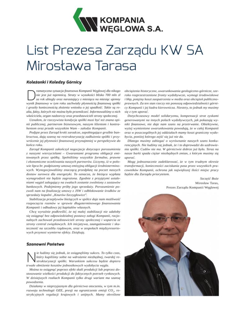 List Prezesa Zarządu KW SA Mirosława Tarasa Koleżanki i Koledzy Górnicy D ramatyczna sytuacja finansowa Kompanii Węglowej dla nikogo nie jest już tajemnicą. Straty w wysokości blisko 700 mln zł za rok ubiegły oraz narastający z miesiąca na miesiąc ujemny wynik finansowy w tym roku zachwiały płynnością finansową spółki i groziły koniecznością złożenia wniosku o jej upadłość. Takie są realia, fakty, których nie można było przemilczeć. Informowaliśmy o nich właściciela, organ nadzorczy oraz przedstawicieli strony społecznej. Uznałem, że rzeczywista kondycja spółki musi być też znana opinii publicznej, partnerom biznesowym, naszym klientom i kontrahentom oraz przede wszystkim Wam – załodze Kompanii. Podjęte przez Zarząd kroki zaradcze, zapobiegające groźbie bankructwa, dają szansę na restrukturyzację zadłużenia spółki i przywrócenie jej płynności finansowej przynajmniej w perspektywie do końca roku. Zarząd Kompanii zakończył negocjacje dotyczące porozumienia z naszymi wierzycielami – Gwarantami programu obligacji emitowanych przez spółkę. Spełniliśmy wszystkie formalne, prawne i ekonomiczne oczekiwania naszych partnerów. Liczymy, iż w połowie lipca br. podpiszemy umowę emisyjną obligacji średnioterminowych. Wynegocjowaliśmy znaczącą przedpłatę na poczet naszych dostaw surowca dla energetyki. To oznacza, że bieżąca wypłata wynagrodzeń nie będzie zagrożona. Zgodnie z przyjętymi ustaleniami węgiel zalegający na zwałach zostanie zwolniony z zastawów bankowych. Podejmiemy próby jego sprzedaży. Porozumienie pozwoli nam na finalizację umowy z JSW i odblokowanie środków ze sprzedaży kopalni „Knurów-Szczygłowice”. Stabilizacja przepływów bieżących w spółce daje nam możliwość rozpoczęcia rozmów w sprawie długoterminowego finansowania Kompanii i odbudowy jej kapitałów własnych. Chcę wyraźnie podkreślić, że tej małej stabilizacji nie udałoby się osiągnąć bez odpowiedzialnej postawy załogi Kompanii, racjonalnych zachowań przedstawicieli strony społecznej i wsparcia ze strony central związkowych. Ich inicjatywa, zaangażowanie i skuteczność na szczeblu rządowym, oraz w zespołach międzyresortowych przynosi wymierne efekty. Dziękuję. Szanowni Państwo N ie łudźmy się jednak, że osiągnęliśmy sukces. To tylko czas, który kupiliśmy sobie na wdrożenie niezbędnej, twardej restrukturyzacji spółki. Warunkiem sukcesu będzie dopiero trwałe obniżenie kosztów jednostkowych wydobycia węgla. Można to osiągnąć poprzez efekt skali produkcji lub poprzez dostosowanie wielkości produkcji do faktycznych potrzeb rynkowych. W dzisiejszych realiach Kompanii tylko drugi wariant ma szansę powodzenia. Działamy w nieprzyjaznym dla górnictwa otoczeniu, w tym m.in. rozwoju technologii OZE, presji na ograniczenie emisji CO2, restrykcyjnych regulacji krajowych i unijnych. Mamy określone obciążenia historyczne, uwarunkowania geologiczno-górnicze, szeroko rozprzestrzenione fronty wydobywcze, wymogi środowiskowe i bhp, potężny koszt zaopatrzenia w media oraz obciążeń publicznoprawnych. Za ten stan rzeczy nie ponoszą odpowiedzialności górnicy Kompanii i jej kadra kierownicza. Niestety, to jednak my musimy się z tym uporać. Dotychczasowy model solidaryzmu, kompensacji strat zyskami generowanymi na innych polach wydobywczych, jak pokazują wyniki finansowe, nie daje nam szans na przetrwanie. Obiektywne, wyżej wymienione uwarunkowania powodują, że w całej Kompanii oraz w poszczególnych jej oddziałach mamy koszt graniczny wydobycia, poniżej którego zejść się już nie da. Dlatego musimy zabiegać o wyrównanie naszych szans konkurencyjnych. Nie łudźmy się jednak, że i to doprowadzi do uzdrowienia spółki. Cudów nie ma. W górnictwie dobrze już było. Teraz na nasze barki spada ciężar niezbędnych zmian, z którym musimy się uporać. Mogę jednoznacznie zadeklarować, że w tym trudnym okresie transformacji, konieczności zaciskania pasa przez wszystkich pracowników Kompanii, ochrona jak największej ilości miejsc pracy będzie dla Zarządu priorytetem. Szczęść Boże Mirosław Taras, Prezes Zarządu Kompanii Węglowej