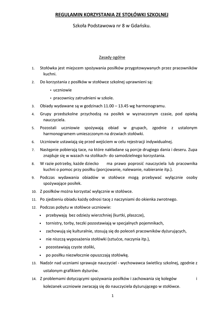 REGULAMIN KORZYSTANIA ZE STOŁÓWKI SZKOLNEJ Szkoła Podstawowa nr 8 w Gdańsku. Zasady ogólne 1. Stołówka jest miejscem spożywania posiłków przygotowywanych przez pracowników kuchni. 2. Do korzystania z posiłków w stołówce szkolnej uprawnieni są: ▪ uczniowie ▪ pracownicy zatrudnieni w szkole. 3. Obiady wydawane są w godzinach 11.00 – 13.45 wg harmonogramu. 4. Grupy przedszkolne przychodzą na posiłek w wyznaczonym czasie, pod opieką nauczyciela. 5. Pozostali uczniowie spożywają obiad w grupach, harmonogramem umieszczonym na drzwiach stołówki. 6. Uczniowie ustawiają się przed wejściem w celu rejestracji indywidualnej. 7. Następnie pobierają tace, na które nakładane są porcje drugiego dania i deseru. Zupa znajduje się w wazach na stolikach- do samodzielnego korzystania. 8. W razie potrzeby, każde dziecko ma prawo poprosić nauczyciela lub pracownika kuchni o pomoc przy posiłku (porcjowanie, nalewanie, nabieranie itp.). 9. Podczas wydawania obiadów w stołówce mogą przebywać wyłącznie osoby spożywające posiłek. 10. Z posiłków można korzystać wyłącznie w stołówce. 11. Po zjedzeniu obiadu każdy odnosi tacę z naczyniami do okienka zwrotnego. 12. Podczas pobytu w stołówce uczniowie: 13. zgodnie z ustalonym • przebywają bez odzieży wierzchniej (kurtki, płaszcze), • tornistry, torby, teczki pozostawiają w specjalnych pojemnikach, • zachowują się kulturalnie, stosują się do poleceń pracowników dyżurujących, • nie niszczą wyposażenia stołówki (sztućce, naczynia itp.), • pozostawiają czyste stoliki, • po posiłku niezwłocznie opuszczają stołówkę. Nadzór nad uczniami sprawuje nauczyciel - wychowawca świetlicy szkolnej, zgodnie z ustalonym grafikiem dyżurów. 14. Z problemami dotyczącymi spożywania posiłków i zachowania się kolegów koleżanek uczniowie zwracają się do nauczyciela dyżurującego w stołówce. 1 i Zakup i odwołania obiadów 1. Rodzic (opiekun prawny) podpisuje umowę na obiady na druku wg załącznika nr 1 do Regulaminu stołówki szkolnej. Umowę na obiady dla dziecka rozpoczynającego (lub wznawiającego po rozwiązaniu umowy) korzystanie z obiadów składamy w sekretariacie szkoły do 25 dnia miesiąca poprzedzającego miesiąc, w którym dziecko rozpoczyna korzystanie z obiadów. Umowę prosimy podpisać przed wykonaniem przelewu. Przelewy, do których nie będzie umowy zostaną odesłane do nadawcy. Brak umowy spowoduje niemożliwość korzystania z obiadów. Umowę prosimy wypełnić drukowanymi literami. 2. Rodzic (opiekun prawny) ma prawo do rozwiązania umowy na obiady na druku wg załącznika nr 2 do Regulaminu stołówki szkolne, w sekretariacie szkoły, w terminie do 25 dnia miesiąca poprzedzającego miesiąc, od którego następuje rezygnacja z obiadów. Należy zachować kopię rozwiązania umowy potwierdzoną przez sekretariat szkoły. 3. Opłaty za obiady należy wnosić przelewem na wydzielone konto bankowe szkoły. Dla każdego dziecka należy wykonać oddzielny przelew. Prosimy, aby nadawcą przelewu była osoba (rodzic), która podpisała umowę. Przelewy, które nie spełnią tych wymogów mogą zostać zwrócone do nadawcy. 4. W tytule wpłaty należy podać: a. imię i nazwisko, klasę, dziecka, nr umowy, b. miesiąc, którego dotyczy wplata, c. w przypadku wpłaty niepełnej kwoty - wyszczególnić dni, w których dziecko nie będzie korzystać z obiadu i dni, za które dokonano odliczenia. Przykład opisu przelewu: Jan Kowalski kl. 4d SP…, nr umowy (karty) … , odpis 24,28.IX, bez 14-19.X. Oznacza, że był zgłoszony odpis na dni 24.IX i 28.IX, w dniach od 14.X do 19.X dziecko nie będzie korzystało z obiadu. 5. Przelewy, które nie spełnią tych wymogów mogą zostać zwrócone do nadawcy. 2 6. Wpłat na konto należy dokonywać z góry za następny miesiąc od 16 do 27 dnia miesiąca poprzedzającego miesiąc wydawania posiłków. Wyjątek będą stanowić płatności za wrzesień i styczeń. W tym przypadku terminy ustalone będą odrębnie. 7. Wpłat na konto należy dokonywać z odpowiednim wyprzedzeniem. Za termin płatności uważamy datę wpływu na konto szkoły. Obiady będą wydawane po terminowym wpływie płatności na konto szkoły. 8. Wysokość należności za obiady będzie podawana na stronie internetowej: http://www.sp8.gda.pl oraz na drzwiach szkoły i wejściu do stołówki. 9. Rodzic zobowiązuje się do dokonywania wpłat w terminie i w prawidłowej kwocie. 10. Za zwłokę w płatnościach będą naliczane ustawowe odsetki. 11. Odwołanie obiadu można zgłosić poprzez adres e-mailowy: [email protected] Należy podać: imię i nazwisko oraz klasę dziecka, nr umowy , datę nieobecności, imię i nazwisko oraz telefon kontaktowy rodzica. 12. Odwołania obiadów należy traktować jako przypadki losowe (np. choroba, nieobecność w szkole, wycieczka szkolna). 13. W przypadku przelewu w zaniżonej wysokości, ostatnie dni danego okresu będą nieopłacone. Należność za odwołane obiady (nadpłata) i saldo w miesiącu czerwcu i grudniu zostanie przelana na konto bankowe, z którego nastąpiła wpłata za obiady lub na konto bankowe wskazane przez rodzica. 3 Załącznik Nr 1 do Regulaminu stołówki szkolnej Umowa nr ………. o korzystanie z obiadów w stołówce szkolnej Szkoły Podstawowej nr 8 w Gdańsku w roku szkolnym ………………………/…………………… zawarta w dniu .......................... r. w Gdańsku pomiędzy Gminą Miasta Gdańska, ul. Nowe Ogrody 8/12, 80-803 Gdańsk, NIP 583-00-11-969, reprezentowanym przez Marię Rudnicką - Dyrektora Szkoły Podstawowej nr 8 w Gdańsku, ul. Dragana 2, 80807 Gdańsk, zwaną dalej Szkołą, a rodzicem (opiekunem prawnym) ………………………………………………………………………………………………………………………………………………………………… /imię i nazwisko rodzica (opiekuna prawnego)/ …………