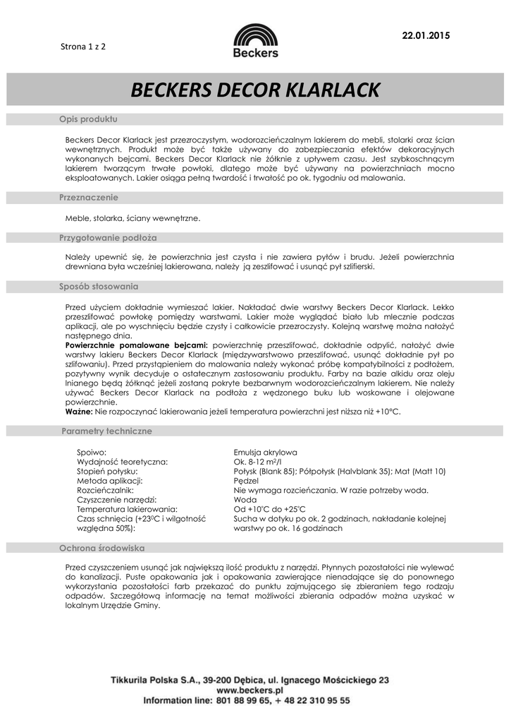 22.01.2015 Strona 1 z 2 BECKERS DECOR KLARLACK Opis produktu Beckers Decor Klarlack jest przezroczystym, wodorozcieńczalnym lakierem do mebli, stolarki oraz ścian wewnętrznych. Produkt może być także używany do zabezpieczania efektów dekoracyjnych wykonanych bejcami. Beckers Decor Klarlack nie żółknie z upływem czasu. Jest szybkoschnącym lakierem tworzącym trwałe powłoki, dlatego może być używany na powierzchniach mocno eksploatowanych. Lakier osiąga pełną twardość i trwałość po ok. tygodniu od malowania. Przeznaczenie Meble, stolarka, ściany wewnętrzne. Przygotowanie podłoża Należy upewnić się, że powierzchnia jest czysta i nie zawiera pyłów i brudu. Jeżeli powierzchnia drewniana była wcześniej lakierowana, należy ją zeszlifować i usunąć pył szlifierski. Sposób stosowania Przed użyciem dokładnie wymieszać lakier. Nakładać dwie warstwy Beckers Decor Klarlack. Lekko przeszlifować powłokę pomiędzy warstwami. Lakier może wyglądać biało lub mlecznie podczas aplikacji, ale po wyschnięciu będzie czysty i całkowicie przezroczysty. Kolejną warstwę można nałożyć następnego dnia. Powierzchnie pomalowane bejcami: powierzchnię przeszlifować, dokładnie odpylić, nałożyć dwie warstwy lakieru Beckers Decor Klarlack (międzywarstwowo przeszlifować, usunąć dokładnie pył po szlifowaniu). Przed przystąpieniem do malowania należy wykonać próbę kompatybilności z podłożem, pozytywny wynik decyduje o ostatecznym zastosowaniu produktu. Farby na bazie alkidu oraz oleju lnianego będą żółknąć jeżeli zostaną pokryte bezbarwnym wodorozcieńczalnym lakierem. Nie należy używać Beckers Decor Klarlack na podłoża z wędzonego buku lub woskowane i olejowane powierzchnie. Ważne: Nie rozpoczynać lakierowania jeżeli temperatura powierzchni jest niższa niż +10°C. Parametry techniczne Spoiwo: Wydajność teoretyczna: Stopień połysku: Metoda aplikacji: Rozcieńczalnik: Czyszczenie narzędzi: Temperatura lakierowania: Czas schnięcia (+230C i wilgotność względna 50%): Emulsja akrylowa Ok. 8-12 m2/l Połysk (Blank 85); Półpołysk (Halvblank 35); Mat (Matt 10) Pędzel Nie wymaga rozcieńczania. W razie potrzeby woda. Woda Od +10°C do +25°C Sucha w dotyku po ok. 2 godzinach, nakładanie kolejnej warstwy po ok. 16 godzinach Ochrona środowiska Przed czyszczeniem usunąć jak największą ilość produktu z narzędzi. Płynnych pozostałości nie wylewać do kanalizacji. Puste opakowania jak i opakowania zawierające nienadające się do ponownego wykorzystania pozostałości farb przekazać do punktu zajmującego się zbieraniem tego rodzaju odpadów. Szczegółową informację na temat możliwości zbierania odpadów można uzyskać w lokalnym Urzędzie Gminy. 22.01.2015 Strona 2 z 2 BECKERS DECOR KLARLACK Wskazówki BHP i ppoż. Produkt przechowywać w miejscu niedostępnym dla dzieci. Zawiera 1,2-benzoizotiazol-3(2H)-on. Może powodować wystąpienie reakcji alergicznej. Podczas malowania nosić odpowiednie ubranie robocze oraz rękawice ochronne. Pomieszczenia zamknięte po zastosowaniu farby należy wietrzyć do zaniku zapachu i po tym czasie nadają się do użytkowania. Produkt nie jest sklasyfikowany jako niebezpieczny. Karta charakterystyki produktu dostępna na życzenie Klienta. Transport i przechowywanie Chronić przed mrozem. Kat. A/e. Dopuszczalna zawartość LZO od 2010r. - 130 g/l. Produkt zawiera poniżej 130 g/l LZO . W celu uzyskania dalszych informacji, należy zapoznać się z instrukcją, kartą charakterystyki, broszurami lub odwiedzić stronę internetową. Powyższe informacje nie są wyczerpujące i kompletne. Dane opierają się na badaniach laboratoryjnych oraz doświadczeniu praktycznym i są przekazywane zgodnie z naszą najlepszą wiedzą. Jakość wyrobu zagwarantowana jest naszym systemem produkcji opartym na wymaganiach norm ISO 9001 i ISO 14001. Jako producent nie możemy kontrolować warunków, w jakich produkt jest używany lub różnorodności czynników, które mają wpływ na wykorzystanie i zastosowanie produktu. Nie bierzemy odpowiedzialności za szkody spowodowane użyciem wyrobu w sposób niezgodny z zaleceniami i w niewłaściwych celach. Zastrzegamy sobie prawo do zmiany podanych informacji bez wcześniejszego uprzedzenia.