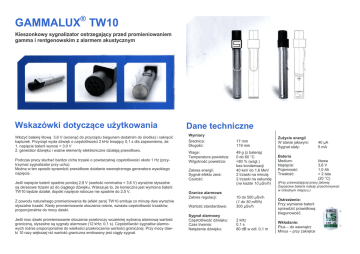 GAMMALUX® TW10 Kieszonkowy sygnalizator ostrzegający przed promieniowaniem gamma i rentgenowskim z alarmem akustycznym Wskazówki dotyczące użytkowania Włożyć baterię litową 3,6 V (wcisnąć do przyrządu biegunem dodatnim do środka) i nakręcić kapturek. Przyrząd wyda dźwięk o częstotliwości 2 kHz trwający 0,1 s dla zapewnienia, że: 1. napięcie baterii wynosi > 3.0 V 2. generator dźwięku i ważne elementy elektroniczne działają prawidłowo. Podczas pracy słychać bardzo ciche trzaski o powtarzalnej częstotliwości około 1 Hz (przytrzymać sygnalizator przy uchu). Można w ten sposób sprawdzić prawidłowe działanie wewnętrznego generatora wysokiego napięcia. Jeśli napięcie baterii spadnie poniżej 2,9 V (wartość nominalna = 3,6 V) wyraźnie słyszalne są okresowe trzaski aż do ciągłego dźwięku. Wskazuje to, że konieczna jest wymiana baterii. TW10 będzie działał, dopóki napięcie robocze nie spadnie do 2,5 V. Z powodu naturalnego promieniowania tła (efekt zera) TW10 emituje co minutę dwa wyraźnie słyszalne trzaski. Kiedy promieniowanie otoczenia rośnie, wzrasta częstotliwość trzasków, proporcjonalnie do mocy dawki. Jeśli moc dawki promieniowanie otoczenia przekroczy wcześniej wybraną alarmową wartość graniczną, słyszalne są sygnały alarmowe (12 kHz; 0,1 s). Częstotliwość sygnałów alarmowych rośnie proporcjonalnie do wielkości przekroczenia wartości granicznej. Przy mocy dawki 10 razy większej niż wartość graniczna emitowany jest ciągły sygnał. Dane techniczne Wymiary Średnica: Długość: 17 mm 119 mm Waga: Temperatura powietrza: Wilgotność powietrza: 49 g (z baterią) 0 do 60 °C <80 % (wzgl.) bez kondensacji 40 keV do 1,6 MeV 2 trzaski na minutę 2 trzaski na sekundę (na każde 10 μSv/h) Zakres energii: Sygnał efektu zera: Czułość: Granice alarmowe Zakres regulacji: Wartość standardowa: 10 do 500 μSv/h (1 do 50 mR/h) 300 μSv/h Sygnał alarmowy Częstotliwość dźwięku: Czas trwania: Natężenie dźwięku: 2 kHz 0,1 s 80 dB w odl. 0,1 m Zużycie energii W stanie jałowym: Sygnał stały: Bateria Medium: Napięcie: Pojemność: Trwałość: 40 μA 5 mA litowa 3,6 V 1,0 Ah > 2 lata (20 °C) (Przy przeważającej pracy jałowej. Zapasowe bateria należy przechowywać w chłodnym miejscu.) Ostrzeżenie: Przy wymianie baterii sprawdzić prawidłową biegunowość. Wkładanie: Plus – do wewnątrz Minus – przy zakrętce