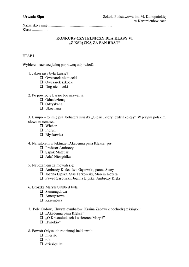 Urszula Sipa Szkoła Podstawowa im. M. Konopnickiej w Krzemieniewicach Nazwisko i imię ................................................................... Klasa ................. KONKURS CZYTELNICZY DLA KLASY VI „Z KSIĄŻKĄ ZA PAN BRAT” ETAP I Wybierz i zaznacz jedną poprawną odpowiedź. 1. Jakiej rasy była Lassie? Owczarek niemiecki Owczarek szkocki Dog niemiecki 2. Po powrocie Lassie Joe nazwał ją: Odnalezioną Odzyskaną Ukochaną 3. Lampo – to imię psa, bohatera książki „O psie, który jeździł koleją”. W języku polskim słowo to oznacza: Wicher Piorun Błyskawica 4. Narratorem w lekturze „Akademia pana Kleksa” jest: Profesor Ambroży Szpak Mateusz Adaś Niezgódka 5. Nauczaniem zajmowali się: Ambroży Kleks, Iwo Gąsowski, panna Stacy Joanna Lipska, Staś Tarkowski, Marcin Kozera Paweł Gąsowski, Joanna Lipska, Ambroży Kleks 6. Broszka Maryli Cuthbert była: Szmaragdowa Ametystowa Krzemowa 7. Pole Cudów, Chwytajcymbałów, Kraina Zabawek pochodzą z książki: „Akademia pana Kleksa” „O Krasnoludkach i o sierotce Marysi” „Pinokio” 8. Powrót Odysa do rodzinnej Itaki trwał: miesiąc rok dziesięć lat 9. Wyspa, na którą spadł Ikar to: Kreta Wyspa Ikaryjska Ikaria 10. Zwrot: „rozindyczył się” oznacza, że ktoś: Posmutniał Rozzłościł się Zgłupiał 11. Król Niesfor pojawia się w tekście: Stanisława Lema Jana Brzechwy Bolesława Prusa 12. Temat cyrku nie występuje w utworze: C. Collodiego E. Orzeszkowej H. Sienkiewicza 13. Twórcą bajki w Polsce jest: A. Mickiewicz I. Krasicki J. Słowacki 14. Miejsce akcji „Tego obcego” to: Młynówka, Wrocław, Warszawa Bielice, Kraków, Strzemienice Stryków, Łętów, Olszyny 15. W tym samym okresie co M. Konopnicka literatury nie tworzyli: J. Brzechwa, J. Tuwim E. Pawłowska, H. Sienkiewicz A. Głowacki, J. Sawa Szkoła Podstawowa im. M. Konopnickiej w Krzemieniewicach Nazwisko i imię ................................................................... Klasa ................. KONKURS CZYTELNICZY DLA KLASY VI „Z KSIĄŻKĄ ZA PAN BRAT” ETAP II 1.Z jakich utworów pochodzą podane fragmenty? Zapisz ich tytuły. „... – Sprawa jest taka: ubiegłej soboty napisałem trzy listy do trzech moich przyjaciół z prośbą, aby przyszli do mnie w niedzielę zagrać w preferansa...No i żaden nie przyszedł. Nie tylko nie przyszedł, ale nawet nie odpisał. Czy jest jakaś możliwość wytłumaczenia tego postępku?...” ............................................................................................................................... „... Zwierciadełko, powiedz przecie, kto najpiękniejszy jest na świecie?...” ............................................................................................................................... „... Rozstępują się straszliwe ciemności nagromadzone nad światem przez złych ludzi...” ............................................................................................................................... „... Ale Chwedora wnet musiała wyjść z chaty, bo najęła się na dzień ten do pełcia dworskich ogrodów warzywnych, a mąż jej, Klemens, od godziny już w pobliżu dworu orał ziemię pod zasiew jesienny...” ............................................................................................................................... 2.Która para literacka nie jest poprawna? Kubok i Łysek Lina i Mateusz Kozera Pestka i Marian Anulka i Filip Mostowiakowie 3.Rozwiąż zagadki. W Kruszwicy w pewnej wieży tak mocno grasowały, że aż Popielowi życie odebrały........................................................ Miała śpiewać księciu i mieć ręce spętane, wolała jednak skoczyć we fale wiślane. .......................................................... Cały czas mu dokuczano, nie wiedziało dlaczego, ale wiosną je łabędzie przyjęły jak swego. ..................................................... 4.Do podanych rekwizytów podaj tytuł utworu lub imię i nazwisko autora: Niezapominajki – Diabełek – maskotka – Elementarz – Kostium żołnierza polskiego – Pierścień faraona – 5.Rozpoznaj ilustracje, rozszyfruj zagadki i rebusy. Z jakiego utworu pochodzą te postacie? Rozwiązanie .................................................... Tytuł utworu .................................................... Rozwiązanie ................................................. Tytuł utworu .................................................. Jak ma na imię Ta dziewczynka ruda, Co może konia unieść I inne czynić cuda? Rozwiązanie .................................................... Tytuł utworu .................................................... Rozwiązanie ............................................... Tytuł utworu ............................................... 6.Odszukaj tytuły, a następnie wypisz je pod tekstem. Przyjaciele! Akademia pana Kleksa jest najśmieszniejszą uczelnią na świecie. Najmilsi z nas dostają w nagrodę wiersze dla dzieci, które przyklejają sobie na nosie. Wczoraj Janko Muzykant wyśmiewał się z Kopciuszka. Karolcia, jej przyjaciółka, postanowiła się zemścić, a później wszyscy wybrali się do lasu na jagody. Każdy zdziwiłby się, gdyby zobaczył to, co słonko widziało w tym momencie: ananasy z naszej klasy pociągnęły za sznurek i na wszystkich posypały się ziarenka maku. Opiekun dzieci, Ferdynand Wspaniały, opowiedział im piękną historię o psie, który jeździł koleją. Nagle zza drzew wyłoniła się dziewczynka. „Oto jest Kasia” – przedstawiła ją Fizia Pończoszanka. Kasia zaprzyjaźniła się z dziećmi z Leszczynowej Górki i podarowała im pięknego, białego mustanga. Wasz Pinokio ....................................................................................................................................................... .......................................................................................