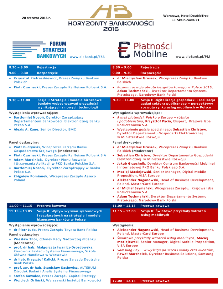 Warszawa, Hotel DoubleTree ul. Skalnicowa 21 20 czerwca 2016 r. www.aleBank.pl/PM www.aleBank.pl/FSB 8.30 – 9.00 Rejestracja 8.30 – 9.00 Rejestracja 9.00 – 9.30 Rozpoczęcie 9.00 – 9.30 Rozpoczęcie Krzysztof Pietraszkiewicz, Prezes Związku Banków Polskich dr Mieczysław Groszek, Wiceprezes Związku Banków Polskich Piotr Czarnecki, Prezes Zarządu Raiffeisen Polbank S.A. Poziom rozwoju obrotu bezgotówkowego w Polsce 2016, Adam Tochmański, Dyrektor Departamentu Systemu Płatniczego, Narodowy Bank Polski 9.30 – 11.00 Sesja I: Strategie i modele biznesowe banków wobec wyzwań przyszłości wynikających z nowych technologii 9.30 – 11.00 Sesja I: Digitalizacja gospodarki i realizacja zadań sektora publicznego – perspektywy rozwoju rynku usług mobilnych w Polsce Wystąpienia wprowadzające: Bartłomiej Nocoń, Dyrektor Zarządzający Departamentem Bankowości Elektronicznej Banku Pekao S.A. Alexis A. Kane, Senior Director, EMC Wystąpienia wprowadzające: Rynek płatności. Polska a Europa – różnice i podobieństwa, Krzysztof Pycia, Ekspert, Krajowa Izba Rozliczeniowa S.A. Wystąpienie gościa specjalnego: Sebastian Christow, Dyrektor Departamentu Gospodarki Elektronicznej w Ministerstwie Rozwoju Panel dyskusyjny: Piotr Puczyński, Wiceprezes Zarządu Banku Gospodarstwa Krajowego (Moderator) Piotr Czarnecki, Prezes Zarządu Raiffeisen Polbank S.A Adam Marciniak, Dyrektor Pionu Rozwoju i Utrzymania Aplikacji w PKO Banku Polskim S.A. Bartłomiej Nocoń, Dyrektor Zarządzający w Banku Pekao S.A. Zbigniew Pomianek, Wiceprezes Zarządu Asseco Poland Panel dyskusyjny dr Mieczysław Groszek, Wiceprezes Związku Banków Polskich (Moderator) Sebastian Christow, Dyrektor Departamentu Gospodarki Elektronicznej w Ministerstwie Rozwoju Jakub Grzechnik, Dyrektor Centrum Bankowości Mobilnej i Internetowej PKO Banku Polskiego S.A. Maciej Maciejewski, Senior Manager, Digital Mobile Proposition, VISA Europe Aleksander Naganowski, Head of Business Development, Poland, MasterCard Europe dr Michał Szymański, Wiceprezes Zarządu, Krajowa Izba Rozliczeniowa S.A. Adam Tochmański, Dyrektor Departamentu Systemu Płatniczego, Narodowy Bank Polski 11.00 – 11.15 Przerwa kawowa 11.00 – 11.15 Przerwa kawowa 11.15 – 13.05 Sesja II: Wpływ wyzwań systemowych i regulacyjnych na strategie i modele biznesowe banków w Polsce 11.15 – 12.00 Sesja II: Światowe przykłady wdrożeń usług mobilnych Wystąpienie wprowadzające: dr Piotr Juda, Prezes Zarządu Toyota Bank Polska Panel dyskusyjny: Wiesław Thor, członek Rady Nadzorczej mBanku (Moderator) prof. dr hab. Małgorzata Iwanicz-Drozdowska, Kierownik Zakładu Systemu Finansowego, Szkoła Główna Handlowa w Warszawie dr hab. Krzysztof Kalicki, Prezes Zarządu Deutsche Bank Polska prof. zw. dr hab. Stanisław Kasiewicz, ALTERUM Ośrodek Badań i Analiz Systemu Finansowego Stefan Kawalec, Prezes Zarządu Capital Strategy Wojciech Orliński, Warszawski Instytut Bankowości Wystąpienia: Aleksander Naganowski, Head of Business Development, Poland, MasterCard Europe Światowe przykłady wdrożeń usług mobilnych , Maciej Maciejewski, Senior Manager, Digital Mobile Proposition, VISA Europe Samsung Pay – w wyścigu po serca i wolny czas klientów, Paweł Marchelek, Dyrektor Business Solutions, Samsung Polska 12.00 – 12.15 Przerwa kawowa 13.05 – 14.15 Sesja III: Strategiczne wyzwania sprzedażowe – ewolucja modeli biznesowych banków w perspektywie 5-10-15 lat 12.15 – 13.50 Sesja III: Biznesowy model usług płatniczych Wystąpienie wprowadzające: prof. Rafał Ohme – prof. nadzwyczajny Uniwersytetu SWPS, prof. wizytujący na uniwersytetach w Renmin w Pekinie oraz Stellenbosch w Kapsztadzie. Członek Rady Nadzorczej Neuromarketing Science and Business Association, ekspert w dziedzinie neuromarketingu Wystąpienia wprowadzające: Wojciech Pantkowski, Dyrektor Zarządzający Banku Pekao S.A Grzegorz Długosz, Prezes Zarządu Polskich Standardów Płatności dr Michał Polasik, Uniwersytet Mikołaja Kopernika w Toruniu Panel dyskusyjny: dr Zbigniew R. Wierzbicki, Wiceprezes Zarządu CRM Finance Sp. z o.o. (Moderator) Tomasz Frączek, Prezes Zarządu Mondial Asistance Andrzej Ratuszny, Dyrektor ds. Wsparcia Biznesu Zrzeszeniowego, SGB-Bank S.A. Rafał Szmuc, Członek Zarządu Santander Consumer Bank S.A. Feliks Szyszkowiak, Członek Zarządu Banku Zachodniego WBK S.A. Panel dyskusyjny: Andrzej Kawiński, Country Manager Giesecke&Devrient (Moderator) Grzegorz Długosz, Prezes Zarządu Polskich Standardów Płatności Wojciech Pantkowski, Dyrektor Zarządzający Banku Pekao S.A dr Michał Polasik, Uniwersytet Mikołaja Kopernika w Toruniu Paweł Widawski, Dyrektor Zespołu Systemów Płatniczych i Bankowości Elektronicznej, Związek Banków Polskich 13.50 – 14.00 Podsumowanie konferencji 14.00 – 15.00 Lunch 14.15 – 15.00 Lunch 15.00 – 17.00 Gala rankingu „50 największych banków w Polsce 201 6” „Miesięcznika Finansowego BANK” Wręczenie: Medale Mikołaja Kopernika Związku Banków Polskich Nagrody Dziennikarskie im. Mariana Krzaka Nagrody Konkursu „Etyka w Finansach – Nagroda Robina Cosgrove” za najlepszy esej Ranking „50 największych banków w Polsce 2016″ „Miesięcznika Finansowego BANK” DEBATA HORYZONTÓW: „BANKOWOŚĆ WOBEC WYZWAŃ ROZWOJOWYCH” www.aleBank.pl/HB