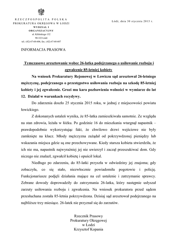 RZECZPOSPOLITA POLSKA PROKURATURA OKRĘGOWA W ŁODZI Łódź, dnia 30 stycznia 2015 r. WYDZIAŁ I ORGANIZACYJNY ul. Kilińskiego 152 90-322 Łódź tel.: (42) 67-68-606, fax.: (42) 67-68-607 INFORMACJA PRASOWA Tymczasowe aresztowanie wobec 26-latka podejrzanego o usiłowanie rozboju i zgwałcenie 85-letniej kobiety Na wniosek Prokuratury Rejonowej w Łowiczu sąd aresztował 26-letniego mężczyznę, podejrzanego o przestępstwo usiłowania rozboju na szkodę 85-letniej kobiety i jej zgwałcenie. Grozi mu kara pozbawienia wolności w wymiarze do lat 12. Działał w warunkach recydywy. Do zdarzenia doszło 25 stycznia 2015 roku, w jednej z miejscowości powiatu łowickiego. Z dokonanych ustaleń wynika, że 85-latka zamieszkiwała samotnie. Ze względu na stan zdrowia, leżała w łóżku. Po godzinie 16 do mieszkania wtargnął napastnik – prawdopodobnie wykorzystując fakt, że chwilowo drzwi wejściowe nie były zamknięte na klucz. Młody mężczyzna zażądał od pokrzywdzonej pieniędzy lub wskazania miejsca gdzie są one przechowywane. Kiedy starsza kobieta stwierdziła, że ich nie ma, napastnik najwyraźniej jej nie uwierzył i zaczął przeszukiwać dom. Gdy niczego nie znalazł, zgwałcił kobietę i opuścił lokal. Niedługo po zdarzeniu, do 85-latki przyszła w odwiedziny jej znajoma; gdy zobaczyła, co się stało, niezwłocznie powiadomiła pogotowie i policję. Funkcjonariusze podjęli działania mające na cel ustalenie i zatrzymanie sprawcy. Zebrane dowody doprowadziły do zatrzymania 26-latka, który następnie usłyszał zarzuty usiłowania rozboju i zgwałcenia. Na wniosek prokuratora przed sądem przesłuchana została 85-letnia pokrzywdzona. Dzisiaj sąd aresztował podejrzanego na najbliższe trzy miesiące. 26-latek nie przyznał się do zarzutów. Rzecznik Prasowy Prokuratury Okręgowej w Łodzi Krzysztof Kopania
