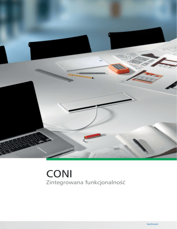 CONI Zintegrowana funkcjonalność bachmann FACILITY SYSTEM CONI / Listwy zasilające CONI zapewnia elastyczność. Na przykład w salach konferencyjnych i szkoleniowych. CONI ułatwia dostęp do zasilania, mediów i sieci wprost na biurku lub stole. Minimalna głębokość montażu zapewnia swobodę dla nóg. Ponadto szeroki zakres możliwości wykończenia powierzchni daje pełną swobodę w projektowaniu wystroju wnętrza. Gdy nie jest używany, moduł CONI zlicowany jest z blatem stołu, czy biurka. Gdy tylko potrzebny jest dostęp do zasilania sieci, czy innych mediów po prostu wystarczy otworzyć pokrywę, by uzyskać dostęp do wymaganych gniazd. Zintegrowana osłona szczotkowa zabezpiecza przewody przez poplątaniem. Konfiguracja połączeń i gniazd jest również bardzo elastyczna. Listwy zasilające mogą być wymieniane w każdym czasie, bez konieczności używania narzędzi. Zintegrowana funkcjonalność i elastyczność - nie tylko na dziś, ale również w przyszłości. Korzyści na • Zlicowanie z blatem biurka pierwszy • Minimalna głębokość zabudowy/montażu rzut oka • Zintegrowana osłona szczotkowa • Swobodna i elastyczna konfiguracja (moduły indywidualne dostępne na str.46) • Wyposażenie listwy może być zamieniane • Możliwe wykończenie fornirem CONI zapewnia nieograniczony dostęp do zasilania, mediów i sieci. Dzięki zintegrowanej wkładce ze szczotką pokrywa może być zamknięta bez obaw, że podłączone kable zostaną zgniecione lub splątane. bachmann FACILITY SYSTEM CONI / Listwy zasilające CONI Listwy zasilające, krótkie i długie wersje Ramki do zabudowy CONI dostępne są w wersji krótkiej oraz długiej. Głębokość zabudowy to 56 mm , dopasowane do blatów o grubości min. 10 mm. Szczotki mogą być z łatwością zamieniane na inne kolory, bez konieczności użycia narzędzi. Nr art. Srebrno-szara · Srebrno-szara podobna do RAL9006 CONI krótka 338.0204 Antracyt · Antracyt CONI krótka 338.0214 CONI krótka Satynowa biel Czarny · Czarny RAL9005 CONI krótka 911.004 bachmann Stal nierdzewna · Hartowana stal CONI długa 911.005 Czarny · Czarny RAL9005 CONI długa 911.003 Satynowa biel · Satynowa biel RAL9010 CONI krótka 911.002 Chrom-błyszczący · Satynowa biel RAL9010 CONI długa 911.001 Chrom-błyszczący · Chrom-błyszczący CONI długa 338.0227 · Chrom-błyszczący 911.000 Antracyt · Antracyt CONI długa 338.0206 Srebrno-szara · Srebrno-szara podobna do RAL9006 CONI długa 338.0205 CONI wbudowana rama długa Zewnętrzne wymiary: 387 x 151 mm Wbudowane wymiary: 375 x 139 mm Wersja CONI krótka 338.0203 CONI wbudowana rama krótka Zewnętrzne wymiary : 248 x 151 mm Wbudowane wymiary: 237 x 139 mm Stal nierdzewna · Hartowana stal SYSTEMY BIUROWE CONFERENCE CONI / Wspornik / Einbaurahmen CONI wspornik · Do montażu listew CONI bez listew zasilających, mogą być zainstalowane pod blatem w korytkach kablowych. Do montażu wymagane są standardowe śruby. Nr art. Wersja CONI wspornik wysoki 918.002 · Czarny; 2 szt. w opakowaniu, listwa zasilająca: 74 mm · Odległość między gniazdkiem a dnem: 30 mm od dna do górnej krawędzi CONI Holder · · · · Dla opcjonalnego montażu w listwie zasilającej Coni (wersja krótka i długa) Umożliwia składowanie nadmiaru długości kabla w czasie podłączenia Łatwy montaż - wystarczy wpiąć do ramki, montaż za pomocą dostarczanych nitów Mała, dodatkowo wbudowana głębokość ok. 20 mm w uzupełnieniu do głębokości ramy montażowej Nr art. Wersja CONI Holder 911.910 911.913 · wersja dla listwy zasilającej Coni, krótkiej · wersja dla listwy zasilającej Coni, długiej CONI Szczotki Nr art. Wersja CONI szczotki krótkie 911.900 · Czerwony 911.901 · Niebieski 911.902 · Biały 911.903 · Żółty 911.904 · Czarny CONI szczotki długie 911.905 · Czerwony 911.906 · Niebieski 911.907 · Biały 911.908 · Żółty 911.909 · Czarny bachmann FACILITY SYSTEM CONI DUO / Listwy zasilające CONI DUO jest idealnym rozwiązaniem do wąskich stołów konferencyjnych i biurek. CONI DUO pozwala na prosty i szybki dostęp do gniazd zasilania, mediów i połączeń sieciowych instalowanych na stole z obu jego stron. Ponadto rozwiązanie to nie zmniejsza przestrzeni na nogi pod stołem. Gdy gniazda nie są używane, CONI DUO jest całkowicie zlicowane z powierzchnią stołu. Gdy potrzebujesz dostępu do zasilania, sieci, lub mediów po prostu podnieś jedną z dwóch klapek, podłącz się do potrzebnego gniazda i zamknij klapkę. Szczotkowa osłona zabezpiecza przewody przed splątaniem. Zachowany jest również harmonijny wygląd gładkiego stołu. Konfiguracja podłączeń sieciowych w CONI DUO jest elastyczna. (patrz rozdz. Moduły Indywidualne str. 50). Listwa zasilająca również może być zamieniona w dowolnym momencie, bez konieczności używania narzędzi. Zintegrowana funkcjonalność i maksymalna elastyczność nie tylko dziś, ale również w przyszłości. Korzyści na • Dostęp z dwóch przeciwnych stron pierwszy • Wystarczy tylko jedno wycięcie w blacie rzut oka • Klapka zlicowana z powierzchnią stołu • Minimalna głębokość zabudowy, wytrzymała ramka • Zintegrowana szczotkowa osłona z możlowością zamknięcia klapki, nawet przy podłączonych przewodach bachmann CONI DUO Podwójna funkcjonalność bachmann CONI / CONI DUO / FACILITY SYSTEM Listwy zasilające CONI DUO, krótka i długa wersja Nazwa mówi za siebie: CONI twin pack. Stworzone specjalnie z myślą o małych stołach i biurkach, które mają podłączenie do zasilania i sieci poprzeciwnych stronach. CONI DUO ramka do zabudowy krótka 6-krotna: 2 x 3-krotna Zewnętrzny wymiar ok.: 505 x 151 mm CONI DUO ramka do zabudowy długa 12-krotna: 2 x 6-krotna Zewnętrzny wymiar ok.: 782 x 151 mm Nr art. NOWOŚĆ Wersja CONI DUO Srebrno-szary, podobny do RAL9006 6-modułowa, krótka 911.026 · Wymiary ok. 505 x 151 mm 12-modułowa, długa 911.025 NOWOŚĆ · Wymiary ok. 782 x 151 m