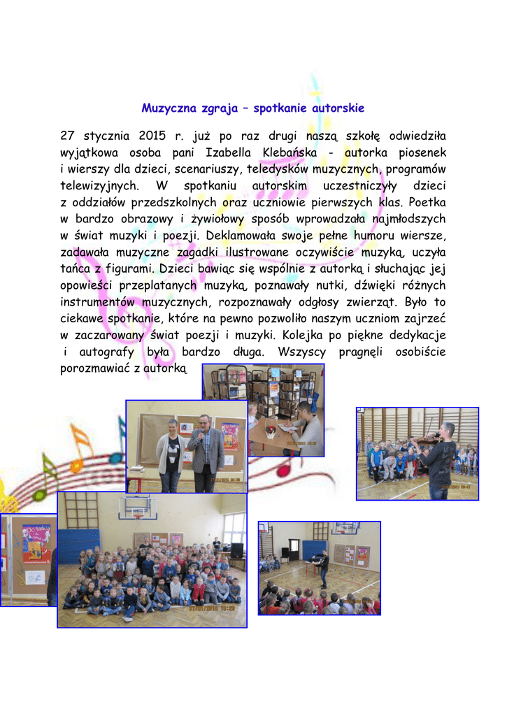 Muzyczna zgraja – spotkanie autorskie 27 stycznia 2015 r. już po raz drugi naszą szkołę odwiedziła wyjątkowa osoba pani Izabella Klebańska - autorka piosenek i wierszy dla dzieci, scenariuszy, teledysków muzycznych, programów telewizyjnych. W spotkaniu autorskim uczestniczyły dzieci z oddziałów przedszkolnych oraz uczniowie pierwszych klas. Poetka w bardzo obrazowy i żywiołowy sposób wprowadzała najmłodszych w świat muzyki i poezji. Deklamowała swoje pełne humoru wiersze, zadawała muzyczne zagadki ilustrowane oczywiście muzyką, uczyła tańca z figurami. Dzieci bawiąc się wspólnie z autorką i słuchając jej opowieści przeplatanych muzyką, poznawały nutki, dźwięki różnych instrumentów muzycznych, rozpoznawały odgłosy zwierząt. Było to ciekawe spotkanie, które na pewno pozwoliło naszym uczniom zajrzeć w zaczarowany świat poezji i muzyki. Kolejka po piękne dedykacje i autografy była bardzo długa. Wszyscy pragnęli osobiście porozmawiać z autorką