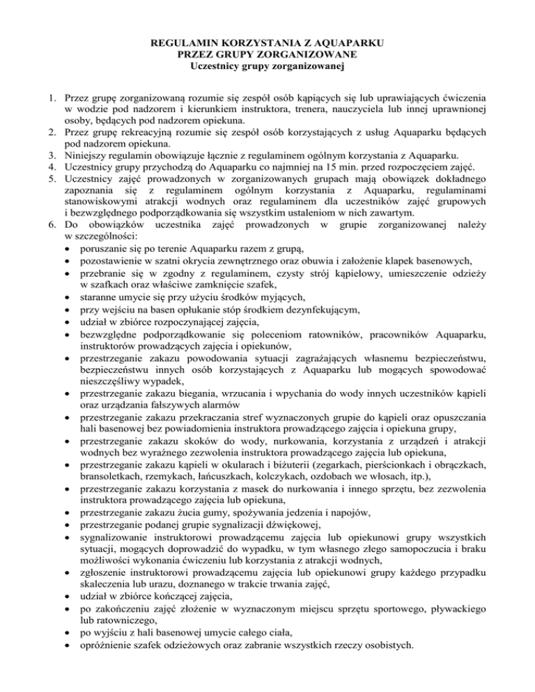 REGULAMIN KORZYSTANIA Z AQUAPARKU PRZEZ GRUPY ZORGANIZOWANE Uczestnicy grupy zorganizowanej 1. Przez grupę zorganizowaną rozumie się zespół osób kąpiących się lub uprawiających ćwiczenia w wodzie pod nadzorem i kierunkiem instruktora, trenera, nauczyciela lub innej uprawnionej osoby, będących pod nadzorem opiekuna. 2. Przez grupę rekreacyjną rozumie się zespół osób korzystających z usług Aquaparku będących pod nadzorem opiekuna. 3. Niniejszy regulamin obowiązuje łącznie z regulaminem ogólnym korzystania z Aquaparku. 4. Uczestnicy grupy przychodzą do Aquaparku co najmniej na 15 min. przed rozpoczęciem zajęć. 5. Uczestnicy zajęć prowadzonych w zorganizowanych grupach mają obowiązek dokładnego zapoznania się z regulaminem ogólnym korzystania z Aquaparku, regulaminami stanowiskowymi atrakcji wodnych oraz regulaminem dla uczestników zajęć grupowych i bezwzględnego podporządkowania się wszystkim ustaleniom w nich zawartym. 6. Do obowiązków uczestnika zajęć prowadzonych w grupie zorganizowanej należy w szczególności: poruszanie się po terenie Aquaparku razem z grupą, pozostawienie w szatni okrycia zewnętrznego oraz obuwia i założenie klapek basenowych, przebranie się w zgodny z regulaminem, czysty strój kąpielowy, umieszczenie odzieży w szafkach oraz właściwe zamknięcie szafek, staranne umycie się przy użyciu środków myjących, przy wejściu na basen opłukanie stóp środkiem dezynfekującym, udział w zbiórce rozpoczynającej zajęcia, bezwzględne podporządkowanie się poleceniom ratowników, pracowników Aquaparku, instruktorów prowadzących zajęcia i opiekunów, przestrzeganie zakazu powodowania sytuacji zagrażających własnemu bezpieczeństwu, bezpieczeństwu innych osób korzystających z Aquaparku lub mogących spowodować nieszczęśliwy wypadek, przestrzeganie zakazu biegania, wrzucania i wpychania do wody innych uczestników kąpieli oraz urządzania fałszywych alarmów przestrzeganie zakazu przekraczania stref wyznaczonych grupie do kąpieli oraz opuszczania hali basenowej bez powiadomienia instruktora prowadzącego zajęcia i opiekuna grupy, przestrzeganie zakazu skoków do wody, nurkowania, korzystania z urządzeń i atrakcji wodnych bez wyraźnego zezwolenia instruktora prowadzącego zajęcia lub opiekuna, przestrzeganie zakazu kąpieli w okularach i biżuterii (zegarkach, pierścionkach i obrączkach, bransoletkach, rzemykach, łańcuszkach, kolczykach, ozdobach we włosach, itp.), przestrzeganie zakazu korzystania z masek do nurkowania i innego sprzętu, bez zezwolenia instruktora prowadzącego zajęcia lub opiekuna, przestrzeganie zakazu żucia gumy, spożywania jedzenia i napojów, przestrzeganie podanej grupie sygnalizacji dźwiękowej, sygnalizowanie instruktorowi prowadzącemu zajęcia lub opiekunowi grupy wszystkich sytuacji, mogących doprowadzić do wypadku, w tym własnego złego samopoczucia i braku możliwości wykonania ćwiczeniu lub korzystania z atrakcji wodnych, zgłoszenie instruktorowi prowadzącemu zajęcia lub opiekunowi grupy każdego przypadku skaleczenia lub urazu, doznanego w trakcie trwania zajęć, udział w zbiórce kończącej zajęcia, po zakończeniu zajęć złożenie w wyznaczonym miejscu sprzętu sportowego, pływackiego lub ratowniczego, po wyjściu z hali basenowej umycie całego ciała, opróżnienie szafek odzieżowych oraz zabranie wszystkich rzeczy osobistych.