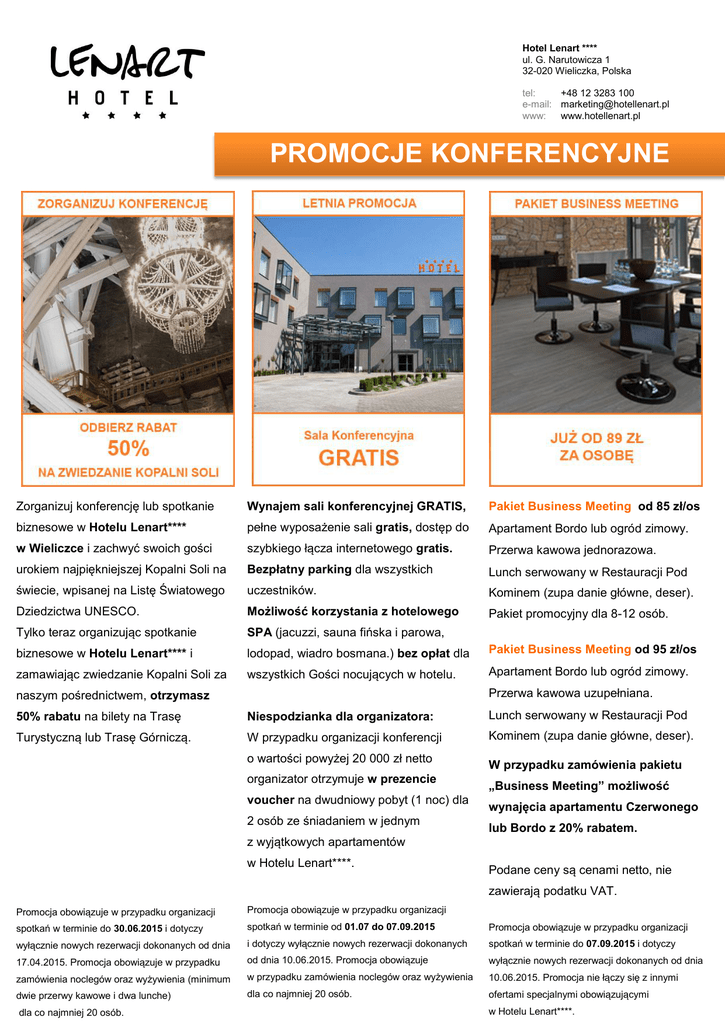 Hotel Lenart **** ul. G. Narutowicza 1 32-020 Wieliczka, Polska tel: +48 12 3283 100 e-mail: [email protected] www: www.hotellenart.pl PROMOCJE KONFERENCYJNE Zorganizuj konferencję lub spotkanie Wynajem sali konferencyjnej GRATIS, Pakiet Business Meeting od 85 zł/os biznesowe w Hotelu Lenart**** pełne wyposażenie sali gratis, dostęp do Apartament Bordo lub ogród zimowy. w Wieliczce i zachwyć swoich gości szybkiego łącza internetowego gratis. Przerwa kawowa jednorazowa. urokiem najpiękniejszej Kopalni Soli na Bezpłatny parking dla wszystkich Lunch serwowany w Restauracji Pod świecie, wpisanej na Listę Światowego uczestników. Kominem (zupa danie główne, deser). Dziedzictwa UNESCO. Możliwość korzystania z hotelowego Pakiet promocyjny dla 8-12 osób. Tylko teraz organizując spotkanie SPA (jacuzzi, sauna fińska i parowa, biznesowe w Hotelu Lenart**** i lodopad, wiadro bosmana.) bez opłat dla wszystkich Gości nocujących w hotelu. zamawiając zwiedzanie Kopalni Soli za naszym pośrednictwem, otrzymasz 50% rabatu na bilety na Trasę Niespodzianka dla organizatora: Turystyczną lub Trasę Górniczą. W przypadku organizacji konferencji Pakiet Business Meeting od 95 zł/os Apartament Bordo lub ogród zimowy. Przerwa kawowa uzupełniana. Lunch serwowany w Restauracji Pod o wartości powyżej 20 000 zł netto Kominem (zupa danie główne, deser). W przypadku zamówienia pakietu organizator otrzymuje w prezencie „Business Meeting” możliwość voucher na dwudniowy pobyt (1 noc) dla wynajęcia apartamentu Czerwonego 2 osób ze śniadaniem w jednym lub Bordo z 20% rabatem. z wyjątkowych apartamentów w Hotelu Lenart****. Podane ceny są cenami netto, nie zawierają podatku VAT. Promocja obowiązuje w przypadku organizacji Promocja obowiązuje w przypadku organizacji spotkań w terminie do 30.06.2015 i dotyczy spotkań w terminie od 01.07 do 07.09.2015 Promocja obowiązuje w przypadku organizacji wyłącznie nowych rezerwacji dokonanych od dnia i dotyczy wyłącznie nowych rezerwacji dokonanych spotkań w terminie do 07.09.2015 i dotyczy 17.04.2015. Promocja obowiązuje w przypadku od dnia 10.06.2015. Promocja obowiązuje wyłącznie nowych rezerwacji dokonanych od dnia zamówienia noclegów oraz wyżywienia (minimum w przypadku zamówienia noclegów oraz wyżywienia 10.06.2015. Promocja nie łączy się z innymi dwie przerwy kawowe i dwa lunche) dla co najmniej 20 osób. ofertami specjalnymi obowiązującymi dla co najmniej 20 osób. w Hotelu Lenart****.