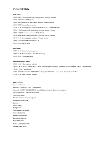 PLA IMPREZY duża scena: 14.00 – 14.15 Powitanie gości przez prowadzącego Andrzeja Potempa 14.15 – 15.45 Koncert Chrząszcze 15.45 – 16.10 Konkurs dla publiczności prowadzi Andrzej Potempa 16.10 – 17.30 Koncert Gang Marcela 17.30 - 17.50 Rozstrzygnięcie Konkursu LUKAS BANKU i VIDEOWORLD 17.50 - 18.05 Konkursy dla publiczności prowadzi Andrzej Potempa 18.05 - 18.20 Prezentacja nowości w Video Word 18.20 – 18.45 Konkursy dla publiczności prowadzi Andrzej Potempa 18.45 - 19.00 Rozstrzygnięcie konkursu "Wygraj wczasy" 19.00 – 20.15 Koncert Kabaretu Łowcy .B 20.15 - 20.30 Zakończenie mała scena: 14.00 - 16.00 Ciotka Tekla i przyjaciele 16.00 - 16.40 Dziecięcy Teatr Lalki i Aktora Gaduły 16.40 - 20.00 Program Bajaderki Dodatkowa scena / podest: 15.00 - 16.00 Pokaz kręcenia balonów 16.00 - 16.30 Pokaz zespołu NST CREW w choreografii Broadway Jazz + nauka tańca Salsa/ Szkoła Tańca NOWA 16.30 - 17.00 Pokaz karate 17.00 – 17.30 Pokaz zespołu NST CREW w choreografii HIP-HOP + nauka tańca / Szkoła Tańca NOWA 17.30 - 18.30 Pokaz kręcenia balonów POZA SCEĄ: Zabawa z klaunem Konkursy i zabawy dla dzieci z animatorkami 3 postacie MISIÓW BESKIDZKICH - przechadzajacych się wśród zaproszonych gości Sprzedaż balonów i zabawek dmuchanych Malowanie twarzy Stoisko - koszulki i kubki ze zdjęciem Gigantyczne piłkarzyki Zorbing Suchy basen Bangee run Ścianka wspinaczkowa Krowa do dojenia Bramka celnościowa Zamek do skakania Dmuchane rury Sumo lub ring bokserski Zamek Video World