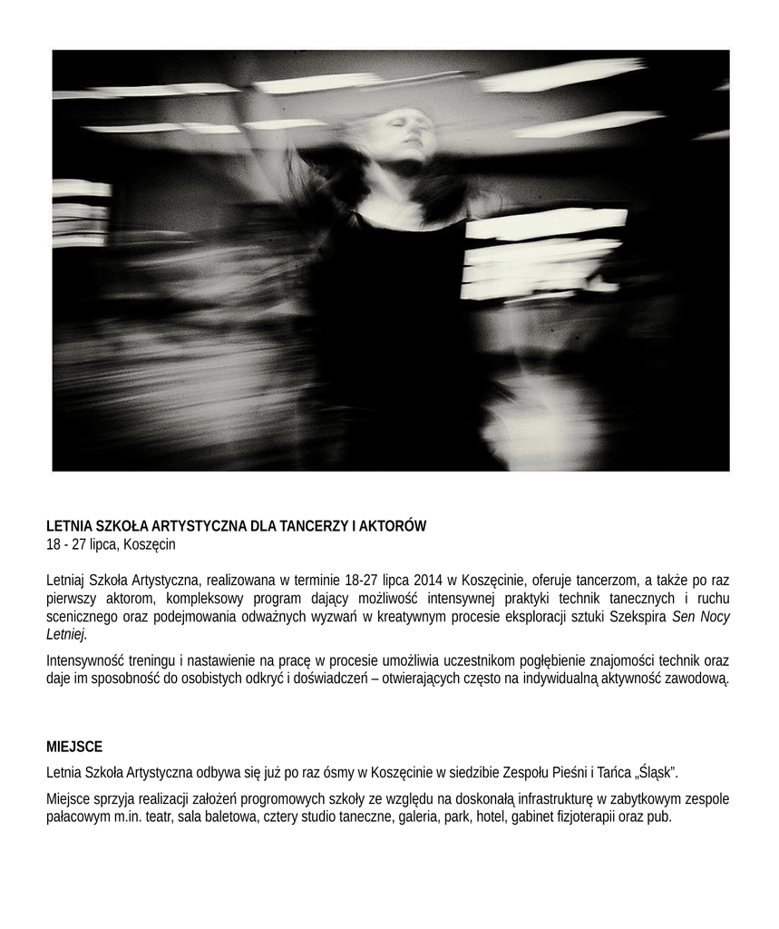 LETNIA SZKOŁA ARTYSTYCZNA DLA TANCERZY I AKTORÓW 18 - 27 lipca, Koszęcin Letniaj Szkoła Artystyczna, realizowana w terminie 18-27 lipca 2014 w Koszęcinie, oferuje tancerzom, a także po raz pierwszy aktorom, kompleksowy program dający możliwość intensywnej praktyki technik tanecznych i ruchu scenicznego oraz podejmowania odważnych wyzwań w kreatywnym procesie eksploracji sztuki Szekspira Sen Nocy Letniej. Intensywność treningu i nastawienie na pracę w procesie umożliwia uczestnikom pogłębienie znajomości technik oraz daje im sposobność do osobistych odkryć i doświadczeń – otwierających często na indywidualną aktywność zawodową. MIEJSCE Letnia Szkoła Artystyczna odbywa się już po raz ósmy w Koszęcinie w siedzibie Zespołu Pieśni i Tańca „Śląsk”. Miejsce sprzyja realizacji założeń progromowych szkoły ze względu na doskonałą infrastrukturę w zabytkowym zespole pałacowym m.in. teatr, sala baletowa, cztery studio taneczne, galeria, park, hotel, gabinet fizjoterapii oraz pub. PROGRAM DLA TANCERZY (zawodowi, poziom zaawansowany i średniozaawansowany) Intensywny program dla tancerzy obejmuje: • • • • trening technik tańca tj. Klasyka, Modern, Jazz, Improvisation z uzuepłnieniem pełnego treningu ciała tj. pilates, streching (uczestnicy będą mieli mozliwość wyboru grupy z dominującą techniką taneczną); próby i realizację choreografii w oparciu o motywy Snu Nocy Letniej W. Szekspira; prezentację wyników pracy warsztatowej w dniu 26 lipca; seminaria prowadzone przez uznanych pedagogów tańca dot. kształtowania zawodowej kariery tanecznej. PROGRAM DLA AKTORÓW (zawodowi, studenci ostatnich lat szkół aktorskich) Ruch postaci z Lianą Nyquist Program terningu skupia się wokół techniki, która umożliwia aktorowi badanie relacji pomiędzy wewnętrzym stanem psychicznym postaci, a jej zewnętrzną ekspresją fizyczną. Proponowana seria intenstywnych ćwiczeń fizycznych i praktycznych zadań aktorskich umożliwia głębsze zrozumienie relacji wewnętrznego i zewnętrznego tempa danego charakteru – rytmu, który stanowi o jego esencji emocjonalnej, a objawia się w jego fizyczności. W unikalną technikę odkrywania fizycznych i psychicznych cech postaci wprowadzi uczestników Liana Nyquist, uznany pedagog Ruchu Scenicznego z Drama Centre w Londynie. Jej 36-cio godzinny program będzie obejmował teorię i rozszerzoną pracę ruchową umożliwiającą odkrywanie fizycznego świata bohaterów ze Snu Nocy Letniej W. Szekspira, stanowiących temat przewodni warsztatów. Liana Nyquist szkoliła niektóre z największych nazwisk w brytyjskiego i światowego kina m.in.: Collin Firth, Paul Bettany, Tom Hardy, Michael Fassbender. Jako pedagog Ruchu Scenicznego na stałe współpracuje z Drama Centre w Londynie, gdzie studiowała, a następnie była asystentnką - założyciela szkoły - Yata Malmgrena przy analizie ruchu postaci wg Labanowskiej Analizy Ruchu. Liana studiowała także balet klasyczny w Royal Academy w Szwecji oraz techniki Marthy Graham w London School of Contemporary Dance. OPEN CALL DLA MŁODYCH KRYTYKÓW TAŃCA Zapraszamy młodych krytyków tańca, którzy nie ukończyli 35 roku życia, zainteresowanych obserwacją całościowego procesu edukacyjnego tancerzy oraz współuczestnictwem w kształtowaniu kreatywnej atmosfery Letniej Szkoły Artystycznej wraz z uczestnikami i pedagogami z kraju i z zagranicy. Open Call realizowany jest w celu podniesienia jakości dokumentacji waloru edukacyjnego warsztatów, jak i upowszechnienia autorskich programów pedagogów tańca i ruchu scenicznego. Wybrany uczestnik na podstawie zebranych przez siebie materiałów będzie miał za zadanie przygotowanie trzech tekstów – forma dowolna (wywiad, esej krytyczny etc.) w języku polskim, które zostaną wykorzystane do dokumentacji i upowszechniania rezultatów projektu. Osobie, która zakwalifikuje się do udziału w LSA, organizator zapewnia zapewnia zakwaterowanie i pełne wyżywienie w dn. 18 27.07.2014, a także możliwość uczestnictwa w treningach. Organizator nie zwraca kosztów podróży. Projekt dofinansowany ze środków Ministra Kultury i Dziedzictwa Narodowego Organizator Zespół Pieśni i Tańca "Śląsk" im. Stanisława Hadyny strona www: lsa.zespolslask.eu