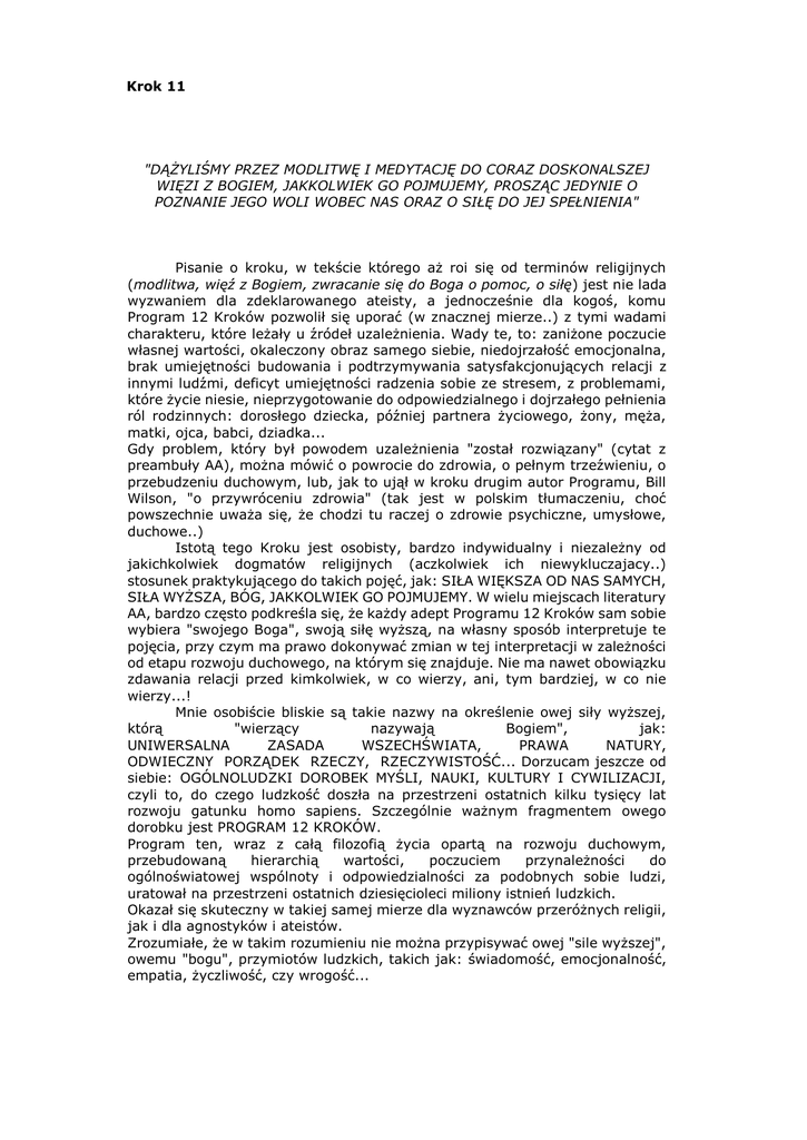Krok 11 "DĄŻYLIŚMY PRZEZ MODLITWĘ I MEDYTACJĘ DO CORAZ DOSKONALSZEJ WIĘZI Z BOGIEM, JAKKOLWIEK GO POJMUJEMY, PROSZĄC JEDYNIE O POZNANIE JEGO WOLI WOBEC NAS ORAZ O SIŁĘ DO JEJ SPEŁNIENIA" Pisanie o kroku, w tekście którego aż roi się od terminów religijnych (modlitwa, więź z Bogiem, zwracanie się do Boga o pomoc, o siłę) jest nie lada wyzwaniem dla zdeklarowanego ateisty, a jednocześnie dla kogoś, komu Program 12 Kroków pozwolił się uporać (w znacznej mierze..) z tymi wadami charakteru, które leżały u źródeł uzależnienia. Wady te, to: zaniżone poczucie własnej wartości, okaleczony obraz samego siebie, niedojrzałość emocjonalna, brak umiejętności budowania i podtrzymywania satysfakcjonujących relacji z innymi ludźmi, deficyt umiejętności radzenia sobie ze stresem, z problemami, które życie niesie, nieprzygotowanie do odpowiedzialnego i dojrzałego pełnienia ról rodzinnych: dorosłego dziecka, później partnera życiowego, żony, męża, matki, ojca, babci, dziadka... Gdy problem, który był powodem uzależnienia "został rozwiązany" (cytat z preambuły AA), można mówić o powrocie do zdrowia, o pełnym trzeźwieniu, o przebudzeniu duchowym, lub, jak to ujął w kroku drugim autor Programu, Bill Wilson, "o przywróceniu zdrowia" (tak jest w polskim tłumaczeniu, choć powszechnie uważa się, że chodzi tu raczej o zdrowie psychiczne, umysłowe, duchowe..) Istotą tego Kroku jest osobisty, bardzo indywidualny i niezależny od jakichkolwiek dogmatów religijnych (aczkolwiek ich niewykluczajacy..) stosunek praktykującego do takich pojęć, jak: SIŁA WIĘKSZA OD NAS SAMYCH, SIŁA WYŻSZA, BÓG, JAKKOLWIEK GO POJMUJEMY. W wielu miejscach literatury AA, bardzo często podkreśla się, że każdy adept Programu 12 Kroków sam sobie wybiera "swojego Boga", swoją siłę wyższą, na własny sposób interpretuje te pojęcia, przy czym ma prawo dokonywać zmian w tej interpretacji w zależności od etapu rozwoju duchowego, na którym się znajduje. Nie ma nawet obowiązku zdawania relacji przed kimkolwiek, w co wierzy, ani, tym bardziej, w co nie wierzy...! Mnie osobiście bliskie są takie nazwy na określenie owej siły wyższej, którą "wierzący nazywają Bogiem", jak: UNIWERSALNA ZASADA WSZECHŚWIATA, PRAWA NATURY, ODWIECZNY PORZĄDEK RZECZY, RZECZYWISTOŚĆ... Dorzucam jeszcze od siebie: OGÓLNOLUDZKI DOROBEK MYŚLI, NAUKI, KULTURY I CYWILIZACJI, czyli to, do czego ludzkość doszła na przestrzeni ostatnich kilku tysięcy lat rozwoju gatunku homo sapiens. Szczególnie ważnym fragmentem owego dorobku jest PROGRAM 12 KROKÓW. Program ten, wraz z całą filozofią życia opartą na rozwoju duchowym, przebudowaną hierarchią wartości, poczuciem przynależności do ogólnoświatowej wspólnoty i odpowiedzialności za podobnych sobie ludzi, uratował na przestrzeni ostatnich dziesięcioleci miliony istnień ludzkich. Okazał się skuteczny w takiej samej mierze dla wyznawców przeróżnych religii, jak i dla agnostyków i ateistów. Zrozumiałe, że w takim rozumieniu nie można przypisywać owej "sile wyższej", owemu "bogu", przymiotów ludzkich, takich jak: świadomość, emocjonalność, empatia, życzliwość, czy wrogość... Wynika z tego, że w wielkim skrócie, praktyka KROKU 11-tego oznacza dla mnie (piszę tylko i wyłącznie o sobie, o własnych przeżyciach, doświadczeniach i poglądach ) mniej więcej to: Mam dążyć do poznania prawdy. Prawdy o życiu i o śmierci. Prawdy o tym, JAK ŻYĆ? JAKICH WYBORÓW DOKONYWAĆ? USTALAĆ SOBIE CELE DO OSIĄGNIĘCIA, PRIORYTETY, HIERARCHIĘ WARTOŚCI. WCIĄŻ UCZYĆ SIĘ MIŁOŚCI, DOSKONALIĆ SIĘ W OBDAROWYWANIU NIĄ LUDZI, NIE TYLKO TYCH NAJBLIŻSZYCH, RODZINĘ I PRZYJACIÓŁ, ALE WSZYSTKICH SPOTYKANYCH NA SWOJEJ DRODZE. W miejsce słów: "poprzez modlitwę i medytację" (przez lata prób nie nauczyłem się tego, poddałem się..) wstawiam: poprzez ciągłą pracę nad własnym rozwojem duchowym iintelektualnym, poprzez systematyczne praktykowanie 12 Kroków AA, poprzez służbę ludziom potrzebującym pomocy, poprzez niesienie posłania AA, szczególnie tym najbardziej zaniedbanym, opuszczonym i pozbawionym nadziei, poprzez naprawianie relacji rodzinnych i wszystkich innych, poprzez uczciwą pracę zawodową, przyzwoite funkcjonowanie w społeczności, w której przyszło mi żyć. Z tych samych źródeł staram się czerpać siłę, by tak właśnie żyć. Mnie osobiście pomaga czytanie biografii wielkich ludzi, którzy na przestrzeni wieków torowali drogę rozwoju naszemu gatunkowi. Pomaga mi kontakt z przyrodą, zachwyt nad fenomenem samego faktu, że istnieję i wypływające stąd poczucie ogromnej wdzięczności. Fakt, że nie wierzę w tak zwane "życie pozagrobowe", nie tylko nie czyni mojej egzystencji uboższą, ale – wręcz przeciwnie – sprawia, że żyję intensywniej, pragnę czerpać z życia pełnymi garściami wiedząc, że to życie, to jedyne, jakie mam do przeżycia.. Pogodzony z faktem przemijania, świadomy nieuchronnego końca, pogodnie i z radością witam każdy nadchodzący dzień z sercem wypełnionym wdzięcznością i miłością do otaczającej mnie RZECZYWISTOŚCI, DO "WSZECHŚWIATA, KTÓRY JEST TAKI, JAKI BYĆ POWINIEN". Spróbowałem przedstawić w powyższych rozważaniach mój – i tylko mój – bardzo osobisty, indywidualny, powiedziałbym nawet intymny (!) punkt widzenia na KROK 11. Bardzo się on zmienił na przestrzeni 25 lat kontaktu z Programem. Dobrze mi z tym kierunkiem rozwoju, z odwaga bycia sobą i głoszenia poglądów, w które wierzę. Czuję się człowiekiem dojrzałym, wolnym i odpowiedzialnym za swoje życie. Aczkolwiek wciąż ograniczonym i potrzebującym wsparcia i pomocy. Piotr Domański (terapeuta uzależnień, członek Gminnej Komisji Rozwiązywania Problemów Alkoholowych w Czerwonaku)
