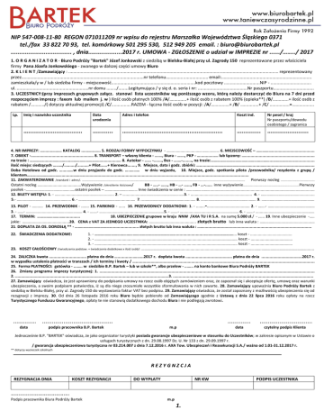 NIP 547-008-11-80 REGON 071011209 nr wpisu do rejestru Marszałka Województwa Śląskiego 0371 tel./fax 33 822 70 93, tel. komórkowy 501 295 530, 512 949 205 email. : [email protected] ................................... , dnia..……............2017 r. UMOWA - ZGŁOSZENIE o udział w IMPREZIE nr ....../……../ 2017 1. O R G A N I Z A T O R - Biuro Podróży "Bartek" Józef Jonkowski z siedzibą w Bielsku-Białej przy ul. Zagrody 150 reprezentowane przez właściciela firmy Pana Józefa Jonkowskiego - zwanego w dalszej części umowy Biuro 2. K L I E N T /Zamawiający : .......................................................................................................................................................................... reprezentowany przez...................................................................................................nr telefonu.................................. email:......................................................................... zamieszkała/y w / lub siedziba firmy - miejscowość....................................................................kod pocztowy .............................NIP - ................................. ul. ..........................................................nr domu ......../........Legitymująca / y się d. o. seria i nr: ........................................Nr paszportu................................. 3. UCZESTNICY:(przy imprezach grupowych załącz. stanowi lista uczestników wg poniższego wzoru, którą należy dostarczyć do Biura na 7 dni przed rozpoczęciem imprezy : faxem lub mailem j. w ) Ilość osób płatnych 100% /A/…...........+ ilość osób z rabatem 100% (opieka**) /B/…..........+ ilość osób z rabatem /.........../( dotyczy aktualnej promocji) /C/................RAZEM - łączna ilość osób w pozycji: /A/…............+ /B/ …............+ /C/ ................=.................. Lp. Imię i nazwisko uczestnika Data urodzenia Adres i telefon Koszt ind. Nr pesel / kraj Nr paszportu/dowodu osobistego / zagranica …............................... …......... …....................................................... …........... …..................... 4. NR IMPREZY: …........……… KATALOG ......…........ 5. RODZAJ FORMY WYPOCZYNKU - …...........................………..……… 6. MIEJSCOWOŚĆ – ……………..................................... 7. OBIEKT -...................................................... 8. TRANSPORT – własny klienta - ….…, Biura - ……., PKP - ….............… lub łączony: …............................................................ na trasie : ………….........……………..……………………….................… 8. Autokar - ..…. -......., Bus - ….…-........, na trasie:…………………………………………………...…………………................. ilość miejsc siedzących ………/…......./..........+ Pilot......+ Kierowca......., 9. Miejsce, data i godz. zbiórki: …..................…………………………........……..............................………... Doba Hotelowa od godz. …....……w dniu przyjazdu do godz. …..……… w dniu wyjazdu, 10. Miejsce, godz. spotkania pilota /przewodnika/ rezydenta z grupą / klientem……......…………………..........………............................................................................................................................................... 11. ZAKWATEROWANIE /standard i adres/. ………………………….....................……………………………………………………………………………….…………………............................................... Pierwszy nocleg ……………………...………........ Ostatni nocleg ….....................................Wyżywienie /określenie ilościowe/ BB - …..- …..., HB - …- …..., FB - …-...... inne wyżywienie………….………………………………………...............Pierwszy posiłek -…….........………………………...…ostatni posiłek – ….…....………………… Inne świadczenia w cenie : ……………………............................................................................................... 12. BILETY WSTĘPU: 1. - …….................………..……................ 2. – …................…….………....……………..…3. - ........................................................ 4. - ………………………..…..…............... 5.- ….........……………………….….……… 6. - …..……….…………………..…..........…. 7. …..……..….…………………….…....…. 8. ….......……..….…………………….……. 9. …..……..….…...………………….……. 13. PILOT - .......... 14. PRZEWODNIK - ....... 15. PARKINGI - ...... 16. PRZEWODNICY DODATKOWI: 1. - ........-....................................... 2. - …….- ……..................………………… 3. - ……- …........................……………………… 4. - …….- …...........……..........................……………5. - …….- …...........……..........................……… 6. - …….- …...........……..........................……… 17. TERMIN: ………………………............. 18. UBEZPIECZENIE grupowe w kraju NNW /AXA TU i R S.A. na sumę 5.000 zł./ - .….. 19. Inne ubezpieczenie -….. jakie: …........................................20. CENA z VAT ZA JEDNEGO UCZESTNIKA: ........................................... złotych brutto lub inna waluta : ……………….......….....................… 21. DOPŁATA ZA OS. DOROSŁĄ ** - ……....……..……………......................... złotych brutto lub inna waluta : …….............................................................................................