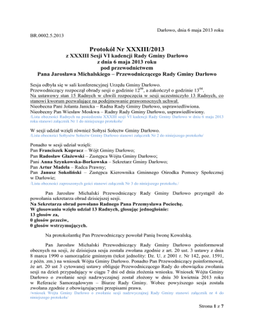 Darłowo, dnia 6 maja 2013 roku BR.0002.5.2013 Protokół Nr XXXIII/2013 z XXXIII Sesji VI kadencji Rady Gminy Darłowo z dnia 6 maja 2013 roku pod przewodnictwem Pana Jarosława Michalskiego – Przewodniczącego Rady Gminy Darłowo Sesja odbyła się w sali konferencyjnej Urzędu Gminy Darłowo. Przewodniczący rozpoczął obrady sesji o godzinie 1200, a zakończył o godzinie 1304. Na ustawowy stan 15 Radnych w chwili rozpoczęcia w sesji uczestniczyło 13 Radnych, co stanowi kworum pozwalające na podejmowanie prawomocnych uchwał. Nieobecna Pani Jolanta Janicka – Radna Rady Gminy Darłowo, usprawiedliwiona. Nieobecny Pan Wiesław Moskwa – Radny Rady Gminy Darłowo, usprawiedliwiony. /Lista obecności Radnych na posiedzeniu XXXIII sesji VI kadencji Rady Gminy Darłowo w dniu 6 maja 2013 roku stanowi załącznik Nr 1 do niniejszego protokołu/ W sesji udział wzięli również Sołtysi Sołectw Gminy Darłowo. /Lista obecności Sołtysów Sołectw Gminy Darłowo stanowi załącznik Nr 2 do niniejszego protokołu/ Ponadto w sesji udział wzięli: Pan Franciszek Kupracz – Wójt Gminy Darłowo; Pan Radosław Głażewski – Zastępca Wójta Gminy Darłowo; Pani Anna Szynkowska-Borkowska – Sekretarz Gminy Darłowo; Pan Artur Madeła – Radca Prawny; Pan Janusz Sokoliński – Zastępca Kierownika Gminnego Ośrodka Pomocy Społecznej w Darłowie; /Lista obecności zaproszonych gości stanowi załącznik Nr 3 do niniejszego protokołu./ . Pan Jarosław Michalski Przewodniczący Rady Gminy Darłowo przystąpił do powołania sekretarza obrad dzisiejszej sesji. Na Sekretarza obrad powołano Radnego Pana Przemysława Pociechę. W głosowaniu wzięło udział 13 Radnych, głosując jednogłośnie: 13 głosów za, 0 głosów przeciw, 0 głosów wstrzymujących. Na protokolantkę Pan Przewodniczący powołał Panią Iwonę Kowalską. Pan Jarosław Michalski Przewodniczący Rady Gminy Darłowo poinformował obecnych na sesji, że dzisiejsza sesja została zwołana zgodnie z art. 20 ust. 3 ustawy z dnia 8 marca 1990 o samorządzie gminnym (tekst jednolity: Dz. U. z 2001 r. Nr 142, poz. 1591, z późn. zm.) na wniosek Wójta Gminy Darłowo. Ponadto Pan Przewodniczący poinformował, że art. 20 ust 3 cytowanej ustawy obliguje Przewodniczącego Rady do obowiązku zwołania sesji na dzień przypadający w ciągu 7 dni od dnia złożenia wniosku. Wniosek Wójta Gminy Darłowo o zwołanie sesji nadzwyczajnej został złożony w dniu 30 kwietnia 2013 roku w Referacie Samorządowym – Biurze Rady Gminy. Wobec powyższego sesja została zwołana zgodnie z obowiązującymi przepisami prawa. /wniosek Wójta Gminy Darłowo o zwołanie sesji nadzwyczajnej Rady Gminy stanowi załącznik nr 4 do niniejszego protokołu/ Strona 1 z 7 Pan Jarosław Michalski Przewodniczący Rady Gminy Darłowo poinformował obecnych Radnych i Sołtysów o tym, że w dniu 10 maja o godzinie 1430 w sali konferencyjno-bankietowej w Urzędzie Gminy Darłowo odbędzie się spotkanie z przedstawicielami Darłowskiego Centrum Wolontariatu w sprawie naboru wniosków w ramach konkursu grantowego. Wszyscy zainteresowani zostali serdecznie zaproszeni. Ad. 1.2. Pan Jarosław Michalski Przewodniczący Rady Gminy Darłowo przystąpił do ustalenia porządku obrad, przy czym przypomniał, że proponowany porządek obrad wszyscy Radni otrzymali wraz z zawiadomieniem na dzisiejszą sesję. Pan Jarosław Michalski Przewodniczący Rady Gminy Darłowo przypomniał obecnym że jest to sesja zwołana w trybie nadzwyczajnym, na wniosek, wobec czego dodatkowym warunkiem dokonania zmiany w porządku obrad jest przede wszystkim zgoda wnioskodawcy na tę zmianę. Pan Jarosław Michalski Przewodniczący Rady Gminy Darłowo zgłosił wniosek o zmianę porządku obrad poprzez dodanie punktu w sprawie rozpatrzenia uchwały w sprawie skargi na bezczynności Wójta Gminy Darłowo, oraz dodanie punktu w sprawie informacji Wójta Gminy Darłowo o przygotowaniu do sezonu letniego 2013 roku. Pan Jarosław Michalski Przewodniczący Rady Gminy Darłowo zapytał czy Pan Wójt jako wnioskodawca sesji wyraża zgodę na tę zmianę. Pan Franciszek Kupracz Wójt Gminy Darłowo odpowiedział, że wyraża zgodę. Wobec tego Pan Jarosław Michalski Przewodniczący Rady Gminy Darłowo poddał wniosek pod głosowanie Rady. W głosowaniu nad przyjęciem wniosku Pana Jarosława Michalskiego udział wzięło 13 Radnych Rady Gminy Darłowo głosując jednogłośnie: 13 głosów za, 0 głosów przeciw, 0 głosów wstrzymujących. Na podstawie wyniku głosowania Pana Jarosław Michalski Przewodniczący Rady Gminy Darłowo oznajmił, że wniosek został przyjęty jednogłośnie. Następnie Pan Jarosław Michalski Przewodniczący Rady Gminy Darłowo przedstawił porządek obrad po zmianach. 1. Otwarcie obrad. 1.1. Stwierdzenie kworum. 1.2. Ustalenie porządku obrad. 2. Rozpatrzenie uchwały w sprawie wezwania Pana Bartosza Olczykowskiego zam. Dąbki, do usunięcia naruszenia prawa. Druk Nr 1/2013XXXIII 3. Rozpatrzenie uchwały w sprawie zamiany nieruchomości gruntowej stanowiącej własność Gminy Darłowo na nieruchomość gruntową stanowiącą własność osoby fizycznej. (dot. zamiany działki nr 348, działki nr 349, działki nr 350/1 położonych w obrębie Słowino, na działkę zabudowaną nr 400 położonej w obrębie SłowinoSłowinko) Druk Nr 2/2013XXXIII 4. Rozpatrzenie uchwały w sprawie zmian w budżecie Gminy Darłowo na 2013 rok. Druk Nr 3/2013XXXIII 5. Rozpatrzenie uchwały w sprawie rozpatrzenia skargi na bezczynność Wójta Gminy Darłowo. Druk Nr 4/2013XXXIII 6. Informacja Wójta Gminy Darłowo o przygotowaniu do sezonu letniego 2013 roku. 7. Zamknięcie obrad. Strona 2 z 7 Wobec powyższego Pan Jarosław Michalski Przewodniczący Rady Gminy Darłowo poddał pod głosowanie porządek obrad. W głosowaniu udział wzięło 13 Radnych Rady Gminy Darłowo głosując jednogłośnie: 13 głosów za przyjęciem porządku obrad sesji, 0 głosów przeciw, 0 głos