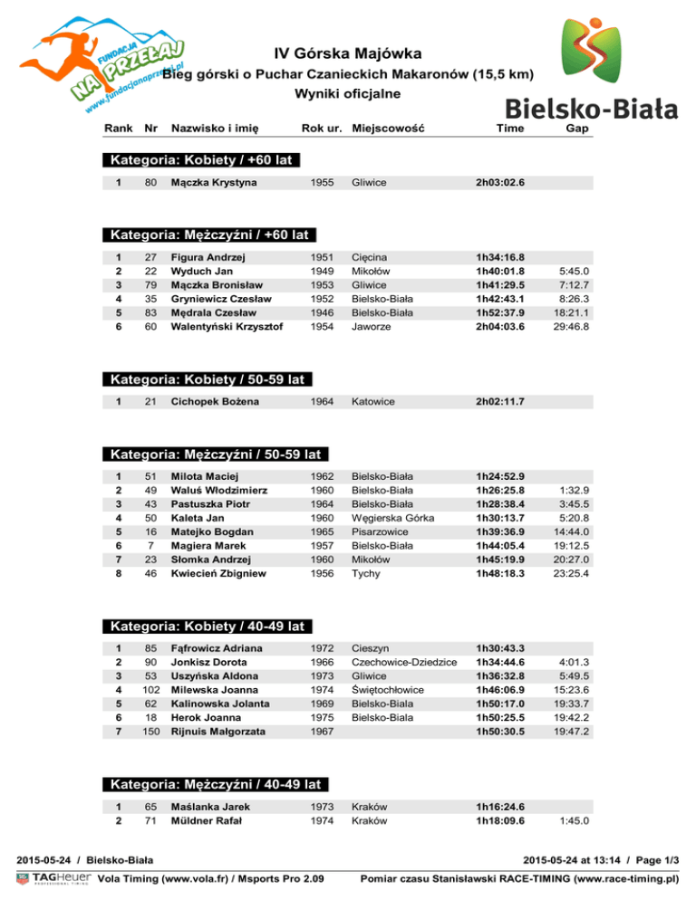 IV Górska Majówka Bieg górski o Puchar Czanieckich Makaronów (15,5 km) Wyniki oficjalne Rank Nr Nazwisko i imię Rok ur. Miejscowość Time Gap Kategoria: Kobiety / +60 lat 1 80 Mączka Krystyna 1955 Gliwice 2h03:02.6 1951 1949 1953 1952 1946 1954 Cięcina Mikołów Gliwice Bielsko-Biała Bielsko-Biała Jaworze 1h34:16.8 1h40:01.8 1h41:29.5 1h42:43.1 1h52:37.9 2h04:03.6 1964 Katowice 2h02:11.7 1962 1960 1964 1960 1965 1957 1960 1956 Bielsko-Biała Bielsko-Biała Bielsko-Biała Węgierska Górka Pisarzowice Bielsko-Biała Mikołów Tychy 1h24:52.9 1h26:25.8 1h28:38.4 1h30:13.7 1h39:36.9 1h44:05.4 1h45:19.9 1h48:18.3 1:32.9 3:45.5 5:20.8 14:44.0 19:12.5 20:27.0 23:25.4 1972 1966 1973 1974 1969 1975 1967 Cieszyn Czechowice-Dziedzice Gliwice Świętochłowice Bielsko-Biala Bielsko-Biala 1h30:43.3 1h34:44.6 1h36:32.8 1h46:06.9 1h50:17.0 1h50:25.5 1h50:30.5 4:01.3 5:49.5 15:23.6 19:33.7 19:42.2 19:47.2 Kraków Kraków 1h16:24.6 1h18:09.6 1:45.0 Kategoria: Mężczyźni / +60 lat 1 2 3 4 5 6 27 22 79 35 83 60 Figura Andrzej Wyduch Jan Mączka Bronisław Gryniewicz Czesław Mędrala Czesław Walentyński Krzysztof 5:45.0 7:12.7 8:26.3 18:21.1 29:46.8 Kategoria: Kobiety / 50-59 lat 1 21 Cichopek Bożena Kategoria: Mężczyźni / 50-59 lat 1 2 3 4 5 6 7 8 51 49 43 50 16 7 23 46 Milota Maciej Waluś Włodzimierz Pastuszka Piotr Kaleta Jan Matejko Bogdan Magiera Marek Słomka Andrzej Kwiecień Zbigniew Kategoria: Kobiety / 40-49 lat 1 2 3 4 5 6 7 85 90 53 102 62 18 150 Fąfrowicz Adriana Jonkisz Dorota Uszyńska Aldona Milewska Joanna Kalinowska Jolanta Herok Joanna Rijnuis Małgorzata Kategoria: Mężczyźni / 40-49 lat 1 2 65 71 Maślanka Jarek Müldner Rafał 1973 1974 2015-05-24 / Bielsko-Biała Vola Timing (www.vola.fr) / Msports Pro 2.09 2015-05-24 at 13:14 / Page 1/3 VolaSoftControlPdf Pomiar czasu Stanisławski RACE-TIMING (www.race-timing.pl) IV Górska Majówka Bieg górski o Puchar Czanieckich Makaronów (15,5 km) Wyniki oficjalne Rank Nr 3 4 5 6 7 8 9 10 11 12 13 14 15 16 17 103 40 39 86 93 57 48 24 12 2 92 14 20 54 75 Nazwisko i imię Rok ur. Miejscowość Nowaczyk Arkadiusz Kania Krzysztof Gaik Maciej Suchy Piotr Koźmin Arkadiusz Nowak Robert Wołoszyn Ryszard Jendrysik Bogdan Doczekalski Jarosław Krzempek Krzysztof Łojewski Michał Witas Jacek Bojda Grzegorz Pieślak Romuald Gibas Słwomir Time Gap 1973 1973 1975 1975 1975 1973 1966 1966 1971 1973 1973 1975 1974 1969 1968 Chorzów Bielsko-Biała Bujaków Jaworze Bielsko-Biała Mikołów Bielsko-Biała Zabrze Jastrzębie-Zdrój Bielsko-Biała Bielsko-Biała Bielsko-Biała Brenna Bielsko-Biała Biała Podlaska 1h21:14.8 1h24:45.8 1h26:31.5 1h28:36.7 1h28:50.3 1h28:51.9 1h30:25.6 1h30:26.4 1h30:39.7 1h33:06.8 1h33:53.6 1h36:25.5 1h37:12.7 1h37:53.1 2h02:25.5 4:50.2 8:21.2 10:06.9 12:12.1 12:25.7 12:27.3 14:01.0 14:01.8 14:15.1 16:42.2 17:29.0 20:00.9 20:48.1 21:28.5 46:00.9 1982 1976 1978 1980 1976 1978 1978 1982 1978 1979 Tychy Katowice Bielsko-Biała Bielsko-Biała Gliwice Bielsko-Biała Pszczyna Katowice Katowice Gliwice 1h22:39.8 1h28:18.5 1h39:59.2 1h43:27.3 1h44:22.8 1h46:43.1 1h47:30.1 1h49:30.1 1h50:12.1 2h28:19.8 5:38.7 17:19.4 20:47.5 21:43.0 24:03.3 24:50.3 26:50.3 27:32.3 1h05:40.0 Jastrzębie Zdrój Bielsko-Biała Mnich Wieliczka Lublin Jaworzno Oświęcim Mnich Bielsko-Biała Katowice Bielsko-Biała Bielsko-Biała Leńcze Tychy Bielsko-Biała Bielsko-Biała Bielsko-Biała Dąbrowa Górnicza Siemianowice Śląskie 1h07:44.9 1h11:38.9 1h12:35.0 1h12:50.2 1h13:18.1 1h13:31.4 1h14:29.0 1h16:05.3 1h17:35.2 1h19:44.8 1h21:27.0 1h22:19.8 1h22:24.2 1h25:40.7 1h26:06.2 1h26:11.7 1h27:42.8 1h28:32.7 1h28:53.2 3:54.0 4:50.1 5:05.3 5:33.2 5:46.5 6:44.1 8:20.4 9:50.3 11:59.9 13:42.1 14:34.9 14:39.3 17:55.8 18:21.3 18:26.8 19:57.9 20:47.8 21:08.3 Kategoria: Kobiety / 30-39 lat 1 2 3 4 5 6 7 8 9 10 26 67 6 70 74 32 95 56 4 77 Długosz Agata Janowska Magdalena Zamarska Małgorzata Czapla Marzena Jędrzejowska-Dec Anna Panek Ela Reinert Aleksandra Pasieka Paulina Wąsikowska Małgorzata Skubis Barbara Kategoria: Mężczyźni / 30-39 lat 1 2 3 4 5 6 7 8 9 10 11 12 13 14 15 16 17 18 19 44 42 87 28 33 17 38 91 66 55 96 58 45 37 84 19 13 88 25 Szulik Grzegorz Wróblewski Jan Krupa Przemysław Marek Dariusz Mocior Tomasz Jachymczyk Norbert Pokrzyk Zbigniew Miśkiewicz Mariusz Matecki Tomasz Pasieka Przemysław Pierwocha Tomasz Dyduch Piotr Chotowicki Bartłomiej Wolek Szymon Pukło Piotr Kamiński Marek Streit Dawid Petrus Łukasz Dembecki Marcin 1981 1980 1983 1985 1984 1978 1976 1981 1980 1980 1978 1976 1978 1983 1980 1982 1985 1980 1978 2015-05-24 / Bielsko-Biała Vola Timing (www.vola.fr) / Msports Pro 2.09 2015-05-24 at 13:14 / Page 2/3 VolaSoftControlPdf Pomiar czasu Stanisławski RACE-TIMING (www.race-timing.pl) IV Górska Majówka Bieg górski o Puchar Czanieckich Makaronów (15,5 km) Wyniki oficjalne Rank Nr 20 21 22 23 24 25 26 27 28 29 30 149 82 64 59 101 34 41 36 5 76 98 Nazwisko i imię Rok ur. Miejscowość Kolanko Robert Stodolak Maciej Pawlusiak Grzegorz Dziszkiewicz Grzegorz Duraj Grzegorz Kocełak Piotr Kamiński Bartosz Duda Tomasz Żółtak Marcin Wira Krystian Krzemień Adrian Time Gap 1977 1977 1977 1982 1980 1978 1979 1985 1978 1979 1976 Żywiec Gliwice Bielsko-Biała Bielsko Biała Bielsko-Biała Tychy Nysa Tychy Bielsko-Biała Czechowice-Dziedzice Jaworze 1h33:34.5 1h37:08.8 1h38:11.2 1h39:05.0 1h42:43.5 1h43:25.8 1h48:20.4 1h49:04.6 1h53:39.5 1h55:43.5 1h56:17.6 25:49.6 29:23.9 30:26.3 31:20.1 34:58.6 35:40.9 40:35.5 41:19.7 45:54.6 47:58.6 48:32.7 1993 1993 1986 1987 1988 Przytkowice Bielsko-Biała Czechowice-Dziedzice Dąbrowa Górnicza Ćwiklice 1h26:58.8 1h45:04.5 1h55:43.4 1h56:10.8 1h58:14.7 18:05.7 28:44.6 29:12.0 31:15.9 Bieruń Przytkowice Czechowice-Dziedzice Kozy Tychy Katowice Kraków Ustroń/ustronianka Przytkowice Przytkowice Bielsko-Biała Chybie Bystra Dąbrowa Górnicza Chybie Sosnowiec Bielsko-Biała Bytom Sosnowiec Bielsko-Biała 1h10:08.4 1h11:29.4 1h13:23.3 1h14:29.7 1h14:30.3 1h14:55.6 1h14:5