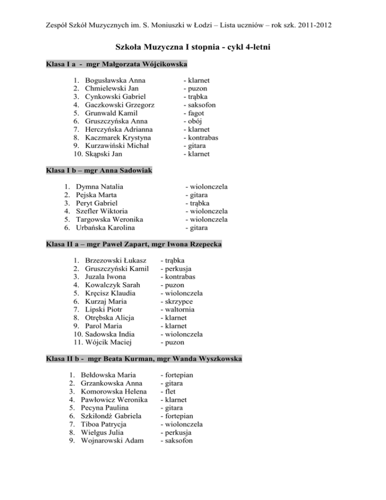 Zespół Szkół Muzycznych im. S. Moniuszki w Łodzi – Lista uczniów – rok szk. 2011-2012 Szkoła Muzyczna I stopnia - cykl 4-letni Klasa I a - mgr Małgorzata Wójcikowska 1. Bogusławska Anna 2. Chmielewski Jan 3. Cynkowski Gabriel 4. Gaczkowski Grzegorz 5. Grunwald Kamil 6. Gruszczyńska Anna 7. Herczyńska Adrianna 8. Kaczmarek Krystyna 9. Kurzawiński Michał 10. Skąpski Jan - klarnet - puzon - trąbka - saksofon - fagot - obój - klarnet - kontrabas - gitara - klarnet Klasa I b – mgr Anna Sadowiak 1. 2. 3. 4. 5. 6. Dymna Natalia Pejska Marta Peryt Gabriel Szefler Wiktoria Targowska Weronika Urbańska Karolina - wiolonczela - gitara - trąbka - wiolonczela - wiolonczela - gitara Klasa II a – mgr Paweł Zapart, mgr Iwona Rzepecka 1. Brzezowski Łukasz 2. Gruszczyński Kamil 3. Juzala Iwona 4. Kowalczyk Sarah 5. Kręcisz Klaudia 6. Kurzaj Maria 7. Lipski Piotr 8. Otrębska Alicja 9. Parol Maria 10. Sadowska India 11. Wójcik Maciej - trąbka - perkusja - kontrabas - puzon - wiolonczela - skrzypce - waltornia - klarnet - klarnet - wiolonczela - puzon Klasa II b - mgr Beata Kurman, mgr Wanda Wyszkowska 1. 2. 3. 4. 5. 6. 7. 8. 9. Bełdowska Maria Grzankowska Anna Komorowska Helena Pawłowicz Weronika Pecyna Paulina Szkiłondź Gabriela Tiboa Patrycja Wielgus Julia Wojnarowski Adam - fortepian - gitara - flet - klarnet - gitara - fortepian - wiolonczela - perkusja - saksofon Zespół Szkół Muzycznych im. S. Moniuszki w Łodzi – Lista uczniów – rok szk. 2011-2012 Klasa III - mgr Paweł Zapart, mgr Wanda Wyszkowska 1. 2. 3. 4. 5. 6. 7. 8. 9. Bednarek Paulina Kucemba Michał Maciejczyk Aleksandra Malczak Emilia Mzyk Kornelia Pejski Michał Tarasiewicz Anna Włodarczyk Mateusz Kosztowny Natalia - wiolonczela - gitara - wiolonczela - wiolonczela - wiolonczela - gitara - kontrabas - fortepian - skrzypce Klasa IV - mgr Paweł Zapart 1. 2. 3. 4. 5. 6. 7. 8. Głowacki Mateusz Kulesza Weronika Lewandowska Justyna Lisiecka Karina Marjański Paweł Marjański Piotr Malinowski Grzegorz Tomczak Zuzanna - puzon - gitara - gitara - akordeon - saksofon - gitara - gitara - gitara
