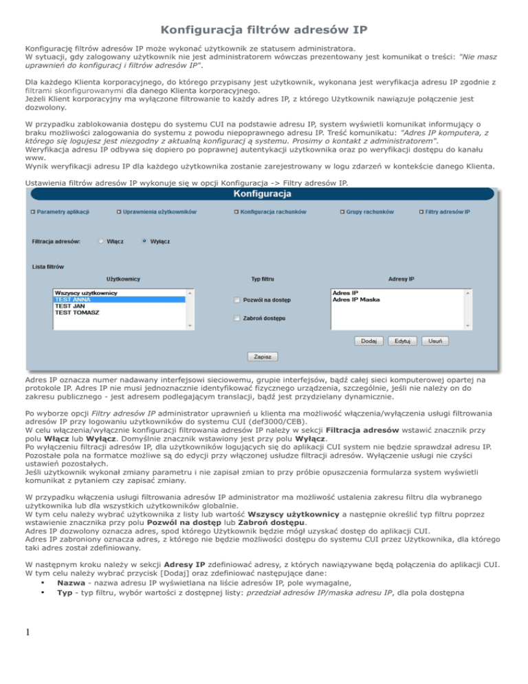 Konfiguracja filtrów adresów IP Konfigurację filtrów adresów IP może wykonać użytkownik ze statusem administratora. W sytuacji, gdy zalogowany użytkownik nie jest administratorem wówczas prezentowany jest komunikat o treści: "Nie masz uprawnień do konfiguracj i filtrów adresów IP". Dla każdego Klienta korporacyjnego, do którego przypisany jest użytkownik, wykonana jest weryfikacja adresu IP zgodnie z filtrami skonfigurowanymi dla danego Klienta korporacyjnego. Jeżeli Klient korporacyjny ma wyłączone filtrowanie to każdy adres IP, z którego Użytkownik nawiązuje połączenie jest dozwolony. W przypadku zablokowania dostępu do systemu CUI na podstawie adresu IP, system wyświetli komunikat informujący o braku możliwości zalogowania do systemu z powodu niepoprawnego adresu IP. Treść komunikatu: "Adres IP komputera, z którego się logujesz jest niezgodny z aktualną konfiguracj ą systemu. Prosimy o kontakt z administratorem". Weryfikacja adresu IP odbywa się dopiero po poprawnej autentykacji użytkownika oraz po weryfikacji dostępu do kanału www. Wynik weryfikacji adresu IP dla każdego użytkownika zostanie zarejestrowany w logu zdarzeń w kontekście danego Klienta. Ustawienia filtrów adresów IP wykonuje się w opcji Konfiguracja -> Filtry adresów IP. Adres IP oznacza numer nadawany interfejsowi sieciowemu, grupie interfejsów, bądź całej sieci komputerowej opartej na protokole IP. Adres IP nie musi jednoznacznie identyfikować fizycznego urządzenia, szczególnie, jeśli nie należy on do zakresu publicznego - jest adresem podlegającym translacji, bądź jest przydzielany dynamicznie. Po wyborze opcji Filtry adresów IP administrator uprawnień u klienta ma możliwość włączenia/wyłączenia usługi filtrowania adresów IP przy logowaniu użytkowników do systemu CUI (def3000/CEB). W celu włączenia/wyłącznie konfiguracji filtrowania adresów IP należy w sekcji Filtracja adresów wstawić znacznik przy polu Włącz lub Wyłącz. Domyślnie znacznik wstawiony jest przy polu Wyłącz. Po wyłączeniu filtracji adresów IP, dla użytkowników logujących się do aplikacji CUI system nie będzie sprawdzał adresu IP. Pozostałe pola na formatce możliwe są do edycji przy włączonej usłudze filtracji adresów. Wyłączenie usługi nie czyści ustawień pozostałych. Jeśli użytkownik wykonał zmiany parametru i nie zapisał zmian to przy próbie opuszczenia formularza system wyświetli komunikat z pytaniem czy zapisać zmiany. W przypadku włączenia usługi filtrowania adresów IP administrator ma możliwość ustalenia zakresu filtru dla wybranego użytkownika lub dla wszystkich użytkowników globalnie. W tym celu należy wybrać użytkownika z listy lub wartość Wszyscy użytkownicy a następnie określić typ filtru poprzez wstawienie znacznika przy polu Pozwól na dostęp lub Zabroń dostępu. Adres IP dozwolony oznacza adres, spod którego Użytkownik będzie mógł uzyskać dostęp do aplikacji CUI. Adres IP zabroniony oznacza adres, z którego nie będzie możliwości dostępu do systemu CUI przez Użytkownika, dla którego taki adres został zdefiniowany. W następnym kroku należy w sekcji Adresy IP zdefiniować adresy, z których nawiązywane będą połączenia do aplikacji CUI. W tym celu należy wybrać przycisk [Dodaj] oraz zdefiniować następujące dane: • Nazwa - nazwa adresu IP wyświetlana na liście adresów IP, pole wymagalne, • Typ - typ filtru, wybór wartości z dostępnej listy: przedział adresów IP/maska adresu IP, dla pola dostępna 1 jest ikonka z podpowiedzią o następującej treści: • Adres IP od do - pola prezentowane po wyborze filtru: przedział adresów IP, należy podać w polach odpowiednie wartości dla adresu IP, pola wymagane, • Maska adresu IP - pole prezentowane po wyborze filtru: maska adresu IP, pole wymagane, dla pola należy zdefiniować adres IP z wykorzystaniem znaków: o "*" - oznaczający dowolny ciąg cyfr w adresie IP, o "$" - oznaczający jedną dowolną cyfrę w adresie IP. Po zdefiniowaniu danych dla nowego adresu IP należy wybrać przycisk [Zapisz]. Zostanie zaprezentowana formatka potwierdzająca dodanie adresu IP. W celu wykonania edycji filtru adresu IP należy zaznaczyć wybrany filtr adresu IP oraz wybrać przycisk [Edycja]. Następnie należy zmodyfikować dane oraz zatwierdzić poprzez przycisk [Zapisz]. Po poprawnej akcji modyfikacji adresu IP zostanie zaprezentowany komunikat o treści: "Zmodyfikowano adres IP". 2 W celu usunięcia zdefiniowanego filtru adresu IP należy zaznaczyć wybrany filtr adresu IP oraz wybrać przycisk [Usuń]. Operacja usunięcia wskazanego filtru adresu IP wymaga potwierdzenia. Po poprawnej akcji usunięcia filtru adresu IP prezentowany jest stosowny komunikat o treści ''Usunięto adres IP''. W sekcji Typ filtru administrator ma możliwość wyboru typu filtru Pozwól na dostęp/Zabroń dostępu dla użytkownika/wszystkich użytkowników. Wartość domyślna - brak znacznika. Ustawienie znacznika oznacza włączenie filtru indywidualnego. Jeśli po wybraniu użytkownika z listy lub pola Wszyscy użytkownicy zmieniono Typ filtru i użytkownik próbuje wybrać innego użytkownika z listy lub opuścić formularz to system wyświetli komunikat czy zapisać zmiany. W przypadku, gdy lista adresów IP jest pusta na formatce konfiguracji filtrowania IP zablokowana jest możliwość wyboru wartości w polu Typ filtru dla konfiguracji wybranego użytkownika. W takiej sytuacji checkboxy Pozwól na dostęp i Zabroń dostępu są nieaktywne. Po dodaniu co najmniej jednego adresu IP checkboxy stają się aktywne. W przypadku aktywnego typu filtrowania Pozwól na dostęp lub Zabroń dostępu dla konfiguracji użytkownika usunięcie ostatniego adresu IP z listy skutkuje automatyczną dezaktywacją konfiguracji użytkownika w bazie tj. pole Typ filtru nie ma zdefiniowanej wartości (co jest równoznaczne z nieaktywną indywidualną konfiguracją filtrow