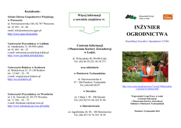 Kształcenie: Szkoła Główna Gospodarstwa Wiejskiego w Warszawie ul. Nowoursynowska 166, 02-787 Warszawa tel. 22 593 - 10 - 00 email: [email protected] http://www.sggw.pl/uczelnia Więcej informacji o zawodzie znajdziesz w: INŻYNIER OGRODNICTWA Klasyfikacji Zawodów i Specjalności 213204 Uniwersytet Przyrodniczy w Lublinie ul. Akademicka 13, 20-950 Lublin tel. 81 445 - 66 - 22 e-mail: [email protected] http://www.up.lublin.pl/kandydaci/ Centrum Informacji i Planowania Kariery Zawodowej: w Łodzi: ul. Wólczańska 49, 90-608 Łódź, Tel. (42) 66 30 255, 66 30 273 Uniwersytet Rolniczy w Krakowie ul. Mickiewicza 21, 31-120 Kraków tel.: 12 662 - 52 - 70 e-mail: [email protected] http://wo.ur.krakow.pl/ oraz oddziałach: w Piotrkowie Trybunalskim: ul. Starowarszawska 4, 97 - 300 Piotrków Trybunalski Tel. (44) 649 60 87 http://www.uwm.edu.pl/egu/news/7/czytaj/790/prawdziw y-inzynier-to-kobieta.html w Sieradzu: Uniwersytet Przyrodniczy we Wrocławiu ul. C.K. Norwida 25, 50-375 Wrocław tel. 71 320 – 10 – 75 e-mail: [email protected] http://www.rekrutacja.up.wroc.pl/studia/ ul. 3 Maja 7, 98 - 200 Sieradz Tel. (43) 822 81 84, 822 81 86 Wojewódzki Urząd Pracy w Łodzi Centrum Informacji i Planowania Kariery Zawodowej Oddział w Piotrkowie Trybunalskim w Skierniewicach: ul. Jagiellońska 28, 96 - 100 Skierniewice Tel. (46) 833 39 74, 833 36 50 Piotrków Trybunalski 2014 Inżynier ogrodnictwa organizuje i nadzoruje produkcję ogrodniczą w przedsiębiorstwach i zakładach zajmujących się tą dziedziną oraz buduje, pielęgnuje i konserwuje tereny zieleni. Prowadzi też badania naukowe, opracowuje nowe technologie i hodowlę roślin ogrodniczych oraz prowadzi doradztwo, prace projektowe i rzeczoznawstwo w zakresie ogrodnictwa w określonych specjalnościach. Zadania zawodowe: - kierowanie gospodarstwem ogrodniczym, w tym także sadowniczym i warzywniczym; - sprawowanie kontroli nad pracą innych osób zatrudnionych przy produkcji roślinnej; określanie obowiązków podległych pracowników zatrudnionych przy produkcji roślinnej: dokonywanie oceny zagrożeń dla zdrowotności podległych mu plantacji owoców, warzyw i sadzonek; - określanie wielkości powstałych szkód, a także zaproponowanie sposobów ich usunięcia; - przeprowadzanie szkoleń BHP wśród podległych pracowników oraz zaznajamianie ich z nowymi urządzeniami i zasadami dotyczącymi ich użytkowania; - dokonywanie inspekcji doglądając przebiegu różnych akcji, wizytując nowe pola uprawne i doświadczalne itp.; - wykonywanie pomiarów i zestawień oraz posługiwanie się specjalistycznym sprzętem badawczym; opracowywanie nowych technologii w hodowli roślin ogrodniczych oraz prowadzenie doradztwa w zakresie ogrodnictwa o określonych specjalnościach. Warunki podjęcia pracy w zawodzie: W zawodzie inżyniera ogrodnictwa można pracować po ukończeniu studiów wyższych na uczelni przygotowującej specjalistów do pracy w sektorze ogrodnictwa. Inżynier ogrodnictwa może również podjąć prace naukową na uczelni wyższej na kierunku ogrodnictwo bądź rolnictwo. Wymagania psychofizyczne: Inżynier ogrodnictwa część swojej pracy wykonuje w terenie - wyjazdy do podległych mu szkółek i gospodarstw, co wymaga ogólnie dobrego stanu zdrowia oraz odporności na zmienne warunki pogodowe. Niezależnie od pory roku, musi on być zdolny do wizytowania prowadzonych prac polowych mając na uwadze jednocześnie dostrzeganie i eliminację ewentualnych zagrożeń. Na stanowisku inżyniera ogrodnika na pewno przydatne będą umiejętności organizacyjne. Oprócz tego zdolności manualne (większość czasu to praca rąk), a także dobry wzrok i słuch (praca przy odpowiednich maszynach i pojazdach). Na tym stanowisku potrzebne są także umiejętności interpersonalne, gdyż z jednej strony współpracuje w grupie gdzie sam jest kierownikiem i zarządza personelem, a z drugiej występuje praca samodzielna, gdzie niejednokrotnie musi podjąć ważne decyzje pod presją czasu. Organizując pracę innych sam powinien wykazywać się łatwością nawiązywania kontaktów z innymi oraz wykazywać się umiejętnością postępowania z nimi i przekazywania informacji w jasny i zrozumiały sposób. Przeciwwskazania do wykonywania zawodu: Jako przeciwwskazania należałoby wymienić różnego rodzaju alergie a także ciężkie wady wzroku uniemożliwiające pracę przy komputerze. Możliwości i szanse zatrudnienia: Inżynier ogrodnictwa może być zatrudniony np. w Ośrodkach Doradztwa Rolniczego, gdzie wykonuje zadania służbowe przewidziane dla urzędników administracji państwowej w zakresie nadzoru nad gospodarstwami sadowniczymi i uprawami warzyw w gospodarstwach należących do prywatnych właścicieli. Płace: Rynkowe zarobki na stanowisku inżynier ogrodnictwa zawierają się w przedziale od 2300 PLN do 3000 PLN. (źródło: www.moja-pensja.pl – dostępna 14.10.2014r.)