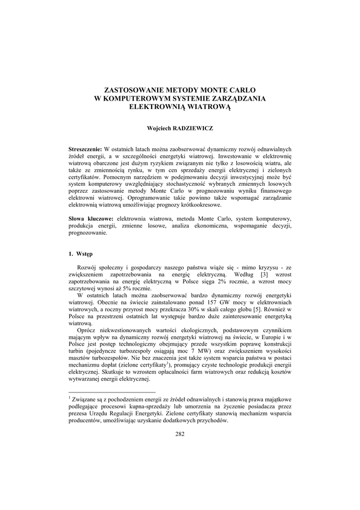 ZASTOSOWANIE METODY MONTE CARLO W KOMPUTEROWYM SYSTEMIE ZARZĄDZANIA ELEKTROWNIĄ WIATROWĄ Wojciech RADZIEWICZ Streszczenie: W ostatnich latach moŜna zaobserwować dynamiczny rozwój odnawialnych źródeł energii, a w szczególności energetyki wiatrowej. Inwestowanie w elektrownię wiatrową obarczone jest duŜym ryzykiem związanym nie tylko z losowością wiatru, ale takŜe ze zmiennością rynku, w tym cen sprzedaŜy energii elektrycznej i zielonych certyfikatów. Pomocnym narzędziem w podejmowaniu decyzji inwestycyjnej moŜe być system komputerowy uwzględniający stochastyczność wybranych zmiennych losowych poprzez zastosowanie metody Monte Carlo w prognozowaniu wyniku finansowego elektrowni wiatrowej. Oprogramowanie takie powinno takŜe wspomagać zarządzanie elektrownią wiatrową umoŜliwiając prognozy krótkookresowe. Słowa kluczowe: elektrownia wiatrowa, metoda Monte Carlo, system komputerowy, produkcja energii, zmienne losowe, analiza ekonomiczna, wspomaganie decyzji, prognozowanie. 1. Wstęp Rozwój społeczny i gospodarczy naszego państwa wiąŜe się - mimo kryzysu - ze zwiększeniem zapotrzebowania na energię elektryczną. Według [3] wzrost zapotrzebowania na energię elektryczną w Polsce sięga 2% rocznie, a wzrost mocy szczytowej wynosi aŜ 5% rocznie. W ostatnich latach moŜna zaobserwować bardzo dynamiczny rozwój energetyki wiatrowej. Obecnie na świecie zainstalowano ponad 157 GW mocy w elektrowniach wiatrowych, a roczny przyrost mocy przekracza 30% w skali całego globu [5]. RównieŜ w Polsce na przestrzeni ostatnich lat występuje bardzo duŜe zainteresowanie energetyką wiatrową. Oprócz niekwestionowanych wartości ekologicznych, podstawowym czynnikiem mającym wpływ na dynamiczny rozwój energetyki wiatrowej na świecie, w Europie i w Polsce jest postęp technologiczny obejmujący przede wszystkim poprawę konstrukcji turbin (pojedyncze turbozespoły osiągają moc 7 MW) oraz zwiększeniem wysokości masztów turbozespołów. Nie bez znaczenia jest takŜe system wsparcia państwa w postaci mechanizmu dopłat (zielone certyfikaty1), promujący czyste technologie produkcji energii elektrycznej. Skutkuje to wzrostem opłacalności farm wiatrowych oraz redukcją kosztów wytwarzanej energii elektrycznej. 1 Związane są z pochodzeniem energii ze źródeł odnawialnych i stanowią prawa majątkowe podlegające procesowi kupna-sprzedaŜy lub umorzenia na Ŝyczenie posiadacza przez prezesa Urzędu Regulacji Energetyki. Zielone certyfikaty stanowią mechanizm wsparcia producentów, umoŜliwiając uzyskanie dodatkowych przychodów. 282 Jednak budowa nowych źródeł wiatrowych w gospodarce rynkowej obarczona jest duŜym ryzykiem inwestycyjnym. Pomiary prędkości wiatru są niewystarczające do jednoznacznego określenia optymalnej lokalizacji farmy wiatrowej. DuŜe znaczenie mają takŜe inne czynniki nie związane z wiatrem, a określające ekonomiczne powodzenie inwestycji. NaleŜą do nich między innymi: koszty kapitałowe podczas realizacji inwestycji, koszty eksploatacji ze szczególnym uwzględnieniem awarii i przestojów oraz ceny sprzedaŜy energii elektrycznej i zielonych certyfikatów [9]. Pomocnym narzędziem dla wspomagania decyzji dotyczącej wyboru optymalnej lokalizacji dla elektrowni wiatrowej oraz jej eksploatacji moŜe być system komputerowy do analizy ekonomicznej i wspomagania zarządzania elektrownią wiatrową, uwzględniający losowość istotnych parametrów, mających wpływ na opłacalność inwestycji, dzięki zastosowaniu metody Monte Carlo. 2. System komputerowy do analizy ekonomicznej elektrowni wiatrowej Ze względu na stochastyczność wiatru inwestowanie w energetykę wiatrową obarczone jest duŜym ryzykiem [10]. Zmienność cen sprzedaŜy energii eklektycznej na rynku oraz zmienność cen zielonych certyfikatów utrudnia oszacowanie potencjalnych przychodów w elektrowni wiatrowej. PowyŜsze zmusza inwestorów do wykorzystywania narzędzi w postaci systemów komputerowych do analizy ekonomicznej. Istnieją systemy komercyjne wspomagające funkcjonowanie elektrowni wiatrowej, ale ich koszty są wysokie. Ponadto są to najczęściej realizacje obce, które nie zawsze dostosowane są do polskich przepisów i regulacji prawnych [9]. Autor opracował narzędzie w postaci programu komputerowego Farma Wiatrowa 2.5, który umoŜliwia przeprowadzanie wielokryterialnych badań symulacyjnych funkcjonowania elektrowni wiatrowej w otoczeniu rynkowym. Oprogramowanie to wspomaga takŜe eksploatację elektrowni wiatrowej poprzez wykorzystanie modułu prognozowania. Moduł kalkulacyjny systemu komputerowego Farma Wiatrowa 2.5 przedstawia rys. 1 [11]. Rys. 1. Moduł kalkulacyjny autorskiego systemu komputerowego Farma Wiatrowa 2.5 [11] 283 W celu przeprowadzenia badan symulacyjnych z wykorzystaniem programu Farma Wiatrowa 2.5 ustalono parametry wejściowe. System posiada 46 zmiennych stanu, z których najistotniejsze przedstawiono w tabeli 1. Tab. 1. Parametry wejściowe dla potrzeb symulacji wyniku finansowego elektrowni wiatrowej. Opracowanie własne na podstawie [1, 6, 12, 13, 7, 4] Parametr Jedn. Wartość Turbozespół szt. 15 Moc zainstalowana Sprawność elektryczna turbozespołu Powierzchnia objęta wirnikiem MW 30 % 44,00 m² 5027,00 Średnioroczna prędkość wiatru m/s 6,25 % 2,00 Koszty inwestycyjne mln PLN 165,00 Koszt podłączenia do systemu elektroenergetycznego mln PLN 16,50 PLN 4,0587 Udział środków własnych % 20,00 Dotacje % 0,00 Wysokość oprocentowania kredytu inwestycyjnego % 8,00 mln PLN 0,12 mln PLN 5,81 3,52% całości projektu rocznie mln PLN 3,30 2% całości projektu rocznie PLN/ MWh 197,21 PLN/ MWh 250,03 Współczynnik strat Kurs euro Koszty zatrudnienia Koszty administracyjne, media, ubezpieczenie, pozostałe podatki Naprawy, remonty, części zamienne Średnia cena sprzedaŜy energii elektrycznej na rynku konkurencyjnym Średnioroczny kurs jednolity zielonych certyfikatów na TGE 2 Uwagi Producen