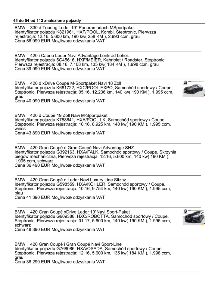 45 do 54 od 113 znaleziono pojazdy BMW 330 d Touring Leder 19" Panoramadach MSportpaket Identyfikator pojazdu K821961, HXF/POOL, Kombi, Steptronic, Pierwsza rejestracja: 12.16, 5.600 km, 190 kw( 258 KM ), 2.993 ccm, grau Cena 56 990 EUR Mo¿liwoæ odzyskania VAT BMW 420 i Cabrio Leder Navi Advantage Lenkrad behei. Identyfikator pojazdu 5G45616, HXF/MEIER, Kabriolet / Roadster, Steptronic, Pierwsza rejestracja: 08.16, 7.108 km, 135 kw( 184 KM ), 1.998 ccm, grau Cena 39 990 EUR Mo¿liwoæ odzyskania VAT BMW 420 d xDrive Coupé M-Sportpaket Navi 18 Zoll Identyfikator pojazdu K681722, HXC/POOL EXPO, Samochód sportowy / Coupe, Steptronic, Pierwsza rejestracja: 05.16, 12.236 km, 140 kw( 190 KM ), 1.995 ccm, grau Cena 40 990 EUR Mo¿liwoæ odzyskania VAT BMW 420 d Coupé 19 Zoll Navi M-Sportpaket Identyfikator pojazdu K788641, HXA/POOL LK, Samochód sportowy / Coupe, Steptronic, Pierwsza rejestracja: 10.16, 8.925 km, 140 kw( 190 KM ), 1.995 ccm, weiss Cena 43 890 EUR Mo¿liwoæ odzyskania VAT BMW 420 Gran Coupé d Gran Coupé Navi Advantage SHZ Identyfikator pojazdu G392163, HXA/FALK, Samochód sportowy / Coupe, Skrzynia biegów mechaniczna, Pierwsza rejestracja: 12.16, 5.600 km, 140 kw( 190 KM ), 1.995 ccm, schwarz Cena 36 490 EUR Mo¿liwoæ odzyskania VAT BMW 420 Gran Coupé d Leder Navi Luxury Line Sitzhz. Identyfikator pojazdu G598559, HXA/KÖHLER, Samochód sportowy / Coupe, Steptronic, Pierwsza rejestracja: 10.16, 9.754 km, 140 kw( 190 KM ), 1.995 ccm, blau Cena 41 390 EUR Mo¿liwoæ odzyskania VAT BMW 420 Gran Coupé xDrive Leder 19"Navi Sport-Paket Identyfikator pojazdu G609388, HXC/ROBOTTA, Samochód sportowy / Coupe, Steptronic, Pierwsza rejestracja: 01.17, 5.600 km, 140 kw( 190 KM ), 1.995 ccm, schwarz Cena 48 390 EUR Mo¿liwoæ odzyskania VAT BMW 420 Gran Coupé i Gran Coupé Navi Sport-Line Identyfikator pojazdu G768086, HXA/OSADA, Samochód sportowy / Coupe, Steptronic, Pierwsza rejestracja: 12.16, 5.600 km, 135 kw( 184 KM ), 1.998 ccm, grau Cena 38 290 EUR Mo¿liwoæ odzyskania VAT BMW 430 i Cabrio Leder 19 Zoll Navi M-Sportpaket Identyfikator pojazdu 5A23551, HXF/Pool HB, Kabriolet / Roadster, Steptronic, Pierwsza rejestracja: 11.16, 5.600 km, 185 kw( 252 KM ), 1.998 ccm, weiss Cena 56 390 EUR Mo¿liwoæ odzyskania VAT BMW 430 Cabrio Leder 19" Navi M-Sportpaket Kamera Identyfikator pojazdu 5G62173, HXA/POOL LK, Kabriolet / Roadster, Steptronic, Pierwsza rejestracja: 01.17, 5.600 km, 190 kw( 258 KM ), 2.993 ccm, schwarz Cena 60 890 EUR Mo¿liwoæ odzyskania VAT