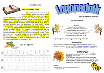 Coś dla uszka Bzyk i zaczarowany zamek. Bzyk od rana bawił się w chowanego ze swoimi kuzynami. Była to jego ulubiona zabawa, bo zawsze zwyciężał. Tym razem, nieco zmęczony, poleciał znaleźć kolejną kryjówkę. „Oj! Chyba odleciałem za daleko”- bzyknął rozglądając się dookoła- „Muszę zawrócić!” Jednak po chwili okazało się, że Bzyk zgubił drogę. Nie zmartwił się tym, lecz z zaciekawieniem zaczął się rozglądać. Nagle, za rozłożystym dębem, zobaczył ogromny zamek. Bzycząc, zaczął zbliżać się do niego. Wtem coś przed nim przemknęło. „To chyba zjawa?!”- bzyknął zaskoczony. Bzyk wszedł do zamku bez zaproszenia, zapominając zapukać… W środku zobaczył porozrzucane zabawki, zapakowane prezenty. Wokół roztaczał się zapach frezji, a z góry dobiegała piękna muzyka. Bzyk zaraz tam poleciał. Jego oczom ukazał się niezwykły skarb… Już miał go otworzyć, kiedy usłyszał bicie zegara. Bim – bam, bim – bam. Wszystko zaczęło wirować i znikać. Bim – bam, bim – bam. Bzyka zaczęła boleć głowa, zamknął oczy, zatkał uszy. Mimo to, usłyszał z oddali bzyczenie kuzynów. Otworzył oczy … i zobaczył, że leży pod rozłożystym dębem. Po zamku nie został nawet ślad! Za to na głowie Bzyka, nie wiadomo skąd, znalazły się dwa ogromne guzy. Coś dla rączek czyli o zabawie słowem… ̴ nr 32, październik 2015 ̴ „Listeczki” Posypały się listeczki dookoła. To już jesień te listeczki z wiatrem woła. Opadnijcie moje złote i czerwone. Jestem jesień, przyszłam tutaj w waszą stronę. Lecą listki, lecą z klonu i z kasztana. Będą z listków bukieciki złote dla nas. Zapraszamy do zaczarowanego języczkowego świata ☺ Drodzy Rodzice! W tym numerze Logopednika pobawimy się z głoską [z]. Gazetka jest dostępna na stronie internetowej ZSP: www.zsp-laka.edu.pl Znajdują się tam dodatkowe ćwiczenia, wszystkie w formacie A4. KONKURS!!! Zwycięzcą wrześniowego konkursu została KORNELIA SZKLANNY. Gratulacje!!! Drogi czytelniku! Narysuj ilustrację do fragmentu bajki o Bzyku w formacie A4. Zwycięzcę czeka nagroda☺ Prace można dostarczać do gabinetu logopedycznego, do końca października. Szczegóły w załączniku konkurs. Kontakt: Monika Załucka e-mail: [email protected] Dominika Machnik 4. Co przedstawiają rysunki? Nazwa, którego obrazka nie pojawia się w tekście? Otocz go pętlą. Pokoloruj całość. Przy pomocy kropek zaznacz, ile sylab ukryło się w nazwach obrazków. Mamo, Tato - pobaw się ze mną! Przygoda Bzyka 1. Bzyk lata wśród niezapominajek. Omija, bzycząc na jednym wydechu. Naśladuj Bzyka [zzz] przesuwając palcem po linii. 2. Odczytaj muzykę dobiegającą z zamku. 5. Odczytaj wyrazy. W wyrazach ukryły się sylaby umieszczone na żołędziach. Połącz odpowiedni listek z żołędziem. Pokoloruj. 3. Połącz sylaby w całość (np. ko – tek = kotek). Co ukryło się w prezentach? Narysuj odpowiedni rysunek. Lub wytnij z gazety i wklej. ZE – GA - REK wazelina gazeta zebra WA – ZO - NIK LI - ZAK = = waza zamek egzamin ZO ZA ZU rajtuzy muzyka zydel benzyna ZY ZE = zupa Mazury glazura wazonik Zosia PRZYJEMNEJ ZABAWY M. Z.