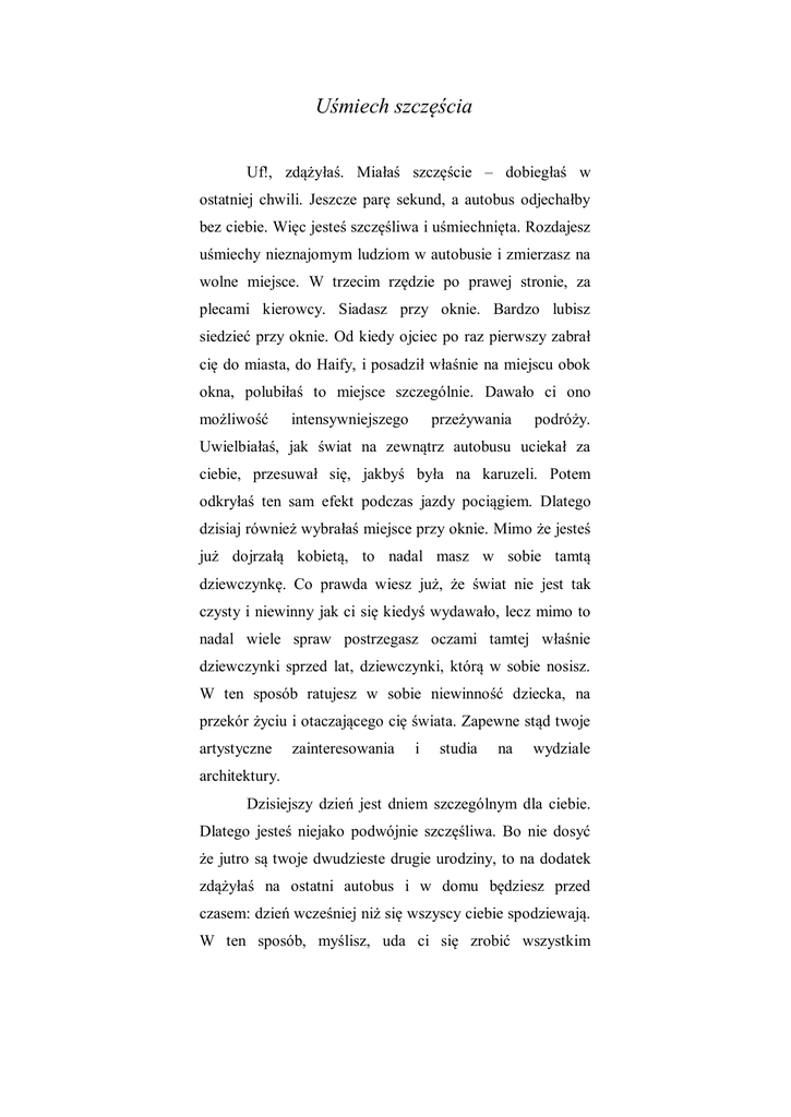 Uśmiech szczęścia Uf!, zdążyłaś. Miałaś szczęście – dobiegłaś w ostatniej chwili. Jeszcze parę sekund, a autobus odjechałby bez ciebie. Więc jesteś szczęśliwa i uśmiechnięta. Rozdajesz uśmiechy nieznajomym ludziom w autobusie i zmierzasz na wolne miejsce. W trzecim rzędzie po prawej stronie, za plecami kierowcy. Siadasz przy oknie. Bardzo lubisz siedzieć przy oknie. Od kiedy ojciec po raz pierwszy zabrał cię do miasta, do Haify, i posadził właśnie na miejscu obok okna, polubiłaś to miejsce szczególnie. Dawało ci ono możliwość intensywniejszego przeżywania podróży. Uwielbiałaś, jak świat na zewnątrz autobusu uciekał za ciebie, przesuwał się, jakbyś była na karuzeli. Potem odkryłaś ten sam efekt podczas jazdy pociągiem. Dlatego dzisiaj również wybrałaś miejsce przy oknie. Mimo że jesteś już dojrzałą kobietą, to nadal masz w sobie tamtą dziewczynkę. Co prawda wiesz już, że świat nie jest tak czysty i niewinny jak ci się kiedyś wydawało, lecz mimo to nadal wiele spraw postrzegasz oczami tamtej właśnie dziewczynki sprzed lat, dziewczynki, którą w sobie nosisz. W ten sposób ratujesz w sobie niewinność dziecka, na przekór życiu i otaczającego cię świata. Zapewne stąd twoje artystyczne zainteresowania i studia na wydziale architektury. Dzisiejszy dzień jest dniem szczególnym dla ciebie. Dlatego jesteś niejako podwójnie szczęśliwa. Bo nie dosyć że jutro są twoje dwudzieste drugie urodziny, to na dodatek zdążyłaś na ostatni autobus i w domu będziesz przed czasem: dzień wcześniej niż się wszyscy ciebie spodziewają. W ten sposób, myślisz, uda ci się zrobić wszystkim niespodziankę. I mamie, której nie widziałaś już prawie rok, a za którą bardzo się stęskniłaś. I ojcu, którego, co prawda, widziałaś trzy miesiące temu, gdy całkiem niespodziewanie odwiedził cię w kampusie, ale za którym stęskniłaś się równie mocno jak za nią. Ale przede wszystkim chcesz zrobić największą niespodziankę braciszkowi, którego brakowało ci chyba najbardziej. Brakowało ci tego beztroskiego i zaraźliwego śmiechu. O!, nawet teraz na jego wspomnienie mimowolnie uśmiechnęłaś się do siebie. Autobus zatrzymuje się. Wsiadają kolejni podróżni. Jedna z kobiet przechodzi obok ciebie i zajmuje miejsce tuż za tobą. Nie zwracasz uwagi ani na nią, ani na innych podróżnych – zajęta jesteś swoimi myślami, które krążą teraz jak wolne ptaki nad krainą twojego dzieciństwa i bliskimi ci ludźmi. Jeszcze tego nie wiesz, ale oni również przygotowali dla ciebie niespodziankę. W końcu jutro są twoje urodziny! Więc cierpliwie teraz czekają na ciebie ze swoimi prezentami i uroczystym urodzinowym przyjęciem. Czekają i... i nigdy już się nie doczekają, a ty nigdy nie dowiesz się, jakie to były prezenty. Nikt z tego autobusu już nigdy niczego się nie dowie, nigdzie nie dojedzie, ponieważ on nigdy nie dotrze do celu swojej planowej podróży. Cel tej podróży został zmieniony. Przez tę kobietę za tobą. Gdybyś może na nią wcześniej spojrzała, może wówczas coś by cię tknęło, może wtedy wyczułabyś podskórnie – tą swoją kobiecą intuicją, że ta właśnie kobieta to niebezpieczeństwo, śmiertelne niebezpieczeństwo! Ale właściwie, czy to możliwe żeby to wiedzieć, wyczuć jakimkolwiek zmysłem? Niechęć i nienawiść tej Arabki jest dobrze skrywana. Ona wie, po co tutaj jest i jest zdeterminowana zrobić to, do czego była w ostatnim czasie cierpliwie przygotowywana. 2 Nic i nikt nie jest w stanie jej odciągnąć od zrobienia szaleńczego kroku, aby zostać kolejną żywą bombą, jeszcze jedną męczennicą w sprawie, której żadnej Bóg nie patronuje. Bo czyż jakikolwiek Bóg może popierać działania, które naznaczone są jadem nienawiści i szaleństwem zniszczenia? Przecież Bóg to zrozumienie i bezbrzeżne miłosierdzie, więc czy naprawdę może On patronować kultowi nienawiści i śmierci? Ale ta kobieta o tym nie myśli, nie chce tak myśleć – ta Arabka cierpi! I to cierpienie ma tłumaczyć wszystkie jej działania. Wkrótce stanie się to, do czego była od dawna przygotowywana premedytacją przez tych, wykorzystują którzy takich cynicznie ludzi jak i z ona – zranionych i cierpiących, w rękach których są tylko bezwolnymi narzędziami do zabijania. Wkrótce ty i wszyscy twoi współtowarzysze podróży staną się ofiarami nienawiści tej kobiety; ona również jest tutaj ofiarą, tyle że swojego bólu i cierpienia. I tak już pozostanie. Na zawsze. Jak zatrzymany nagle kadr filmu. Uśmiechasz się jeszcze raz do swoich myśli. I jest to twój ostatni uśmiech. Za chwilę... 3