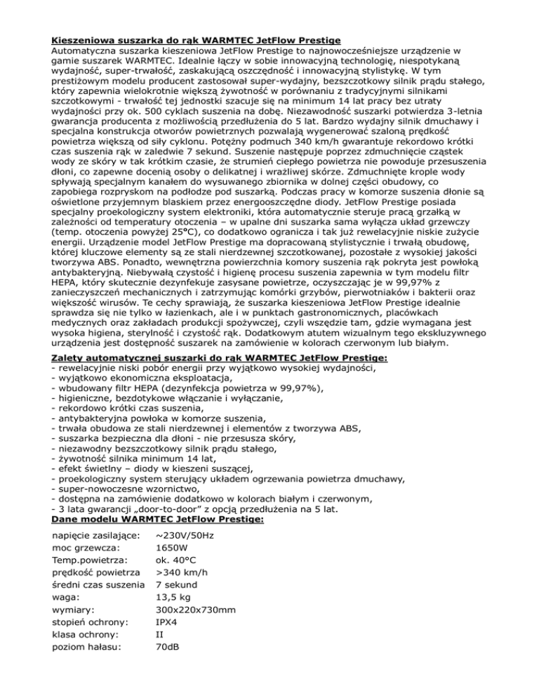 Kieszeniowa suszarka do rąk WARMTEC JetFlow Prestige Automatyczna suszarka kieszeniowa JetFlow Prestige to najnowocześniejsze urządzenie w gamie suszarek WARMTEC. Idealnie łączy w sobie innowacyjną technologię, niespotykaną wydajność, super-trwałość, zaskakującą oszczędność i innowacyjną stylistykę. W tym prestiżowym modelu producent zastosował super-wydajny, bezszczotkowy silnik prądu stałego, który zapewnia wielokrotnie większą żywotność w porównaniu z tradycyjnymi silnikami szczotkowymi - trwałość tej jednostki szacuje się na minimum 14 lat pracy bez utraty wydajności przy ok. 500 cyklach suszenia na dobę. Niezawodność suszarki potwierdza 3-letnia gwarancja producenta z możliwością przedłużenia do 5 lat. Bardzo wydajny silnik dmuchawy i specjalna konstrukcja otworów powietrznych pozwalają wygenerować szaloną prędkość powietrza większą od siły cyklonu. Potężny podmuch 340 km/h gwarantuje rekordowo krótki czas suszenia rąk w zaledwie 7 sekund. Suszenie następuje poprzez zdmuchnięcie cząstek wody ze skóry w tak krótkim czasie, że strumień ciepłego powietrza nie powoduje przesuszenia dłoni, co zapewne docenią osoby o delikatnej i wrażliwej skórze. Zdmuchnięte krople wody spływają specjalnym kanałem do wysuwanego zbiornika w dolnej części obudowy, co zapobiega rozpryskom na podłodze pod suszarką. Podczas pracy w komorze suszenia dłonie są oświetlone przyjemnym blaskiem przez energooszczędne diody. JetFlow Prestige posiada specjalny proekologiczny system elektroniki, która automatycznie steruje pracą grzałką w zależności od temperatury otoczenia – w upalne dni suszarka sama wyłącza układ grzewczy (temp. otoczenia powyżej 25oC), co dodatkowo ogranicza i tak już rewelacyjnie niskie zużycie energii. Urządzenie model JetFlow Prestige ma dopracowaną stylistycznie i trwałą obudowę, której kluczowe elementy są ze stali nierdzewnej szczotkowanej, pozostałe z wysokiej jakości tworzywa ABS. Ponadto, wewnętrzna powierzchnia komory suszenia rąk pokryta jest powłoką antybakteryjną. Niebywałą czystość i higienę procesu suszenia zapewnia w tym modelu filtr HEPA, który skutecznie dezynfekuje zasysane powietrze, oczyszczając je w 99,97% z zanieczyszczeń mechanicznych i zatrzymując komórki grzybów, pierwotniaków i bakterii oraz większość wirusów. Te cechy sprawiają, że suszarka kieszeniowa JetFlow Prestige idealnie sprawdza się nie tylko w łazienkach, ale i w punktach gastronomicznych, placówkach medycznych oraz zakładach produkcji spożywczej, czyli wszędzie tam, gdzie wymagana jest wysoka higiena, sterylność i czystość rąk. Dodatkowym atutem wizualnym tego ekskluzywnego urządzenia jest dostępność suszarek na zamówienie w kolorach czerwonym lub białym. Zalety automatycznej suszarki do rąk WARMTEC JetFlow Prestige: - rewelacyjnie niski pobór energii przy wyjątkowo wysokiej wydajności, - wyjątkowo ekonomiczna eksploatacja, - wbudowany filtr HEPA (dezynfekcja powietrza w 99,97%), - higieniczne, bezdotykowe włączanie i wyłączanie, - rekordowo krótki czas suszenia, - antybakteryjna powłoka w komorze suszenia, - trwała obudowa ze stali nierdzewnej i elementów z tworzywa ABS, - suszarka bezpieczna dla dłoni - nie przesusza skóry, - niezawodny bezszczotkowy silnik prądu stałego, - żywotność silnika minimum 14 lat, - efekt świetlny – diody w kieszeni suszącej, - proekologiczny system sterujący układem ogrzewania powietrza dmuchawy, - super-nowoczesne wzornictwo, - dostępna na zamówienie dodatkowo w kolorach białym i czerwonym, - 3 lata gwarancji „door-to-door” z opcją przedłużenia na 5 lat. Dane modelu WARMTEC JetFlow Prestige: napięcie zasilające: moc grzewcza: Temp.powietrza: prędkość powietrza średni czas suszenia waga: wymiary: stopień ochrony: klasa ochrony: poziom hałasu: ~230V/50Hz 1650W ok. 40°C >340 km/h 7 sekund 13,5 kg 300x220x730mm IPX4 II 70dB