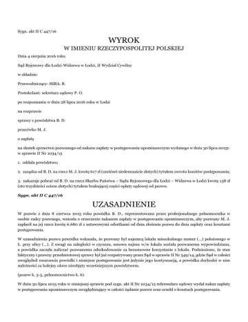 Sygn. akt II C 447/16 WYROK W IMIENIU RZECZYPOSPOLITEJ POLSKIEJ Dnia 4 sierpnia 2016 roku Sąd Rejonowy dla Łodzi-Widzewa w Łodzi, II Wydział Cywilny w składzie: Przewodniczący: SSRA. B. Protokolant: sekretarz sądowy P. O. po rozpoznaniu w dniu 28 lipca 2016 roku w Łodzi na rozprawie sprawy z powództwa B. D. przeciwko M. J. o zapłatę na skutek sprzeciwu pozwanego od nakazu zapłaty w postępowaniu upominawczym wydanego w dniu 30 lipca 2015r. w sprawie II Nc 1034/15 1. oddala powództwo; 2. zasądza od B. D. na rzecz M. J. kwotę 617 zł (sześćset siedemnaście złotych) tytułem zwrotu kosztów postępowania; 3. nakazuje pobrać od B. D. na rzecz Skarbu Państwa – Sądu Rejonowego dla Łodzi – Widzewa w Łodzi kwotę 138 zł (sto trzydzieści osiem złotych) tytułem brakującej części opłaty sądowej od pozwu. Sygn. akt II C 447/16 UZASADNIENIE W pozwie z dnia 8 czerwca 2015 roku powódka B. D., reprezentowana przez profesjonalnego pełnomocnika w osobie radcy prawnego, wniosła o orzeczenie nakazem zapłaty w postępowaniu upominawczym, aby pozwany M. J. zapłacił na jej rzecz kwotę 6.680 zł z ustawowymi odsetkami od dnia złożenia pozwu do dnia zapłaty oraz kosztami postępowania. W uzasadnieniu pozwu powódka wskazała, że pozwany był najemcą lokalu mieszkalnego numer (...) położonego w Ł. przy ulicy (...). Z uwagi na zaległości w czynszu, umowa najmu w/w lokalu została pozwanemu wypowiedziana, a powódka zaczęła naliczać pozwanemu odszkodowanie za bezumowne korzystanie z lokalu. Podniesiono, że stan faktyczny i prawny przedmiotowej sprawy był już rozpatrywany przez Sąd w sprawie II Nc 549/14, gdzie Sąd w całości uwzględnił roszczenia powódki i niniejsze postępowanie jest jedynie jego kontynuacją, a powódka dochodzi w nim należności za kolejny okres nieobjęty wcześniejszym powództwem. (pozew k. 3-5, pełnomocnictwo k. 6) W dniu 30 lipca 2015 roku w niniejszej sprawie pod sygn. akt II Nc 1034/15 referendarz sądowy wydał nakaz zapłaty w postępowaniu upominawczym uwzględniający w całości żądanie pozwu oraz orzekł o kosztach postępowania. (nakaz zapłaty k. 19) Odpis nakazu przesłano pozwanemu na adres Ł., ulica (...). Przesyłka dla pozwanego została doręczona przez awizo z dniem 25 sierpnia 2015 roku. (dowód doręczenia, stwierdzenie prawomocności k. 21) W dniu 4 marca 2016 roku pozwany M. J. wniósł sprzeciw od nakazu zapłaty w postępowaniu upominawczym z dnia 30 lipca 2015 roku wydanego w sprawie II Nc 1034/15 wraz z wnioskiem o przywrócenie terminu do złożenia sprzeciwu. Pozwany wyjaśnił, że nakaz zapłaty nie został mu nigdy skutecznie doręczony. W okresie od 31 października 2013 roku mieszkał w lokalu położonym w Ł. przy ul. (...), który wynajmował. O wydaniu nakazu zapłaty dowiedział się z rozmowy z Komornikiem S. w dniu 1 marca 2016 roku, a następnie z akt postępowania II Nc 1034/15, z którymi zapoznał się w dniu 3 marca 2016 roku, po ich zamówieniu do czytelni tutejszego Sądu. W sprzeciwie od nakazu zapłaty pozwany podniósł, że od dnia 31 października 2013 roku nie mieszkał przy ul. (...), o czym strona powodowa wiedziała. Wniósł o oddalenie powództwa i zasądzenie zwrotu kosztów postępowania według norm przepisanych. (wniosek o przywrócenie terminu ze sprzeciwem k. 31-39) W piśmie z dnia 8 kwietnia 2016 roku pełnomocnik powódki podtrzymał w pełnym zakresie stanowisko zajęte w pozwie. Podniósł, że fakt wynajęcia przez pozwanego z dniem 31 października 2013 roku innego lokalu mieszkalnego niż dotychczas zajmowany nie świadczy o opuszczeniu przez pozwanego lokalu będącego przedmiotem rozważań Sadu w tym postępowaniu. (pismo procesowe k. 43-45) Na rozprawie w dniu 27 czerwca 2016 roku pełnomocnik powódki oświadczył, że żądanie pozwu dotyczy okresu od lutego 2014 roku do października 2014 roku. (protokół elektroniczny rozprawy z dnia 27 czerwca 2016r. k. 71) Postanowieniem z dnia 27 czerwca 2016 roku Sąd stwierdził, że sprzeciw od nakazu zapłaty został wydany w terminie. (postanowienie z dnia 27 czerwca 2016r.) Do końca postępowania strony pozostały przy dotychczasowych stanowiskach w sprawie. (protokoły rozpraw elektronicznych z dnia 27 czerwca i 28 lipca 2016r. k. 71-75, k. 89-95) Sąd Rejonowy ustalił następujący stan faktyczny: Powódka B. D. jest właścicielką nieruchomości położonej w Ł. przy ul. (...). (bezsporne) Pozwany M. J. był najemcą lokalu mieszkalnego numer (...) położonego w Ł. przy ul. (...). Z uwagi na fakt, iż pozwany nie regulował terminowo czynszu najmu za zajmowany lokal mieszkalny, zarządca nieruchomości wypowiedział mu umowę najmu i po upływie okresu wypowiedzenia poinformował go, że za bezumowne korzystanie z lokalu będzie naliczane odszkodowanie. (bezsporne; także pismo (...) Spółka z o.o. z dnia 13.03.2013r. k. 47, także zeznania świadka J. J. (1) w protokole elektronicznym rozprawy z dnia 27 czerwca 2016r. k. 72-73) Wyrokiem zaocznym Sądu Rejonowego dla Łodzi – Widzewa w Łodzi z dnia 28 maja 2013 roku wydanym w sprawie II C 225/13 orzeczono eksmisję M. J. z lokalu będącego przedmiotem postępowania w tej sprawie. Tytuł wykonawczy został wydany A. K. w dniu 29 lipca 2013 roku. (kopia tytułu wykonawczego w postaci wyroku z dnia 28 maja 2013r. k. 46 W piśmie z dnia 2 sierpnia 2013 roku (...) Spółka z o.o. reprezentowana przez A. K., w związku z wyrokiem eksmisyjnym, wezwała pozwanego M. J. do opróżnienia lokalu mieszkalnego numer (...) przy ul. (...) w terminie 7 dni od daty otrzymania pisma. (pismo k. 50) Na nieruchomości położonej w Ł. przy ul. (...) był problem z doręczaniem korespondencji, gdyż skrzynki pocztowe znajdowały się wewnątrz klatki, a ona była zamykana na klucz. Klucze do klatki mieli jedynie lokatorzy. Nie miał ich listonosz. Problem z doręczaniem korespondencji na terenie nieruchomości został usunięty już po wyprowadzce z niej po