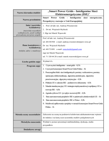 Nazwa kierunku studiów „Smart Power Grids - Inteligentne Sieci Elektroenergetyczne (ISE)” Smart Nazwa przedmiotu Imię i nazwisko wykładowcy (nazwiska wszystkich wykładowców, jeżeli wykład prowadzony jest przez zespół) Power Grids - Inteligentne sieci energetyczne. Perspektywy rozwoju w Unii Europejskiej 1. Prof. dr hab. inż. Andrzej Wiszniewski 2. Dr inż. Wojciech Myślecki 3. Mgr inż Marek Wąsowski Prof. dr hab. inż. Andrzej Wiszniewski tel. 601381944 e-mail: [email protected] Dane kontaktowe z wykładowcą (telefon, adres e-mailowy) Dr inż. Wojciech Myślecki tel. 601731091 e-mail: [email protected] mgr inż Marek Wąsowski tel. 71 320 44 28 e-mail: [email protected] Liczba godzin zajęć Program zajęć Wykład 6 h. 1. Czym są sieci inteligentne – smart grids – 0,5 h 2. Czym jest konsorcjum Smart Power Grids Polska – 1h 3. Poszczególne bloki sieci inteligentnych: pomiary rozliczeniowe, pomiary operacyjne, telekomunikacja, algorytmy predykcyjne, algorytmy przeciwawaryjne, algorytmy restytucyjne – 0,5h 4. Polityka UE w zakresie ISE – podstawowe dokumenty - 0,5h 5. Mandat standaryzacyjny UE i strategia międzynarodowej współpracy UE w rozwoju ISE – 0,5h 6. Agenda cyfrowa UE i je wpływ na rozwój ISE – 0,5h 7. Stan zaawansowania projektów ISE w państwach członkowskich UE – 1h 8. Stan zaawansowania projektów ISE w Polsce – 0,5h 9. Możliwość aplikowania o projekty w ramach konsorcjum Smart Power Grids Polska – 1h Metoda oceny uczestników Zaliczenie na ocenę na podstawie kolokwium udokumentowane wpisem do indeksu i na kartę ocen uczestnika studiów podyplomowych Metodyka nauczania Wykład w postaci prezentacji multimedialnej, dyskusja, studia przypadków Dodatkowe uwagi Nazwa kierunku studiów „Smart Power Grids - Inteligentne Sieci Elektroenergetyczne (ISE)” Polityka Energetyczna Unii Europejskiej – rynki energii Nazwa przedmiotu Imię i nazwisko wykładowcy (nazwiska wszystkich wykładowców, jeżeli wykład prowadzony jest przez zespół) Dane kontaktowe z wykładowcą (telefon, adres e-mailowy) Liczba godzin zajęć elektrycznej Prof. dr hab. inż. Jacek Malko Dr Mariusz Swora 1. tel. 0-71 320 39 52 e-mail: [email protected] 2. [email protected] Wykład 6 h. Program zajęć 1. Ewolucja i perspektywy sektora energetyki, cele strategiczne, priorytety, mechanizmy rynkowe i regulacyjne – 1h 2. Nowa jakość w systemach infrastrukturalnych, koncepcja "smart" w realiach polityki niskowęglowej – 1h 3. Modele 3E (Energetyka, Ekonomika, Ekologia) w strategii rozwoju sektora, energetyka niskiego poziomu stabilizacji emisji gazów cieplarnianych (GHG) – 1h, 4. "Mapa drogowa" 2050 wg. European Climate Forum 2010 – 1h, 5. "Mapa drogowa" wg. PricewaterhouseCoopers 2010 – 1h, 6. Polityka energetyczna Polski w świetle wyzwań klimatycznych – 1h. Metoda oceny uczestników Zaliczenie na ocenę na podstawie kolokwium udokumentowane wpisem do indeksu i na kartę ocen uczestnika studiów podyplomowych Metodyka nauczania Wykład w postaci prezentacji multimedialnej, dyskusja, studia przypadków Dodatkowe uwagi Nazwa kierunku studiów „Smart Power Grids - Inteligentne Sieci Elektroenergetyczne (ISE)” Inteligentna automatyka zabezpieczeniowa i restytucyjna Nazwa przedmiotu Imię i nazwisko wykładowcy (nazwiska wszystkich wykładowców, jeżeli wykład prowadzony jest przez zespół) w systemach elektroenergetycznych 1. Prof. dr hab. inż. Andrzej Wiszniewski 2. Prof. dr hab. inż. Jan Iżykowski 3. Prof. dr hab. inż. Eugeniusz Rosołowski 1. tel. 601381944 e-mail: [email protected] Dane kontaktowe z wykładowcą 2. tel. 71 320 26 58 e-mail: [email protected] 3. tel. 71 320 37 86 e-mail: [email protected] (telefon, adres e-mailowy) Liczba godzin zajęć Program zajęć Wykład 12 h. 1. Rola automatyki zabezpieczeniowej we współczesnych systemach – 1h. 2. Wymagania stawiane układom zabezpieczeń lokalnym i obszarowym – 1h. 3. Struktura cyfrowych zabezpieczeń – 1h. 4. Wielkości kryterialne i przetwarzanie cyfrowe sygnałów – 2h. 5. Pomiary cyfrowe wielkości kryterialnych – 1h.. 6. Przyłączenie Elektroenergetycznej Automatyki Zabezpieczeniowej do sieci elektroenergetycznej (przekładniki, filtry) – 2h 7. Adaptacyjność działania układów automatyki zabezpieczeniowej – 1h 8. Błędy pomiarowe i ich eliminowanie – 1h. 9. Podejmowanie decyzji w układach zabezpieczeń. – 1h. 10. Przykłady realizacji inteligentnej automatyki zabezpieczeniowej – 1h Metoda oceny uczestników Zaliczenie na ocenę na podstawie kolokwium udokumentowane wpisem do indeksu i na kartę ocen uczestnika studiów podyplomowych Metodyka nauczania Wykład w postaci prezentacji multimedialnej, dyskusja, studia przypadków Dodatkowe uwagi Nazwa kierunku studiów „Smart Power Grids - Inteligentne Sieci Elektroenergetyczne (ISE)” Mobilne systemy monitorowania i sterowania w energetyce. Nazwa przedmiotu Imię i nazwisko wykładowcy (nazwiska wszystkich wykładowców, jeżeli wykład prowadzony jest przez zespół) (Mobile monitoring and control systems in power engineering). Dr inż. Kamil Staniec (5 h) Mgr inż. Krzysztof Rutecki (5 h) Dr inż. Kamil Staniec: tel. 0-71 320-34-34, Dane kontaktowe z wykładowcą (telefon, adres e-mailowy) e-mail: [email protected] Mgr inż. Krzysztof Rutecki: tel. 0-71 320-44-08, e-mail: [email protected] Liczba godzin zajęć Wykład – 10 h Program zajęć 1. Podstawy teorii sterowania – 1h 2. Mobilne systemy telekomunikacyjne – 1h 3. Kompatybilność elektromagnetyczna – częste błędy w przykładach -1h 4. Monitoring jako problem akwizycji, wizualizacji danych i raportowania -1h 5. Bazy danych – 1h 6. Model systemu monitorowania i sterowania w energetyce w przykładach -1h 7. Mobilne systemy monitorowania – 1h 8. Mobilne systemy sterowania -1h 9. Zastosowanie mobilnych systemów monitorowania i sterowania w energetyce , w zakresie - 2h: a. Sieci i Systemów Energetycznych, b. Elektrowni, c. 
