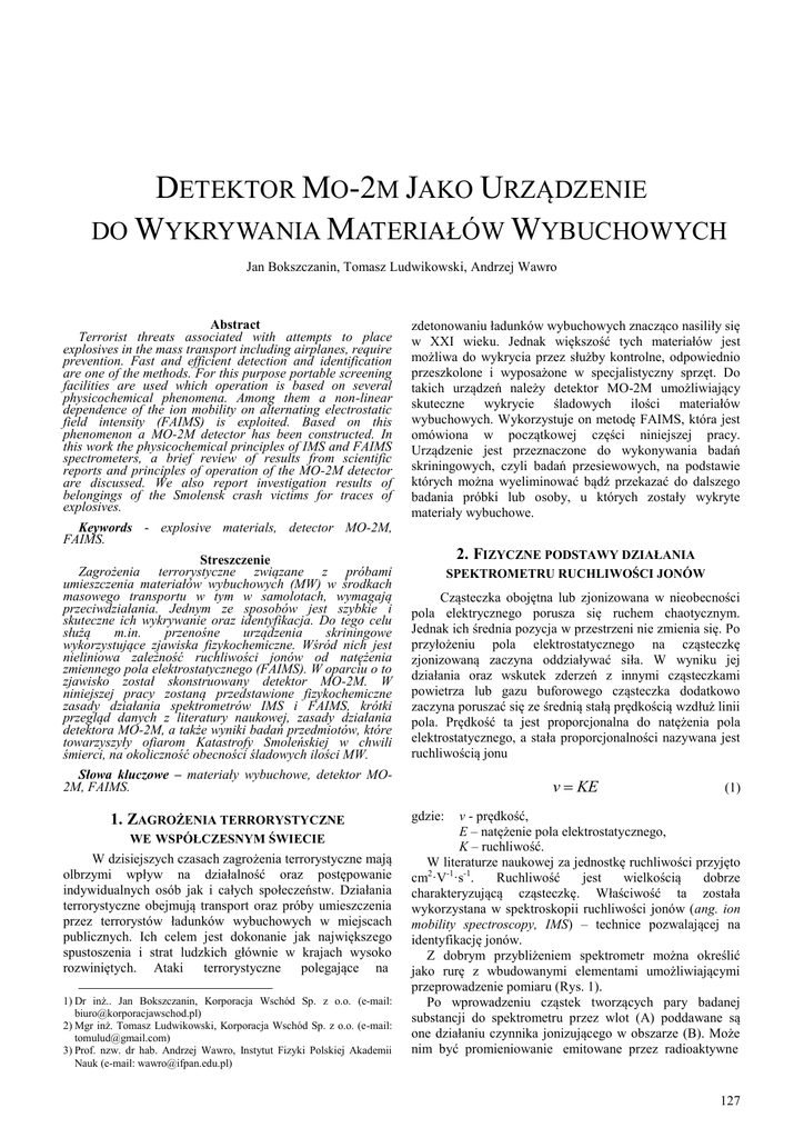 DETEKTOR MO-2M JAKO URZĄDZENIE DO WYKRYWANIA MATERIAŁÓW WYBUCHOWYCH Jan Bokszczanin, Tomasz Ludwikowski, Andrzej Wawro Abstract Terrorist threats associated with attempts to place explosives in the mass transport including airplanes, require prevention. Fast and efficient detection and identification are one of the methods. For this purpose portable screening facilities are used which operation is based on several physicochemical phenomena. Among them a non-linear dependence of the ion mobility on alternating electrostatic field intensity (FAIMS) is exploited. Based on this phenomenon a MO-2M detector has been constructed. In this work the physicochemical principles of IMS and FAIMS spectrometers, a brief review of results from scientific reports and principles of operation of the MO-2M detector are discussed. We also report investigation results of belongings of the Smolensk crash victims for traces of explosives. zdetonowaniu ładunków wybuchowych znacząco nasiliły się w XXI wieku. Jednak większość tych materiałów jest możliwa do wykrycia przez służby kontrolne, odpowiednio przeszkolone i wyposażone w specjalistyczny sprzęt. Do takich urządzeń należy detektor MO-2M umożliwiający skuteczne wykrycie śladowych ilości materiałów wybuchowych. Wykorzystuje on metodę FAIMS, która jest omówiona w początkowej części niniejszej pracy. Urządzenie jest przeznaczone do wykonywania badań skriningowych, czyli badań przesiewowych, na podstawie których można wyeliminować bądź przekazać do dalszego badania próbki lub osoby, u których zostały wykryte materiały wybuchowe. Keywords - explosive materials, detector MO-2M, FAIMS. 2. FIZYCZNE PODSTAWY DZIAŁANIA SPEKTROMETRU RUCHLIWOŚCI JONÓW Streszczenie Zagrożenia terrorystyczne związane z próbami umieszczenia materiałów wybuchowych (MW) w środkach masowego transportu w tym w samolotach, wymagają przeciwdziałania. Jednym ze sposobów jest szybkie i skuteczne ich wykrywanie oraz identyfikacja. Do tego celu służą m.in. przenośne urządzenia skriningowe wykorzystujące zjawiska fizykochemiczne. Wśród nich jest nieliniowa zależność ruchliwości jonów od natężenia zmiennego pola elektrostatycznego (FAIMS). W oparciu o to zjawisko został skonstruowany detektor MO-2M. W niniejszej pracy zostaną przedstawione fizykochemiczne zasady działania spektrometrów IMS i FAIMS, krótki przegląd danych z literatury naukowej, zasady działania detektora MO-2M, a także wyniki badań przedmiotów, które towarzyszyły ofiarom Katastrofy Smoleńskiej w chwili śmierci, na okoliczność obecności śladowych ilości MW. Cząsteczka obojętna lub zjonizowana w nieobecności pola elektrycznego porusza się ruchem chaotycznym. Jednak ich średnia pozycja w przestrzeni nie zmienia się. Po przyłożeniu pola elektrostatycznego na cząsteczkę zjonizowaną zaczyna oddziaływać siła. W wyniku jej działania oraz wskutek zderzeń z innymi cząsteczkami powietrza lub gazu buforowego cząsteczka dodatkowo zaczyna poruszać się ze średnią stałą prędkością wzdłuż linii pola. Prędkość ta jest proporcjonalna do natężenia pola elektrostatycznego, a stała proporcjonalności nazywana jest ruchliwością jonu Słowa kluczowe – materiały wybuchowe, detektor MO2M, FAIMS. v KE 1. ZAGROŻENIA TERRORYSTYCZNE WE WSPÓŁCZESNYM ŚWIECIE W dzisiejszych czasach zagrożenia terrorystyczne mają olbrzymi wpływ na działalność oraz postępowanie indywidualnych osób jak i całych społeczeństw. Działania terrorystyczne obejmują transport oraz próby umieszczenia przez terrorystów ładunków wybuchowych w miejscach publicznych. Ich celem jest dokonanie jak największego spustoszenia i strat ludzkich głównie w krajach wysoko rozwiniętych. Ataki terrorystyczne polegające na 1) Dr inż.. Jan Bokszczanin, Korporacja Wschód Sp. z o.o. (e-mail: [email protected]) 2) Mgr inż. Tomasz Ludwikowski, Korporacja Wschód Sp. z o.o. (e-mail: [email protected]) 3) Prof. nzw. dr hab. Andrzej Wawro, Instytut Fizyki Polskiej Akademii Nauk (e-mail: [email protected]) (1) v - prędkość, E – natężenie pola elektrostatycznego, K – ruchliwość. W literaturze naukowej za jednostkę ruchliwości przyjęto cm2·V-1·s-1. Ruchliwość jest wielkością dobrze charakteryzującą cząsteczkę. Właściwość ta została wykorzystana w spektroskopii ruchliwości jonów (ang. ion mobility spectroscopy, IMS) – technice pozwalającej na identyfikację jonów. Z dobrym przybliżeniem spektrometr można określić jako rurę z wbudowanymi elementami umożliwiającymi przeprowadzenie pomiaru (Rys. 1). Po wprowadzeniu cząstek tworzących pary badanej substancji do spektrometru przez wlot (A) poddawane są one działaniu czynnika jonizującego w obszarze (B). Może nim być promieniowanie emitowane przez radioaktywne gdzie: 127 Jan Bokszczanin, Tomasz Ludwikowski, Andrzej Wawro W wyniku dalszego udoskonalenia budowy tego typu aparatury powstał spektrometr z asymetrycznym polem poprzecznym (ang. field asymmetric ion mass spectrometer, FAIMS). Dodatkowym elementem są elektrody ułożone równolegle do osi spektrometru (Rys. 2), do których przykładane jest impulsowe asymetryczne napięcie V generujące pole elektrostatyczne skierowane prostopadle do osi spektrometru o wysokim natężeniu ok. 20000 V·cm-1. W tak silnych polach współczynnik α staje się znaczący i istotnie modyfikuje wartość ruchliwości zredukowanej K ( E ) K0 (1 E ) (4) Rys. 1. Schemat budowy spektrometru IMS. Szczegółowy opis w tekście. źródło, wyładowanie koronowe, czy fotojonizacja. Tworzą się wtedy jony zarówno badanych cząsteczek jak również gazu buforowego (np. powietrza). Powstała chmura jonów formowana jest przez potencjał elektryczny przyłożony do bramki (C) w paczkę (D) o określonych rozmiarach. Pod wpływem przyłożonego pola elektrostatycznego E chmura jonów zaczyna przesuwać się wzdłuż osi spektrometru. Natężenie pola