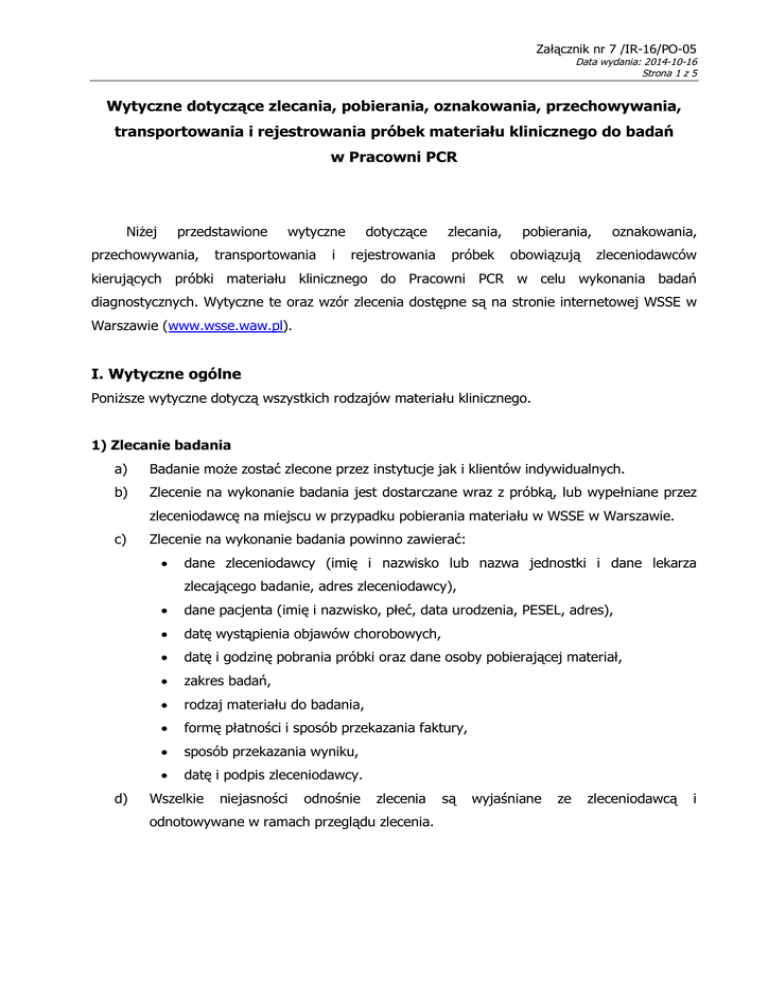 Załącznik nr 7 /IR-16/PO-05 Data wydania: 2014-10-16 Strona 1 z 5 Wytyczne dotyczące zlecania, pobierania, oznakowania, przechowywania, transportowania i rejestrowania próbek materiału klinicznego do badań w Pracowni PCR Niżej przedstawione przechowywania, wytyczne transportowania i dotyczące zlecania, rejestrowania próbek pobierania, obowiązują oznakowania, zleceniodawców kierujących próbki materiału klinicznego do Pracowni PCR w celu wykonania badań diagnostycznych. Wytyczne te oraz wzór zlecenia dostępne są na stronie internetowej WSSE w Warszawie (www.wsse.waw.pl). I. Wytyczne ogólne Poniższe wytyczne dotyczą wszystkich rodzajów materiału klinicznego. 1) Zlecanie badania a) Badanie może zostać zlecone przez instytucje jak i klientów indywidualnych. b) Zlecenie na wykonanie badania jest dostarczane wraz z próbką, lub wypełniane przez zleceniodawcę na miejscu w przypadku pobierania materiału w WSSE w Warszawie. c) Zlecenie na wykonanie badania powinno zawierać: dane zleceniodawcy (imię i nazwisko lub nazwa jednostki i dane lekarza zlecającego badanie, adres zleceniodawcy), d) dane pacjenta (imię i nazwisko, płeć, data urodzenia, PESEL, adres), datę wystąpienia objawów chorobowych, datę i godzinę pobrania próbki oraz dane osoby pobierającej materiał, zakres badań, rodzaj materiału do badania, formę płatności i sposób przekazania faktury, sposób przekazania wyniku, datę i podpis zleceniodawcy. Wszelkie niejasności odnośnie zlecenia odnotowywane w ramach przeglądu zlecenia. są wyjaśniane ze zleceniodawcą i Załącznik nr 7 /IR-16/PO-05 Data wydania: 2014-10-16 Strona 2 z 5 2) Pobieranie materiału. a) Osoba pobierająca próbki weryfikuje tożsamość pacjenta. b) Pobierany materiał traktowany jest jako zakaźny. c) Materiał musi być pobrany w taki sposób i z zastosowaniem takich materiałów pomocniczych aby wyeliminować zmiany jakości próbki. d) Osoba pobierająca próbki używa jednorazowych rękawiczek ochronnych – do każdego pacjenta stosowana jest nowa para rękawiczek. Rękawiczki są zakładane bezpośrednio przed pobraniem materiału a następnie odpowiednio utylizowane, nie mogą być wykorzystane do innych czynności. e) Osoba pobierająca próbki odnotowuje w sposób trwały na pojemniku z materiałem imię i nazwisko pacjenta oraz datę i godzinę pobrania materiału; na zleceniu wpisuje swoje imię i nazwisko oraz datę i godzinę pobrania materiału. 3) Przechowywanie materiału. Próbka powinna być dostarczona do laboratorium w możliwie jak najkrótszym czasie od momentu pobrania. Jeżeli jest to niemożliwe to należy ją przechować w takich warunkach aby nie doszło do zmiany jej właściwości. Warunki te sprecyzowano w szczegółowej części załącznika. 4) Transportowanie materiału. a) Transport próbki odbywa się w warunkach zabezpieczających ją przed zmianami. Warunki te sprecyzowano w szczegółowej części załącznika. b) Próbka jest przewożona przez kompetentny i upoważniony przez zleceniodawcę personel. c) Transport odbywa się zgodnie z regulacjami dotyczącymi przewozu materiału zakaźnego. Próbka jest zabezpieczona przed rozlaniem, umieszczona w szczelnych, zabezpieczonych przed uszkodzeniem i odpowiednio oznakowanych pojemnikach. d) Personel przewożący próbkę wyposażony jest we właściwe środki dezynfekujące, gotowe do użycia w przypadku skażenia środowiska. Załącznik nr 7 /IR-16/PO-05 Data wydania: 2014-10-16 Strona 3 z 5 5) Rejestrowanie i przyjmowanie próbek. a) Próbka jest rejestrowana zgodnie z Instrukcją Postępowania z próbkami przeznaczonymi do badań metodą PCR (IR-16/PO-05). b) W przypadku materiału pobieranego przez zleceniobiorcę klient wypełnia zlecenie i – po opłaceniu badania w kasie WSSE – jest kierowany przez Pracownika Pracowni PCR do punktu pobierania materiału. Próbka jest rejestrowana zgodnie z Instrukcją Postępowania z próbkami przeznaczonymi do badań metodą PCR (IR-16/PO-05). II. Wytyczne szczegółowe. Próbki do badań w kierunku wirusów grypy. Poniższe wytyczne przygotowano na podstawie „Zaleceń dotyczących pobierania, przechowywania i transportu materiałów klinicznych przeznaczonych do badań diagnostycznych w Pracowni Diagnostycznej Laboratorium Zakładu Badania Wirusów Grypy” przygotowanych przez Krajowy Ośrodek ds. Grypy NIZP-PZH i dostępnych pod adresem internetowym http://www.pzh.gov.pl Materiał badań: Do badania w kierunku wirusów grypy wykonywanych w Laboratorium WSSE w Warszawie najlepiej dostarczyć wymaz z gardła i nosa. Materiał powinien być pobrany do 7 dnia od pojawienia się pierwszych objawów choroby. Akceptowalne są także popłuczyny z drzewa oskrzelowego (BAL). Pobieranie materiału: a) Wymaz z gardła i nosa: W celu pobrania wymazu stosuje się sterylne wymazówki z tworzywa sztucznego z wacikiem z włókna syntetycznego takiego jak jedwab syntetyczny, wiskoza, dacron itp. Wymazówki z patyczkiem drewnianym i / lub wacikiem bawełnianym są nieakceptowalne. Aby pobrać wymaz z gardła należy szpatułką docisnąć język ku dołowi i suchą sterylną wymazówką potrzeć energicznie powierzchnie migdałków i tylną ścianę gardła, zwłaszcza w miejscach zapalnie zmienionych. Należy unikać dotykania powierzchni jamy ustnej. Następnie należy wymazówkę odłamać tuż przy zakrętce i umieścić w jałowej probówce transportowej bez Załącznik nr 7 /IR-16/PO-05 Data wydania: 2014-10-16 Strona 4 z 5 dotykania wacikiem jej ścianek. Probówkę zamknąć i opisać zgodnie z zasadami zamieszczonym w części ogólnej załącznika. Następnie pobrać wymaz z nosa. Pacjent nie powinien wydmuchiwać nos przed pobraniem materiału. Odchylić lekko głowę pacjenta do tyłu, przytrzymać za podbródek a drugą ręką umieścić koniec suchej sterylnej wymazówki w jednym z nozdrzy pacjenta i energicznie pobrać materiał. Materiał powinien zawierać zarówno śluz jak i kom