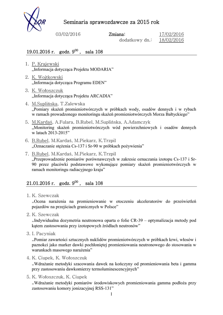 Seminaria sprawozdawcze za 2015 rok 03/02/2016 Zmiana: dodatkowy dn.: 17/02/2016 18/02/2016 19.01.2016 r. godz. 900 , sala 108 1. P. Krajewski „Informacja dotycząca Projektu MODARIA” 2. K. Wojtkowski „Informacja dotycząca Programu EDEN” 3. K. Wołoszczuk „Informacja dotycząca Projektu ARCADIA” 4. M.Suplińska, T.Zalewska „Pomiary skażeń promieniotwórczych w próbkach wody, osadów dennych i w rybach w ramach prowadzonego monitoringu skażeń promieniotwórczych Morza Bałtyckiego” 5. M.Kardaś, A.Fulara, B.Rubel, M.Suplińska, A.Adamczyk „Monitoring skażeń promieniotwórczych wód powierzchniowych i osadów dennych w latach 2013-2015” 6. B.Rubel, M.Kardaś, M.Piekarz, K.Trzpil „Oznaczanie stężenia Cs-137 i Sr-90 w próbkach pożywienia” 7. B.Rubel, M.Kardaś, M.Piekarz, K.Trzpil „Przeprowadzenie pomiarów porównawczych w zakresie oznaczania izotopu Cs-137 i Sr90 przez placówki podstawowe wykonujące pomiary skażeń promieniotwórczych w ramach monitoringu radiacyjnego kraju” 21.01.2016 r. godz. 900 , sala 108 1. K. Szewczak „Ocena narażenia na promieniowanie w otoczeniu akceleratorów do prześwietleń pojazdów na przejściach granicznych w Polsce” 2. K. Szewczak „Indywidualna dozymetria neutronowa oparta o folie CR-39 – optymalizacja metody pod kątem zastosowania przy izotopowych źródłach neutronów” 3. I. Pacyniak „Pomiar zawartości sztucznych nuklidów promieniotwórczych w próbkach krwi, włosów i paznokci jako marker dawki pochłoniętej promieniowania neutronowego do stosowania w warunkach masowego narażenia” 4. K. Ciupek, K. Wołoszczuk „Wdrażanie metodyki szacowania dawek na kończyny od promieniowania beta i gamma przy zastosowaniu dawkomierzy termoluminescencyjnych” 5. K. Wołoszczuk, K. Ciupek „Wdrażanie metodyki pomiarów środowiskowych promieniowania gamma podłoża przy zastosowaniu komory jonizacyjnej RSS-131” 1 6. K. Wołoszczuk, G. Krajewska „Opracowanie metody dozymetrii indywidualnego równoważnika dawki Hp(3) z wykorzystaniem detektorów termoluminescencyjnych” 26.01.2016 r. godz. 900 , sala 108 1. E. Starościak „Utrzymanie systemu i spektrometrycznych” zarządzania w laboratorium analiz radiochemicznych 2. K. Wojtkowski „Zorganizowanie i przeprowadzenie pomiarów porównawczych zawartości naturalnych izotopów promieniotwórczych w surowcach i materiałach budowlanych dla jednostek organizacyjnych prowadzących takie pomiary” 3. O. Stawarz „Utrzymanie akredytacji w Laboratorium Pomiarów Promieniotwórczości Naturalnej w zakresie określania stężeń promieniotwórczych Ra-226, Th-228 i K-40 w surowcach i materiałach budowlanych” 27.01.2016 r. godz. 900 , sala 108 1. K. Ciupek „Realizacja prac Działu Szkolenia i Informacji CLOR w 2015 r. - zadania Komitetu Technicznego 246 ds. ochrony radiologicznej” 2. J. Henschke „Ocena rocznych dawek dla ludności Polski od promieniowania jonizującego źródeł naturalnych i pochodzenia sztucznego obecnych w środowisku oraz od źródeł stosowanych w przemyśle i medycynie (ocena za 2014 r.)” 3. A. Fulara, „Oznaczenie promieniotwórczości wody do picia w aglomeracjach miejskich i ocena dawek od jej spożycia” 28.01.2016 r. godz. 900 , sala 108 1. G. Krajewska „Utrzymaniu gotowości laboratorium do wykonywania pomiarów zawartości jodu promieniotwórczego w tarczycy” 2. M. Kowalska „Opracowanie i walidacja krzywej dawka-skutek dla chromosomów dicentrycznych indukowanych in vitro w ludzkich limfocytach krwi obwodowej przez terapeutyczną wiązkę protonową cyklotronu Proteus C-235” 2 16.02.2016 r. godz. 900 , sala 108 1. A. Kudynowska „Zapewnienie i utrzymanie systemu zapewnienia jakości w Pracowni Dawek Indywidualnych i Środowiskowych (PDiŚ) dla potrzeb ochrony radiologicznej – część systemowa” 2. A. Kudynowska „Zapewnienie i utrzymanie systemu zapewnienia jakości w Laboratorium Wzorcowania Przyrządów Dozymetrycznych i Radonowych – część systemowa” 3. B. Piotrowska „Analiza i ocena zmian radioaktywności surowców i materiałów budowlanych stosowanych w Polsce w latach 1980-2015” 4. A. Fulara, M.Piekarz „Adaptacja metody oznaczania trytu związanego organicznie (OBT) w próbkach biologicznych” 5. A. Fulara, M.Piekarz „Opracowanie założeń dla wdrożenia metody oznaczania węgla C-14 w próbkach środowiskowych” 6. M. Kowalska „Udział w projekcie RENEB (Realizing the European Network of Biodosimetry)” 17.02.2016 r. godz. 900 , sala 108 1. K. Isajenko „Monitoring stężenia Cs-137 w glebie w latach 2014-2015” 2. K. Isajenko „Ocena dawki skutecznej dla mieszkańców Polski od wchłonięcia aerozoli atmosferycznych drogą oddechową (na podstawie wyników z sieci stacji ASS-500)” 3. K. Isajenko „Pomiary wielkości uwolnień substancji promieniotwórczych do powietrza w okolicy obiektu jądrowego w Świerku” 4. B. Piotrowska „Ocena sytuacji radiacyjnej w otoczeniu Krajowego Składowiska Promieniotwórczych (KSOP) w Różanie oraz wokół Ośrodka w Świerku” Odpadów 5. O. Stawarz „Analiza programów monitoringu radiologicznego środowiska poszczególnych krajów w kontekście energetyki jądrowej” 3 18.02.2016 r. godz. 900 , sala 108 1. K. Wołoszczuk „Zapewnienie i utrzymanie systemu zapewnienia jakości w Laboratorium Wzorcowania Przyrządów Dozymetrycznych i Radonowych – część techniczna” 2. K. Wołoszczuk: „Wzorcowanie przyrządów dozymetrycznych dla potrzeb ochrony radiologicznej w 2015 roku” 3. K. Szewczak „Zapewnienie i utrzymanie systemu zapewnienia jakości w Pracowni Dawek Indywidualnych i Środowiskowych (PDiŚ) dla potrzeb ochrony radiologicznej – część techniczna” 4. K. Szewczak „Charakterystyka systemów do wykonywania map radiologicznych skażeń promieniotwórczych powierzchni ziemi z wykorzystaniem aparatury zamontowanej na statkach powietrznych” 4