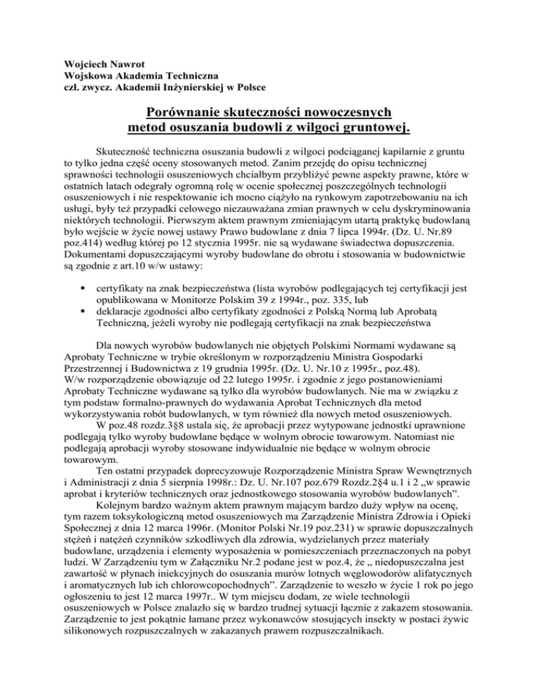Wojciech Nawrot Wojskowa Akademia Techniczna czł. zwycz. Akademii Inżynierskiej w Polsce Porównanie skuteczności nowoczesnych metod osuszania budowli z wilgoci gruntowej. Skuteczność techniczna osuszania budowli z wilgoci podciąganej kapilarnie z gruntu to tylko jedna część oceny stosowanych metod. Zanim przejdę do opisu technicznej sprawności technologii osuszeniowych chciałbym przybliżyć pewne aspekty prawne, które w ostatnich latach odegrały ogromną rolę w ocenie społecznej poszczególnych technologii osuszeniowych i nie respektowanie ich mocno ciążyło na rynkowym zapotrzebowaniu na ich usługi, były też przypadki celowego niezauważana zmian prawnych w celu dyskryminowania niektórych technologii. Pierwszym aktem prawnym zmieniającym utartą praktykę budowlaną było wejście w życie nowej ustawy Prawo budowlane z dnia 7 lipca 1994r. (Dz. U. Nr.89 poz.414) według której po 12 stycznia 1995r. nie są wydawane świadectwa dopuszczenia. Dokumentami dopuszczającymi wyroby budowlane do obrotu i stosowania w budownictwie są zgodnie z art.10 w/w ustawy: certyfikaty na znak bezpieczeństwa (lista wyrobów podlegających tej certyfikacji jest opublikowana w Monitorze Polskim 39 z 1994r., poz. 335, lub deklaracje zgodności albo certyfikaty zgodności z Polską Normą lub Aprobatą Techniczną, jeżeli wyroby nie podlegają certyfikacji na znak bezpieczeństwa Dla nowych wyrobów budowlanych nie objętych Polskimi Normami wydawane są Aprobaty Techniczne w trybie określonym w rozporządzeniu Ministra Gospodarki Przestrzennej i Budownictwa z 19 grudnia 1995r. (Dz. U. Nr.10 z 1995r., poz.48). W/w rozporządzenie obowiązuje od 22 lutego 1995r. i zgodnie z jego postanowieniami Aprobaty Techniczne wydawane są tylko dla wyrobów budowlanych. Nie ma w związku z tym podstaw formalno-prawnych do wydawania Aprobat Technicznych dla metod wykorzystywania robót budowlanych, w tym również dla nowych metod osuszeniowych. W poz.48 rozdz.3§8 ustala się, że aprobacji przez wytypowane jednostki uprawnione podlegają tylko wyroby budowlane będące w wolnym obrocie towarowym. Natomiast nie podlegają aprobacji wyroby stosowane indywidualnie nie będące w wolnym obrocie towarowym. Ten ostatni przypadek doprecyzowuje Rozporządzenie Ministra Spraw Wewnętrznych i Administracji z dnia 5 sierpnia 1998r.: Dz. U. Nr.107 poz.679 Rozdz.2§4 u.1 i 2 „w sprawie aprobat i kryteriów technicznych oraz jednostkowego stosowania wyrobów budowlanych”. Kolejnym bardzo ważnym aktem prawnym mającym bardzo duży wpływ na ocenę, tym razem toksykologiczną metod osuszeniowych ma Zarządzenie Ministra Zdrowia i Opieki Społecznej z dnia 12 marca 1996r. (Monitor Polski Nr.19 poz.231) w sprawie dopuszczalnych stężeń i natężeń czynników szkodliwych dla zdrowia, wydzielanych przez materiały budowlane, urządzenia i elementy wyposażenia w pomieszczeniach przeznaczonych na pobyt ludzi. W Zarządzeniu tym w Załączniku Nr.2 podane jest w poz.4, że „ niedopuszczalna jest zawartość w płynach iniekcyjnych do osuszania murów lotnych węglowodorów alifatycznych i aromatycznych lub ich chlorowcopochodnych”. Zarządzenie to weszło w życie 1 rok po jego ogłoszeniu to jest 12 marca 1997r.. W tym miejscu dodam, ze wiele technologii osuszeniowych w Polsce znalazło się w bardzo trudnej sytuacji łącznie z zakazem stosowania. Zarządzenie to jest pokątnie łamane przez wykonawców stosujących insekty w postaci żywic silikonowych rozpuszczalnych w zakazanych prawem rozpuszczalnikach. I wreszcie Ustawa o wyrobach budowlanych z dnia 16 marca 2004r. (Dz. U. Nr.92/2004 poz.881) i rozporządzenie wykonawcze do tej ustawy określają w art.9 ust.1: aprobaty techniczne mogą być wydawane dla wyrobów objętych mandatami udzielonymi przez Komisję Europejską na opracowanie europejskich norm zharmonizowanych lub wytycznych Europejskich Aprobat Technicznych (wykaz mandatów zamieszczony jest w obwieszczeniu Ministra Infrastruktury z dnia 5 lipca 2004r. – Monitor Polski Nr.32/2004, poz.571). Metody te nie obejmują środków iniekcyjnych stosowanych w metodach osuszenia budowli z wilgoci podciąganej kapilarnie. W związku z tym Aprobata Techniczna dla tego rodzaju wyrobów, zgodnie z obowiązującymi przepisami, nie jest wymagana. W świetle oczekiwań na badania porównawcze metod osuszających, czy każdych innych technologii, trzeba wiedzieć, że stosowane technologie nie można badać z pominięciem podstawowych procedur. Naczelna z nich to zgoda autora czy właściciela danej technologii na badania przez podmiot czy osobę chcącą przeprowadzić takie badania. Jest to potrzebne choćby dla uzyskania niezbędnej wiedzy o badanej technologii i otrzymania uwiarygodnionych próbek materiałów do badań laboratoryjnych. Badania poligonowe muszą być poprzedzone również zgodą wykonawcy tych prac i właściciela osuszonego obiektu. Pomijanie tych procedur w przeszłości przez niektórych badaczy a szczególnie obrońców własnych technologii przed konkurencją innych technologii – źle przysłużyło się sprawie obiektywnej oceny. O skutkach takich zachowań i pomijaniu elementarnych procedur w podejmowaniu badań oceniających pisałem w mojej publikacji: „ O skuteczności (lub nie) metod osuszeniowych” zamieszczonej w Renowacjach Nr.3/2001 str.82-83. Kryteria techniczne Różni autorzy zajmujący się problematyką porównań skuteczności metod osuszeniowych posługują się bardzo często jednostronną wiedzą podręcznikową, z natury rzeczy dość ogólną i znacznie opóźnioną w stosunku do nowości, które pojawiają się w publikacjach czy referatach wygłaszanych przez specjalistów przed poważnymi gremiami krajowymi czy międzynarodowymi. Intencją tego wywodu jest zaprezentowanie poglądu, że wiele opinii porównawczych prezentowanych jest na podstawie spłyconej argumentacji merytorycznej pozwalającej na manipulowanie oceną. Jeśli doda się do tego 