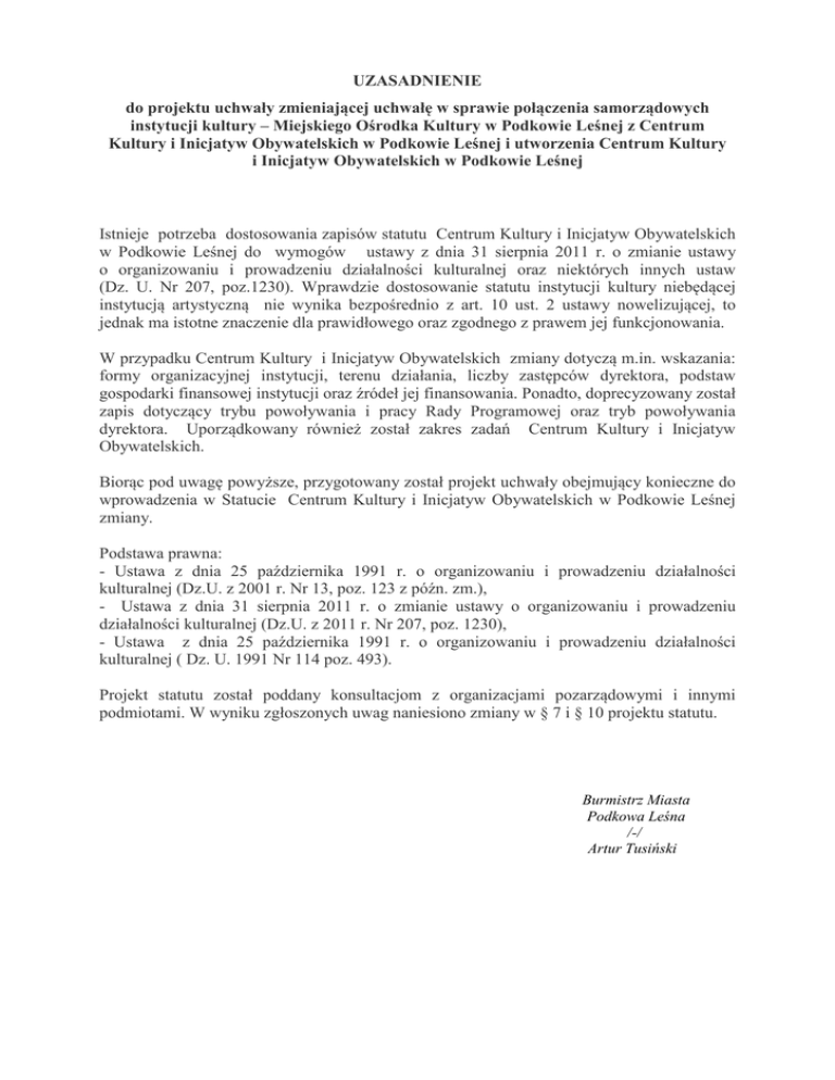 UZASADNIENIE do projektu uchwały zmieniającej uchwałę w sprawie połączenia samorządowych instytucji kultury – Miejskiego Ośrodka Kultury w Podkowie Leśnej z Centrum Kultury i Inicjatyw Obywatelskich w Podkowie Leśnej i utworzenia Centrum Kultury i Inicjatyw Obywatelskich w Podkowie Leśnej Istnieje potrzeba dostosowania zapisów statutu Centrum Kultury i Inicjatyw Obywatelskich w Podkowie Leśnej do wymogów ustawy z dnia 31 sierpnia 2011 r. o zmianie ustawy o organizowaniu i prowadzeniu działalności kulturalnej oraz niektórych innych ustaw (Dz. U. Nr 207, poz.1230). Wprawdzie dostosowanie statutu instytucji kultury niebędącej instytucją artystyczną nie wynika bezpośrednio z art. 10 ust. 2 ustawy nowelizującej, to jednak ma istotne znaczenie dla prawidłowego oraz zgodnego z prawem jej funkcjonowania. W przypadku Centrum Kultury i Inicjatyw Obywatelskich zmiany dotyczą m.in. wskazania: formy organizacyjnej instytucji, terenu działania, liczby zastępców dyrektora, podstaw gospodarki finansowej instytucji oraz źródeł jej finansowania. Ponadto, doprecyzowany został zapis dotyczący trybu powoływania i pracy Rady Programowej oraz tryb powoływania dyrektora. Uporządkowany również został zakres zadań Centrum Kultury i Inicjatyw Obywatelskich. Biorąc pod uwagę powyższe, przygotowany został projekt uchwały obejmujący konieczne do wprowadzenia w Statucie Centrum Kultury i Inicjatyw Obywatelskich w Podkowie Leśnej zmiany. Podstawa prawna: - Ustawa z dnia 25 października 1991 r. o organizowaniu i prowadzeniu działalności kulturalnej (Dz.U. z 2001 r. Nr 13, poz. 123 z późn. zm.), - Ustawa z dnia 31 sierpnia 2011 r. o zmianie ustawy o organizowaniu i prowadzeniu działalności kulturalnej (Dz.U. z 2011 r. Nr 207, poz. 1230), - Ustawa z dnia 25 października 1991 r. o organizowaniu i prowadzeniu działalności kulturalnej ( Dz. U. 1991 Nr 114 poz. 493). Projekt statutu został poddany konsultacjom z organizacjami pozarządowymi i innymi podmiotami. W wyniku zgłoszonych uwag naniesiono zmiany w § 7 i § 10 projektu statutu. Burmistrz Miasta Podkowa Leśna /-/ Artur Tusiński