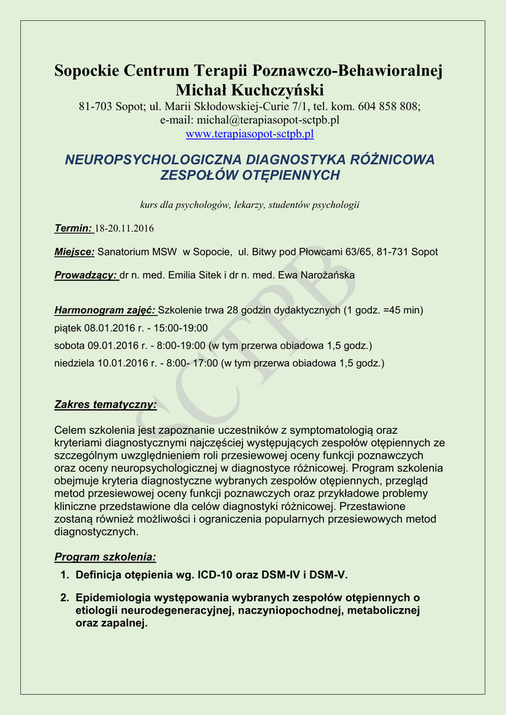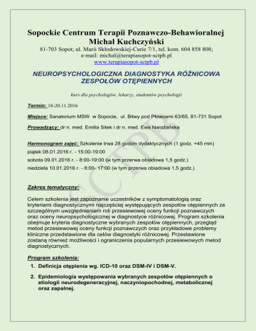 Sopockie Centrum Terapii Poznawczo-Behawioralnej Michał Kuchczyński 81-703 Sopot; ul. Marii Skłodowskiej-Curie 7/1, tel. kom. 604 858 808; e-mail: [email protected] www.terapiasopot-sctpb.pl NEUROPSYCHOLOGICZNA DIAGNOSTYKA RÓŻNICOWA ZESPOŁÓW OTĘPIENNYCH kurs dla psychologów, lekarzy, studentów psychologii Termin: 18-20.11.2016 Miejsce: Sanatorium MSW w Sopocie, ul. Bitwy pod Płowcami 63/65, 81-731 Sopot Prowadzący: dr n. med. Emilia Sitek i dr n. med. Ewa Narożańska Harmonogram zajęć: Szkolenie trwa 28 godzin dydaktycznych (1 godz. =45 min) piątek 08.01.2016 r. - 15:00-19:00 sobota 09.01.2016 r. - 8:00-19:00 (w tym przerwa obiadowa 1,5 godz.) niedziela 10.01.2016 r. - 8:00- 17:00 (w tym przerwa obiadowa 1,5 godz.) Zakres tematyczny: Celem szkolenia jest zapoznanie uczestników z symptomatologią oraz kryteriami diagnostycznymi najczęściej występujących zespołów otępiennych ze szczególnym uwzględnieniem roli przesiewowej oceny funkcji poznawczych oraz oceny neuropsychologicznej w diagnostyce różnicowej. Program szkolenia obejmuje kryteria diagnostyczne wybranych zespołów otępiennych, przegląd metod przesiewowej oceny funkcji poznawczych oraz przykładowe problemy kliniczne przedstawione dla celów diagnostyki różnicowej. Przestawione zostaną również możliwości i ograniczenia popularnych przesiewowych metod diagnostycznych. Program szkolenia: 1. Definicja otępienia wg. ICD-10 oraz DSM-IV i DSM-V. 2. Epidemiologia występowania wybranych zespołów otępiennych o etiologii neurodegeneracyjnej, naczyniopochodnej, metabolicznej oraz zapalnej. 3. Kryteria diagnostyczne i obraz kliniczny wybranych zespołów otępiennych. 4. Miejsce oceny neuropsychologicznej w diagnostyce zespołów otępiennych z perspektywy neurologa oraz psychologa. 5. Możliwości terapii farmakologicznej w wybranych zespołach otępiennych: wskazania do leczenia, skuteczność leczenia, efekt placebo, wpływ wybranych leków na funkcje poznawcze, objawy psychotyczne jako efekt uboczny farmakoterapii. 6. Specyfika diagnozy neuropsychologicznej w otępieniach: warunki badania, deficyty sensoryczno-motoryczne a dobór metod diagnostycznych, interpretacja wyników. 7. Zastosowanie przesiewowych metod oceny funkcji poznawczych w diagnostyce otępienia: Mini-Mental State Examination (MMSE), Test Rysowania Zegara, Addenbrooke’s Cognitive Examination-III (ACE-III), Skala Demencji Mattisa (DRS), Krótki Test Oceny Stanu Psychicznego (KTSP), Montreal Cognitive Assessment (MoCA), Clinical Dementia Rating (CDR), Frontal Assessment Battery. 8. Zastosowanie kwestionariuszy i ustrukturyzowanego wywiadu w diagnostyce otępienia: Skala Demencji Blesseda, Clinical Dementia Rating, Cambridge Behavioural Inventory-Revised. 9. Wykorzystanie wybranych skal do oceny objawów neuropsychiatrycznych Skala Oceny Depresji Montgomery-Asberg, Geriatryczna Skala Oceny Depresji, Inwentarz Depresji Becka, Skala Depresji Cornell, Inwentarz neuropsychiatryczny, Frontal Behavioural Inventory. 10.Wybrane problemy diagnostyki różnicowej: diagnostyka różnicowa choroby Alzheimera oraz otępienia z ciałami Lewy’ego, diagnostyka różnicowa choroby Alzheimera i otępienia czołowoskroniowego. Koszt szkolenia: 490,00 zł