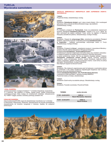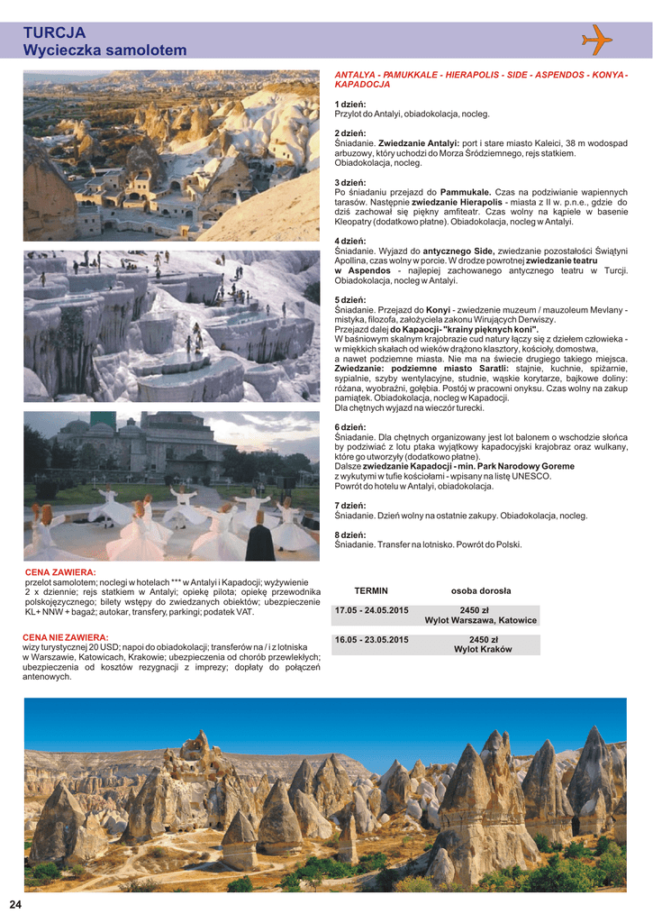 TURCJA Wycieczka samolotem ANTALYA - PAMUKKALE - HIERAPOLIS - SIDE - ASPENDOS - KONYA KAPADOCJA 1 dzieñ: Przylot do Antalyi, obiadokolacja, nocleg. 2 dzieñ: Œniadanie. Zwiedzanie Antalyi: port i stare miasto Kaleici, 38 m wodospad arbuzowy, który uchodzi do Morza Œródziemnego, rejs statkiem. Obiadokolacja, nocleg. 3 dzieñ: Po œniadaniu przejazd do Pammukale. Czas na podziwianie wapiennych tarasów. Nastêpnie zwiedzanie Hierapolis - miasta z II w. p.n.e., gdzie do dziœ zachowa³ siê piêkny amfiteatr. Czas wolny na k¹piele w basenie Kleopatry (dodatkowo p³atne). Obiadokolacja, nocleg w Antalyi. 4 dzieñ: Œniadanie. Wyjazd do antycznego Side, zwiedzanie pozosta³oœci Œwi¹tyni Apollina, czas wolny w porcie. W drodze powrotnej zwiedzanie teatru w Aspendos - najlepiej zachowanego antycznego teatru w Turcji. Obiadokolacja, nocleg w Antalyi. 5 dzieñ: Œniadanie. Przejazd do Konyi - zwiedzenie muzeum / mauzoleum Mevlany mistyka, filozofa, za³o¿yciela zakonu Wiruj¹cych Derwiszy. Przejazd dalej do Kapaocji- "krainy piêknych koni". W baœniowym skalnym krajobrazie cud natury ³¹czy siê z dzie³em cz³owieka w miêkkich ska³ach od wieków dr¹¿ono klasztory, koœcio³y, domostwa, a nawet podziemne miasta. Nie ma na œwiecie drugiego takiego miejsca. Zwiedzanie: podziemne miasto Saratli: stajnie, kuchnie, spi¿arnie, sypialnie, szyby wentylacyjne, studnie, w¹skie korytarze, bajkowe doliny: ró¿ana, wyobraŸni, go³êbia. Postój w pracowni onyksu. Czas wolny na zakup pami¹tek. Obiadokolacja, nocleg w Kapadocji. Dla chêtnych wyjazd na wieczór turecki. 6 dzieñ: Œniadanie. Dla chêtnych organizowany jest lot balonem o wschodzie s³oñca by podziwiaæ z lotu ptaka wyj¹tkowy kapadocyjski krajobraz oraz wulkany, które go utworzy³y (dodatkowo p³atne). Dalsze zwiedzanie Kapadocji - min. Park Narodowy Goreme z wykutymi w tufie koœcio³ami - wpisany na listê UNESCO. Powrót do hotelu w Antalyi, obiadokolacja. 7 dzieñ: Œniadanie. Dzieñ wolny na ostatnie zakupy. Obiadokolacja, nocleg. 8 dzieñ: Œniadanie. Transfer na lotnisko. Powrót do Polski. CENA ZAWIERA: przelot samolotem; noclegi w hotelach *** w Antalyi i Kapadocji; wy¿ywienie 2 x dziennie; rejs statkiem w Antalyi; opiekê pilota; opiekê przewodnika polskojêzycznego; bilety wstêpy do zwiedzanych obiektów; ubezpieczenie KL+ NNW + baga¿; autokar, transfery, parkingi; podatek VAT. CENA NIE ZAWIERA: wizy turystycznej 20 USD; napoi do obiadokolacji; transferów na / i z lotniska w Warszawie, Katowicach, Krakowie; ubezpieczenia od chorób przewlek³ych; ubezpieczenia od kosztów rezygnacji z imprezy; dop³aty do po³¹czeñ antenowych. 24 TERMIN osoba doros³a 17.05 - 24.05.2015 2450 z³ Wylot Warszawa, Katowice 16.05 - 23.05.2015 2450 z³ Wylot Kraków