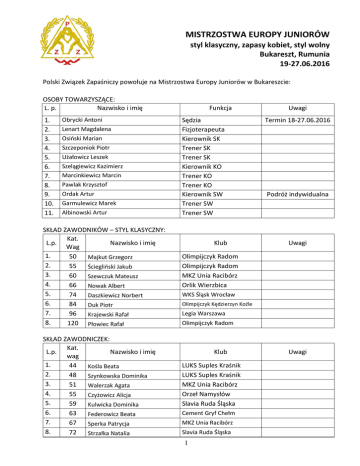 MISTRZOSTWA EUROPY JUNIORÓW styl klasyczny, zapasy kobiet, styl wolny Bukareszt, Rumunia 19-27.06.2016 Polski Związek Zapaśniczy powołuje na Mistrzostwa Europy Juniorów w Bukareszcie: OSOBY TOWARZYSZĄCE: L. p. Nazwisko i imię 1. 2. 3. 4. 5. 6. 7. 8. 9. 10. 11. Obrycki Antoni Lenart Magdalena Osiński Marian Szczeponiok Piotr Użałowicz Leszek Szelągiewicz Kazimierz Marcinkiewicz Marcin Pawlak Krzysztof Ordak Artur Garmulewicz Marek Albinowski Artur SKŁAD ZAWODNIKÓW – STYL KLASYCZNY: Kat. L.p. Nazwisko i imię Wag 1. 50 Majkut Grzegorz 2. 55 Ściegliński Jakub 3. 60 Szewczuk Mateusz 4. 66 Nowak Albert 5. 74 Daszkiewicz Norbert 6. 84 Duk Piotr 7. 96 Krajewski Rafał 8. 120 Płowiec Rafał SKŁAD ZAWODNICZEK: Kat. L.p. Nazwisko i imię wag 1. 44 Kośla Beata 2. 48 Szynkowska Dominika 3. 51 Walerzak Agata 4. 55 Czyżowicz Alicja 5. 59 Kulwicka Dominika 6. 63 Federowicz Beata 7. 67 Sperka Patrycja 8. 72 Strzałka Natalia Funkcja Sędzia Fizjoterapeuta Kierownik SK Trener SK Trener SK Kierownik KO Trener KO Trener KO Kierownik SW Trener SW Trener SW Klub Uwagi Termin 18-27.06.2016 Podróż indywidualna Uwagi Olimpijczyk Radom Olimpijczyk Radom MKZ Unia Racibórz Orlik Wierzbica WKS Śląsk Wrocław Olimpijczyk Kędzierzyn Koźle Legia Warszawa Olimpijczyk Radom Klub LUKS Suples Kraśnik LUKS Suples Kraśnik MKZ Unia Racibórz Orzeł Namysłów Slavia Ruda Śląska Cement Gryf Chełm MKZ Unia Racibórz Slavia Ruda Śląska 1 Uwagi SKŁAD ZAWODNIKÓW – STYL WOLNY: Kat. L.p. Nazwisko i imię wag 1. 50 Dobrodziej Robert 2. 55 Górzyński Adam 3. 60 Ołenczyn Patryk 4. 66 Grzybowski Łukasz 5. 74 Rybicki Kamil 6. 86 Sadowik Krzysztof 7. 96 Wawrzycki Arkadiusz 8. 120 Kościółek Kamil Klub Uwagi Budowlani Łódź Gryf Wojnowo Dąb Brzeźnica Stal Rzeszów Mazowsze Teresin Śląsk Milicz LMKS Krasnystaw Stal Rzeszów brak tolerancji wagowej Zbiórka w Warszawie (Port Lotniczy im. F. Chopina) na dwie godziny przed planowanym odlotem. Szczegóły przelotów: I. ZAPASY – STYL KLASYCZNY 19.06.2016 LO 645 Warszawa-Bukareszt wylot o godz. 14:25 (w Bukareszcie o 17:15); 23.06.2016 LO 642 Bukareszt-Warszawa wylot o godz. 14:50 (w Warszawie o 15:35). II. ZAPASY KOBIET 21.06.2016 LO 645 Warszawa-Bukareszt wylot o godz. 14:25 (w Bukareszcie o 17:15); 25.06.2016 LO 642 Bukareszt-Warszawa wylot o godz. 14:50 (w Warszawie o 15:35). III. ZAPASY – STYL WOLNY 23.06.2016 LO 645 Warszawa-Bukareszt wylot o godz. 14:25 (w Bukareszcie o 17:15); 27.06.2016 LO 642 Bukareszt-Warszawa wylot o godz. 14:50 (w Warszawie o 15:35). IV. Lenart Magdalena 19.06.2016 LO 645 Warszawa-Bukareszt wylot o godz. 14:25 (w Bukareszcie o 17:15); 27.06.2016 LO 642 Bukareszt-Warszawa wylot o godz. 14:50 (w Warszawie o 15:35). V. Obrycki Antoni 18.06.2016 LO 641 Warszawa-Bukareszt wylot o godz. 11:20 (w Bukareszcie o 14:10); 27.06.2016 LO 646 Bukareszt-Warszawa wylot o godz. 18:00 (w Warszawie o 18:45). 2 W przypadku braku możliwości uczestnictwa w zawodach prosimy o tym niezwłocznie powiadomić biuro PZZ na e-mail: [email protected] lub tel. (22) 6248111, 6240169. Zawodnik zobowiązany jest posiadać aktualne badania lekarskie oraz paszport ważny minimum 6 miesięcy. Przysługuje zwrot kosztów podróży (PKP II kl. posp. lub PKS) na podstawie załączonego biletu (bez kosztów diety i dojazdów) przesłanego zgodnie z obowiązującymi przepisami do biura PZZ w Warszawie w terminie nieprzekraczającym 14 dni od dnia zakończenia akcji. Od 1 stycznia 2007 r. obywatele polscy mogą wjeżdżać do Rumunii i przebywać w niej przez 90 dni, liczonych w ciągu 6 miesięcy od daty pierwszego wjazdu, oraz przejeżdżać tranzytem przez terytorium tego kraju na podstawie ważnego paszportu lub dowodu osobistego. Obywatele polscy korzystają z prawa do swobodnego przepływu osób w ramach Unii Europejskiej/Europejskiego Obszaru Gospodarczego. (pełna informacja dostępna pod adresem: http://polakzagranica.msz.gov.pl/Rumunia,ROU.html) 3