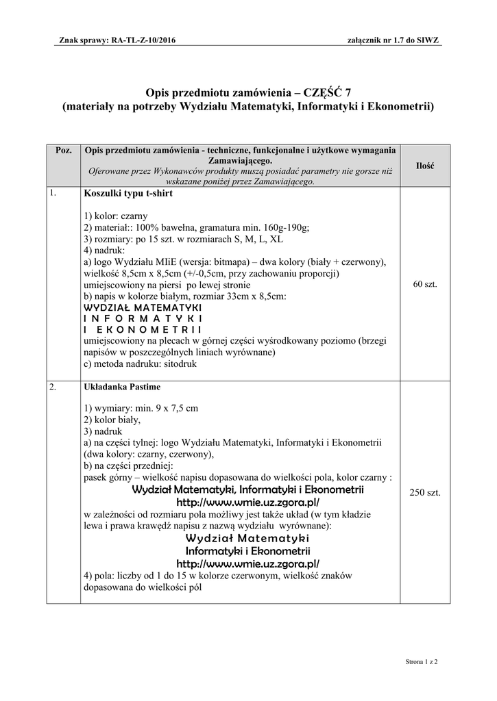 załącznik nr 1.7 do SIWZ Znak sprawy: RA-TL-Z-10/2016 Opis przedmiotu zamówienia – CZĘŚĆ 7 (materiały na potrzeby Wydziału Matematyki, Informatyki i Ekonometrii) Poz. 1. Opis przedmiotu zamówienia - techniczne, funkcjonalne i użytkowe wymagania Zamawiającego. Oferowane przez Wykonawców produkty muszą posiadać parametry nie gorsze niż wskazane poniżej przez Zamawiającego. Koszulki typu t-shirt 1) kolor: czarny 2) materiał:: 100% bawełna, gramatura min. 160g-190g; 3) rozmiary: po 15 szt. w rozmiarach S, M, L, XL 4) nadruk: a) logo Wydziału MIiE (wersja: bitmapa) – dwa kolory (biały + czerwony), wielkość 8,5cm x 8,5cm (+/-0,5cm, przy zachowaniu proporcji) umiejscowiony na piersi po lewej stronie b) napis w kolorze białym, rozmiar 33cm x 8,5cm: WYDZIAŁ MATEMATYKI I N F O R M A T Y K I I E K O N O M E T R I I umiejscowiony na plecach w górnej części wyśrodkowany poziomo (brzegi napisów w poszczególnych liniach wyrównane) c) metoda nadruku: sitodruk 2. Ilość 60 szt. Układanka Pastime 1) wymiary: min. 9 x 7,5 cm 2) kolor biały, 3) nadruk a) na części tylnej: logo Wydziału Matematyki, Informatyki i Ekonometrii (dwa kolory: czarny, czerwony), b) na części przedniej: pasek górny – wielkość napisu dopasowana do wielkości pola, kolor czarny : Wydział Matematyki, Informatyki i Ekonometrii http://www.wmie.uz.zgora.pl/ 250 szt. w zależności od rozmiaru pola możliwy jest także układ (w tym kładzie lewa i prawa krawędź napisu z nazwą wydziału wyrównane): W y d z ia ł M a t ema t y k i Informatyki i Ekonometrii http://www.wmie.uz.zgora.pl/ 4) pola: liczby od 1 do 15 w kolorze czerwonym, wielkość znaków dopasowana do wielkości pól Strona 1 z 2 załącznik nr 1.7 do SIWZ Znak sprawy: RA-TL-Z-10/2016 3. Power Bank 1)wielkość: kształt podłużny (min. 9.5 cm x 2.1 cm x 2.1 cm z dokładnością +/-5%), 2) przekrój poprzeczny kwadratowy lub okrągły, 3) pojemność min. 2000mAh, minimalny prąd ładowania: 1000mA 4) gniazdo USB (pełnowymiarowe) z napięciem wyjściowym i gniazdo micro USB do ładowania urządzenia, 5) dołączony kabel USB-micro USB 6) kolor: niebieski 7) nadruk w kolorze białym o wymiarach min. 40mm x 10mm 40 szt. Wydział Matematyki, Informatyki i Ekonometrii http://www.wmie.uz.zgora.pl/ w zależności od rozmiaru pola możliwy jest także układ (w tym układzie lewa i prawa krawędź napisu z nazwą wydziału wyrównane): W y d z ia ł M a t ema t y k i Informatyki i Ekonometrii http://www.wmie.uz.zgora.pl/ 4. Pamięć USB (PenDrive) w kształcie karty kredytowej, 1) wymiary 8,5cm x 5.5cm 2) pojemność min. 4GB, interface USB 2.0 lub wyższy 3) opakowanie: folia 4) druk jednostronny, full color, wg wzoru dostarczonego przez Zamawiającego 40 szt. Strona 2 z 2