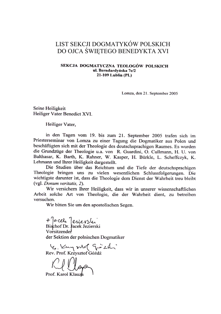 list sekcji dogmatyków polskich do ojca świętego benedykta xvi