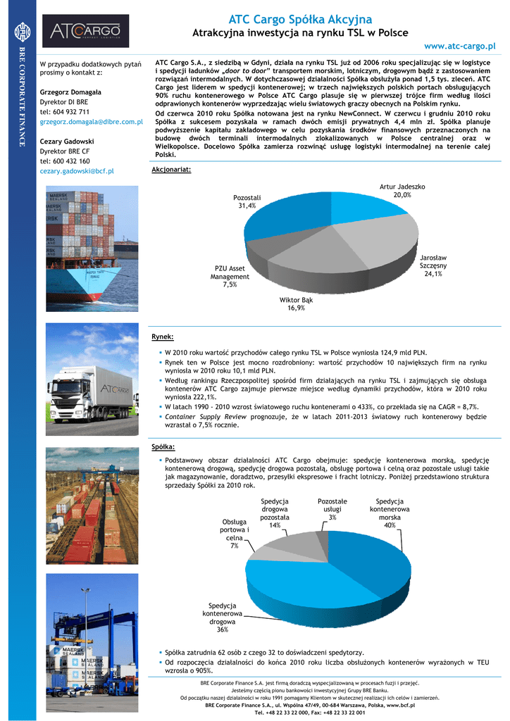ATC Cargo Spółka Akcyjna Atrakcyjna inwestycja na rynku TSL w Polsce www.atc-cargo.pl W przypadku dodatkowych pytań prosimy o kontakt z: Grzegorz Domagała Dyrektor DI BRE tel: 604 932 711 [email protected] Cezary Gadowski Dyrektor BRE CF tel: 600 432 160 [email protected] ATC Cargo S.A., z siedzibą w Gdyni, działa na rynku TSL już od 2006 roku specjalizując się w logistyce i spedycji ładunków „door to door” transportem morskim, lotniczym, drogowym bądź z zastosowaniem rozwiązań i ń intermodalnych. i t d l h W dotychczasowej d t h j działalności d i ł l ś i Spółka S ółk obsłużyła b ł ż ł ponad d 1,5 1 5 tys. t zleceń. l ń ATC Cargo jest liderem w spedycji kontenerowej; w trzech największych polskich portach obsługujących 90% ruchu kontenerowego w Polsce ATC Cargo plasuje się w pierwszej trójce firm według ilości odprawionych kontenerów wyprzedzając wielu światowych graczy obecnych na Polskim rynku. Od czerwca 2010 roku Spółka notowana jest na rynku NewConnect. W czerwcu i grudniu 2010 roku Spółka z sukcesem pozyskała w ramach dwóch emisji prywatnych 4,4 mln zł. Spółka planuje podwyższenie kapitału zakładowego w celu pozyskania środków finansowych przeznaczonych na budowę dwóch terminali intermodalnych zlokalizowanych w Polsce centralnej oraz w Wielkopolsce. Docelowo Spółka zamierza rozwinąć usługę logistyki intermodalnej na terenie całej Polski. Akcjonariat: Artur Jadeszko 20,0% Pozostali 31,4% Jarosław Szczęsny 24,1% PZU Asset Management 7,5% Wiktor Bąk 16,9% Rynek: W 2010 roku wartość przychodów całego rynku TSL w Polsce wyniosła 124,9 mld PLN. Rynek ten w Polsce jest mocno rozdrobniony: wartość przychodów 10 największych firm na rynku wyniosła w 2010 roku 10,1 mld PLN. Według rankingu Rzeczpospolitej spośród firm działających na rynku TSL i zajmujących się obsługa kontenerów ATC Cargo zajmuje pierwsze miejsce według dynamiki przychodów, która w 2010 roku wyniosła y 222,1%. , W latach 1990 - 2010 wzrost światowego ruchu kontenerami o 433%, co przekłada się na CAGR = 8,7%. Container Supply Review prognozuje, że w latach 2011-2013 światowy ruch kontenerowy będzie wzrastał o 7,5% rocznie. Spółka: Podstawowy obszar działalności ATC Cargo obejmuje: spedycję kontenerowa morską, spedycję kontenerową drogową, spedycję drogowa pozostałą, obsługę portowa i celną oraz pozostałe usługi takie jak magazynowanie, doradztwo, przesyłki ekspresowe i fracht lotniczy. Poniżej przedstawiono struktura sprzedaży Spółki za 2010 rok. Obsługa portowa i celna 7% Spedycja drogowa pozostała 14% Pozostałe usługi 3% Spedycja kontenerowa morska 40% Spedycja kontenerowa drogowa 36% Spółka zatrudnia 62 osób z czego 32 to doświadczeni spedytorzy. Od rozpoczęcia działalności do końca 2010 roku liczba obsłużonych kontenerów wyrażonych w TEU wzrosła o 905%. BRE Corporate Finance S.A. jest firmą doradczą wyspecjalizowaną w procesach fuzji i przejęć. Jesteśmy częścią pionu bankowości inwestycyjnej Grupy BRE Banku. Od początku naszej działalności w roku 1991 pomagamy Klientom w skutecznej realizacji ich celów i zamierzeń. BRE Corporate Finance S.A., ul. Wspólna 47/49, 00-684 Warszawa, Polska, www.bcf.pl Tel. +48 22 33 22 000, Fax: +48 22 33 22 001 ATC Cargo Spółka Akcyjna Atrakcyjna inwestycja na rynku TSL w Polsce www.atc-cargo.pl W przypadku dodatkowych pytań prosimy o kontakt z: Grzegorz Domagała Dyrektor DI BRE tel: 604 932 711 [email protected] Cezary Gadowski Dyrektor BRE CF tel: 600 432 160 [email protected] Wybrane dane finansowe: tys. PLN Pr zycho dy ze spr zedaży Koszty oper acyjne EBIT Kos zty fin an s owe Podatek dochodowy W ynik netto M arża wyn iku n etto % Aktyw a tr w ałe Aktyw a obr otow e, w tym: nalezności ś kr ótkoter ó minow e A k tyw a r azem Kapitał w łasny Zobow iązania i r ezer w y, w tym: Zobow iązania opr ocentow ane Pasyw a r azem ROE Kapitał w łasny / aktyw a Dźw ignia finansow a [D/E] 2007 18 889 18 493 436 31 96 409 2,2% 2008 31 333 30 899 346 200 89 121 0,4% 2009 35 603 34 900 646 273 134 301 0,8% 2010 79 058 76 535 2 000 299 453 1 358 1,7% H1 10 35 206 34 070 946 142 226 721 2,0% H1 11 42 324 40 742 1 619 121 320 1 286 3,0% 227 3 288 2 965 3 515 546 2 969 657 3 515 1 192 8 693 5 225 9 885 556 9 329 2 092 9 885 1 230 11 734 8 299 12 964 873 12 091 2 057 12 964 2 632 23 326 13 131 25 958 5 135 19 502 2 456 24 637 2 277 19 852 15 943 22 130 3 835 18 295 3 958 22 130 4 260 26 126 15 954 30 386 7 741 22 645 3 427 30 386 75,0% 15,5% 120,3% 21,8% 5,6% 376,3% 34,5% 6,7% 235,7% 26,4% 19,8% 47,8% 37,6% 17,3% 103,2% 33,2% 25,5% 44,3% Transport Intermodalny: Długoterminowa strategia Spółki zakłada dynamiczny rozwój firmy zarówno w kraju jak i za granicą poprzez oferowanie usług związanych z transportem intermodalnym (przewóz wykonywany w głównej części trasy transportem kolejowym lub morskim, gdzie część początkowa i/lub końcowa odbywa się transportem drogowym). Strategia będzie realizowana poprzez wybudowanie i uruchomienie sieci terminali intermodalnych w strategicznych punktach Polski, a także uruchomienie regularnych połączeń kolejowych pomiędzy portami morskimi a terminalami intermodalnymi. W 2011 roku Spółka planuję budowę 2 terminali intermodalnych: w woj. woj łódzkim oraz Wielkopolskim, Wielkopolskim w których obecnym i perspektywicznym klientom zaoferowana zostanie usługa transportu intermodalnego. Dynamika rozwoju transportu intermodalnego w Polsce w 2010 roku wyniosła 19,3%. Wpływ na szybki rozwój transportu intermodalnego w Polsce mają: (i) niższe stawki oferowane klientom, (ii) rozszerzenie zakresu opłat za dostęp do infrastruktury drogowej, (iii) centralne położenie Polski na styku europejskich tras przewozowych, (iv) zły stan sieci drogowej w Polsce, (v) szybko rozwijająca się gospodarka i handel z krajami Unii, (vi) poważne rezerwy zdolności przewozowej polskiego transpor