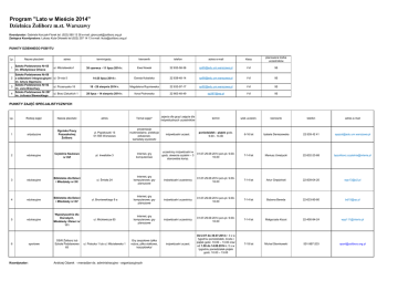 Program "Lato w Mieście 2014" Dzielnica Żoliborz m.st. Warszawy Koordynator: Gabriela Korczak-Florek tel. (022) 560 13 38 e-mail: [email protected] Zastępca Koordynatora: Łukasz Kula-Orłowski tel (022) 207 14 13 e-mail: [email protected] PUNKTY DZIENNEGO POBYTU Lp. 1 Nazwa placówki Szkoła Podstawowa Nr 65 im. Władysława Orkana adres ul. Mścisławska1 Szkoła Podstawowa Nr 68 2 z oddziałami integracyjnymi ul. Or-ota 5 im. Artura Oppmana Szkoła Podstawowa Nr 92 3 ul. Przasnyska 18 im. Jana Brzechwy Szkoła Podstawowa Nr 267 4 ul. Braci Załuskich 1 im. Juliusza Słowackiego termin/godz. kierownik telefon adres e-mail klasy planowana liczba uczestników 30 czerwca - 11 lipca 2014 r. Ewa Nowak 22 833-58-36 [email protected] I-VI 95 14-25 lipca 2014 r. Dorota Kubalska 22 839-48-14 [email protected] I-VI 95 18 - 29 sierpnia 2014 r. Magdalena Rupniewska 22 633-97-17 [email protected] I-VI 95 28 lipca - 14 sierpnia 2014 r. Ilona Piotrowska 22 663-48-49 [email protected] I-VI 95 PUNKTY ZAJĘĆ SPECJALISTYCZNYCH Rodzaj zajęć Nazwa placówki adres Temat zajęć* zajecia dla grup/ zajęcia dla indywidualnych uczestników termin wiek uczestn. kierownik telefon adres e-mail 1 artystyczne Ognisko Pracy Pozaszkolnej Żoliborz ul. Popiełuszki 13 01-595 Warszawa prezentacje multimedialne, prelekcje pokazowe, warsztaty,wycieczki indywidualni uczest. poniedziałek - piątek godz. 9.00 - 14.00 6-16 lat Izabela Deniszewska 22 839 42 41 [email protected] 2 edukacyjne Czytelnia Naukowa nr XVI pl. Inwalidów 3 Internet, gry komputerowe uczestnicy indywidualni w godz. otwarcia czytelni – 3 stanowiska komp. 01.07-29.08 2014 pon-pt. 9.0016.00 7-14 lat Mariusz Unieżycki 22-832-23-68 [email protected] 3 edukacyjne Biblioteka dla Dzieci i Młodzieży nr XX ul. Śmiała 24 Internet, gry komputerowe, gry planszowe indywidualni uczestnicy 01.07-29.08 2014 pon-pt. 9.0016.00 7-14 lat Artur Grędziński 22-839-04-20 [email protected] 4 edukacyjne Biblioteka dla Dzieci i Młodzieży nr XV ul. Broniewskiego 9 a Internet, gry komputerowe, gry planszowe indywidualni uczestnicy 01.07-29.08 2014 pon-pt. 9.0016.00 7-14 lat Bożena Bereda 22-633-90-80 [email protected] edukacyjne Wypożyczalnia dla Dorosłych, Młodzieży i Dzieci nr 111 ul. Mickiewicza 65 Internet, gry komputerowe, gry planszowe indywidualni uczestnicy 01.07-29.08 2014 pon-pt. 9.0016.00 7-14 lat Małgorzata Kocot 22-400-94-24 [email protected] sportowe OSiR Żoliborz lub Szkoła Podstawowa 65 ul. Potocka 1 lub ul. Mścisławska 1 Gry zespołowe /piłka nożna, piłka siatkowa, koszykówka/ indywidualni uczest. Od 2.07 do 30.07.2014 r. 3 x w tygodniu poniedziałek, środa i piątek godz. 10.00 – 13.00 oraz od 1.08 do 14.08.2014 r. 5 x w tygodniu poniedziałek-piątek godz. 10.00 – 13.00 7-19 lat Michał Słomkowski 501-987-203 [email protected] Lp. 5 6 Koordynator: Andrzej Ożarek - menadżer ds. administracyjno - organizacyjnych ZAJĘCIA W DZIELNICOWYM OŚRODKU SPORTU I REKREACJI Placówka adres Temat zajęć* zajecia dla grup/ zajęcia dla indywidualnych uczestników termin 30.06. - 22.08.2014r. godz. Ośrodek Sportu i Rekreacji 01-652 Warszawa ul. m. st. Warszawy w Dzielnicy Potocka 1 Żoliborz indywidualne 40 minutowe zajęcia rekreacyjne na pływalni Ośrodka 9:00 - 9:50; godz. 13:00 13:50; godz. 14:00 - 14:50 1 Wydarzenie (impreza) miejsce, adres POCZTA POWSTAŃCZA Impreza sportowo rekreacyjna dla dzieci i Park Kępa Potocka młodzieży z okazji 70 rocznicy wybuchu Powstania Warszawskiego kierownik telefon adres e-mail Andrzej Ożarek 22 832-46-04; 797-318-624 [email protected] 7 - 18 lat (dzieci i młodzież szkół podstawowych, gimnazjalnych i ponad gimnazjalnych) wejście na legitymację szkolną 30.06. - 22.08.2014r. godz. 7 - 18 lat (dzieci i młodzież szkół grupowe 10:00 - 10:50; godz. 11:00 11:50; godz. 12:00 - 12:50 podstawowych, gimnazjalnych i ponad gimnazjalnych) termin dla kogo? kontakt z organizatorem 30 lipca 2014 r. godz. 10.00 13.00 Młodzież 6-19 lat /22/ 560-13-25 WYDARZENIA (IMPREZY) DZIELNICOWE O CHARAKTERZE OTWARTYM Lp. wiek uczestników