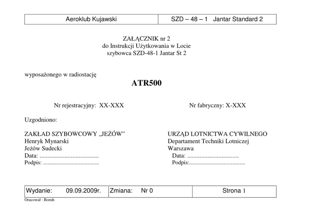 Aeroklub Kujawski SZD – 48 – 1 Jantar Standard 2 ZAŁĄCZNIK nr 2 do Instrukcji Użytkowania w Locie szybowca SZD-48-1 Jantar St 2 wyposażonego w radiostację ATR500 Nr rejestracyjny: XX-XXX Nr fabryczny: X-XXX Uzgodniono: ZAKŁAD SZYBOWCOWY „JEŻÓW” Henryk Mynarski Jeżów Sudecki Data: ...................................... URZĄD LOTNICTWA CYWILNEGO Departament Techniki Lotniczej Warszawa Data: ................................. Podpis: ....................................... Wydanie: Oracował : Boruh 09.09.2009r. Podpis:....................................... Zmiana: Nr 0 Strona 1 Aeroklub Kujawski SZD – 48 – 1 Jantar Standard 2 Spis treści: 1. Strona tytułowa 2. Spis treści 3. Wykaz wprowadzonych zmian 4. Dane techniczne radiostacji ATR500 5. Szkic usytuowania instalacji radiostacji ATR500 na szybowcu 6. Wykaz elementów radiostacji ATR500 7. Obsługa radiostacji ATR500 8. Schemat instalacji radiostacji ATR500 9. Opis instalacji radiostacji ATR500 10. Montaż i demontaż radiostacji ATR500 1 2 3 4 5 6 7 10 11 12 UWAGA! Niniejszy ZAŁĄCZNIK dotyczy wyłącznie instalowania radiostacji ATR500 w szybowcu SZD – 48 -1 Jantar St. 2 oraz jej uruchomienia. Wydanie: Oracował : Boruh 09.09.2009r. Zmiana: Nr 0 Strona 2 Aeroklub Kujawski SZD – 48 – 1 Jantar Standard 2 3. Wykaz wprowadzonych zmian UWAGA! Miejsca, w którym tekst uległ zmianie, jest zaznaczone pionową linią po lewej stronie tekstu oraz numerem zmiany. Lp. Strona Wydanie: Oracował : Boruh Zmiana 09.09.2009r. Zmiana: Nr 0 Data Strona 3 Podpis Aeroklub Kujawski SZD – 48 – 1 Jantar Standard 2 4. Dane techniczne radiostacji ATR500: Odbiornik umieszczony jest w lewej części tablicy przyrządów. Wyposażony jest w ciekłokrystaliczny dwuliniowy wyświetlacz. Dane techniczne urządzenia: Odległość gwarantowanej łączności radiostacji ATR500 wynosi 90-100 km przy wysokości 1000 m. zakres częstotliwości..................................118,00-136,00MHz separacja częstotliwości..............................25KHz jest możliwe zaprogramowanie...................9 kanałów moc nadajnika...............................................5,5 W pobór mocy..................................................2,5 A Wydanie: Oracował : Boruh 09.09.2009r. Zmiana: Nr 0 Strona 4 Aeroklub Kujawski SZD – 48 – 1 Jantar Standard 2 5. Szkic usytuowania instalacji radiostacji ATR500 na szybowcu Wydanie: Oracował : Boruh 09.09.2009r. Zmiana: Nr 0 Strona 5 Aeroklub Kujawski SZD – 48 – 1 Jantar Standard 2 6. Wykaz elementów instalacji radiostacji ATR500 1. Radiostacja ATR500 2. Głośnik 3. Mikrofon 4. Rozgałęźnik 5. Złącze elektryczne instalacji radiostacji 6. Antena z wtykiem koncentrycznym 7. Kabel antenowy z wtykiem koncentrycznym 8. Przycisk „nadawanie” i przewody 9. Zasilacz bateryjny RS-6101/1 10. Podstawa mocująca zasilacz Wydanie: Oracował : Boruh 09.09.2009r. Zmiana: Nr 0 Strona 6 Aeroklub Kujawski SZD – 48 – 1 Jantar Standard 2 7. Obsługa radiostacji ATR500 a) Na manipulatorze (pulpicie sterowania) znajdują się : 1. MEM/SET Pokrętło zmiany (wyboru) częstotliwości z pamięci urządzenia (M1...M9) 2. Pokrętło zmiany wartości aktualnych parametrów 3. VOL/SQ wybór parametrów pracy (VOL/SQ/VOX/DIM/CON) 4. STORE Przycisk zapamiętywania częstotliwości 5. ON włącznik / wyłącznik radiostacji 6. Wybór zakresu MHz/kHz 7. Zmiana częstotliwości Active/Stand-by Wydanie: Oracował : Boruh 09.09.2009r. Zmiana: Nr 0 Strona 7 Aeroklub Kujawski SZD – 48 – 1 Jantar Standard 2 b) Uruchomianie radiostacji: Skrócona instrukcja użytkowania radiostacji ATR500 Poszczególne punkty opisują jak należy posługiwać się radiostacją w podstawowych funkcjach. Więcej zaawansowanych funkcji zawiera podręcznik użytkownika radiostacji. Włączanie radiostacji - W celu włączenia radiostacji przycisnąć klawisz ON (5). i przytrzymać około 0,5 sekundy Wyłączanie radiostacji - W celu wyłączenia ponownie nacisnąć ON (5) i przytrzymać około 3 sekundy. Ustawienie głośności – Przycisnąć VOL/SQ, (3) aż do uzyskania na wyświetlaczu napisu VOL:”wartość”. ustawić odpowiednią głośność pokręcając pokrętłem zmiany wartości (2). W zakresie od 01 do 16. Redukcja szumów - przycisnąć VOL/SQ, (3) aż do uzyskania na wyświetlaczu napisu SQ:”wartość”. ustawić odpowiednią wartość pokręcając zmiany wartości (2). W zakresie od 01 do 10. UWAGA!!! Wartość SQ powyżej 03 może powodować tłumienie słabych sygnałów Ręczne ustawianie częstotliwości – ustawić pokrętło MEM (1) w pozycji SET. Przekręcając pokrętło zmiany wartości (2). ustawić żądaną częstotliwość. W celu aktywacji ustawionej częstotliwości należy nacisnąć klawisz (7) z prawej strony pulpitu. Wybrana częstotliwość jest przeniesiona na górny panel i gotowa do użycia. Wydanie: Oracował : Boruh 09.09.2009r. Zmiana: Nr 0 Strona 8 Aeroklub Kujawski SZD – 48 – 1 Jantar Standard 2 Ustawianie częstotliwości z pamięci radiostacji – Ustawić pokrętło MEM (1) w wybranej pozycji od M1 do M9 Zapisana częstotliwość jest od razu aktywna i gotowa do użycia Zaprogramowanie nowej częstotliwości – Wybierz częstotliwość ręcznie zgodnie z punktem „5” (patrz wyżej) wybierz pokrętłem MEM (1) pozycje od M1 do M9. Naciśnij STORE (4) w celu zapisania nowej częstotliwości Nadawanie – Po naciśnięciu przycisku nadawania wyświetla się ikona T na wyświetlaczu wyświetlacza. Odbieranie sygnału – kiedy radiostacja odbiera sygnał wyświetla się ikona R. Miejsce Celowo Pozostawione puste Wydanie: Oracował : Boruh 09.09.2009r. Zmiana: Nr 0 Strona 9 Aeroklub Kujawski S. SZD – 48 – 1 Jantar Standard 2 Schemat instalacji radiostacji ATR500 Wydanie: Oracował : Boruh 09.09.2009r. Zmiana: Nr 0 Strona 10 Aeroklub Kujawski SZD – 48 – 1 Jantar Standard 2 9. Opis instalacji radiostacji ATR500 a) Przycisk „nadawanie zamontowany jest na drążku sterow