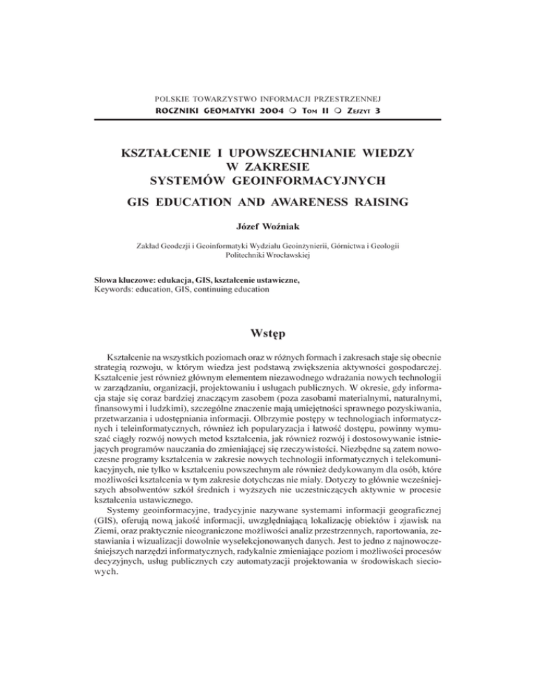 TOWARZYSTWO PRZESTRZENNEJ Kszta³ceniePOLSKIE i upowszechnianie wiedzy w INFORMACJI zakresie systemów geoinformacyjnych ROCZNIKI GEOMATYKI 2004 m T OM II m ZESZYT 3 67 KSZTA£CENIE I UPOWSZECHNIANIE WIEDZY W ZAKRESIE SYSTEMÓW GEOINFORMACYJNYCH GIS EDUCATION AND AWARENESS RAISING Józef Woniak Zak³ad Geodezji i Geoinformatyki Wydzia³u Geoin¿ynierii, Górnictwa i Geologii Politechniki Wroc³awskiej S³owa kluczowe: edukacja, GIS, kszta³cenie ustawiczne, Keywords: education, GIS, continuing education Wstêp Kszta³cenie na wszystkich poziomach oraz w ró¿nych formach i zakresach staje siê obecnie strategi¹ rozwoju, w którym wiedza jest podstaw¹ zwiêkszenia aktywnoci gospodarczej. Kszta³cenie jest równie¿ g³ównym elementem niezawodnego wdra¿ania nowych technologii w zarz¹dzaniu, organizacji, projektowaniu i us³ugach publicznych. W okresie, gdy informacja staje siê coraz bardziej znacz¹cym zasobem (poza zasobami materialnymi, naturalnymi, finansowymi i ludzkimi), szczególne znaczenie maj¹ umiejêtnoci sprawnego pozyskiwania, przetwarzania i udostêpniania informacji. Olbrzymie postêpy w technologiach informatycznych i teleinformatycznych, równie¿ ich popularyzacja i ³atwoæ dostêpu, powinny wymuszaæ ci¹g³y rozwój nowych metod kszta³cenia, jak równie¿ rozwój i dostosowywanie istniej¹cych programów nauczania do zmieniaj¹cej siê rzeczywistoci. Niezbêdne s¹ zatem nowoczesne programy kszta³cenia w zakresie nowych technologii informatycznych i telekomunikacyjnych, nie tylko w kszta³ceniu powszechnym ale równie¿ dedykowanym dla osób, które mo¿liwoci kszta³cenia w tym zakresie dotychczas nie mia³y. Dotyczy to g³ównie wczeniejszych absolwentów szkó³ rednich i wy¿szych nie uczestnicz¹cych aktywnie w procesie kszta³cenia ustawicznego. Systemy geoinformacyjne, tradycyjnie nazywane systemami informacji geograficznej (GIS), oferuj¹ now¹ jakoæ informacji, uwzglêdniaj¹c¹ lokalizacjê obiektów i zjawisk na Ziemi, oraz praktycznie nieograniczone mo¿liwoci analiz przestrzennych, raportowania, zestawiania i wizualizacji dowolnie wyselekcjonowanych danych. Jest to jedno z najnowoczeniejszych narzêdzi informatycznych, radykalnie zmieniaj¹ce poziom i mo¿liwoci procesów decyzyjnych, us³ug publicznych czy automatyzacji projektowania w rodowiskach sieciowych. 68 Józef Woniak Modernizacja kszta³cenia Jestemy w pierwszym etapie budowy europejskiego modelu kszta³cenia, wed³ug tzw. Procesu Boloñskiego okrelanego takimi dokumentami, jak Deklaracja Boloñska, Komunikat Praski oraz Komunikat Berliñski. Najwiêksze polskie uczelnie s¹ w trakcie budowy nowej struktury kszta³cenia, opartej na dwustopniowym lub trójstopniowym systemie kszta³cenia (studia in¿ynierskie, magisterskie i doktoranckie), z uwzglêdnieniem wiêkszej mobilnoci studentów i nauczycieli akademickich oraz realizacji programów edukacyjnych wspólnie z renomowanymi uczelniami zagranicznymi (SPORZL, 2002; Strategia rozwoju, 2001). Najgorzej jest ze studiowaniem poza macierzyst¹ uczelni¹. Pod tym wzglêdem Polska jest na szarym koñcu, przy redniej 2,3% dla Europy Zachodniej u nas tylko 0,6% studentów wykazuje siê tak¹ mobilnoci¹. Tylko trzech na tysi¹c polskich studentów korzysta co roku z programu Sokrates, oferuj¹cego czêæ studiów za granic¹. Jedn¹ z przyczyn tego stanu rzeczy s¹ istniej¹ce struktury organizacyjne i unormowania prawne uczelni pañstwowych, które nie motywuj¹ do budowy i realizacji programów kszta³cenia gwarantuj¹cych wysoki poziom wykszta³conych absolwentów. Znacznie lepsza sytuacja jest w organizacji studiów podyplomowych, gdzie zarówno przygotowywane programy, obsada zajêæ jak i organizacja studiów ma charakter mened¿erski, autorski, z du¿¹ wspó³prac¹ miêdzyuczelnian¹ i udzia³em specjalistów z firm komercyjnych. Edukacja w zakresie systemów GIS, podobnie jak w zakresie systemów IT i ICT wymaga strategicznych i metodycznych dzia³añ maj¹cych na celu przygotowanie kadry u¿ytkowników i kadry zarz¹dzaj¹cej do efektywnego wykorzystywania i wdra¿anych systemów. Dzia³ania te musz¹ byæ prowadzone równolegle, w zakresie kszta³cenia stacjonarnego (od szkó³ ponadpodstawowych, rednich, do szkó³ wy¿szych) oraz w zakresie kszta³cenia ustawicznego (Woniak, 2004). Nale¿y je rozpatrywaæ jako czêæ programu powszechnej edukacji informatycznej spo³eczeñstwa, g³ównie administracji publicznej oraz bezrobotnych czy zagro¿onych bezrobociem. Dowiadczenia krajowe i zagraniczne w tym zakresie jednoznacznie wskazuj¹ na koniecznoæ szerokiej wspó³pracy orodków akademickich, firm specjalistycznych i instytutów resortowych w budowie i realizacji programów edukacyjnych. Bezporednio z edukacj¹ geoinformatyczn¹, zwi¹zany jest temat popularyzacji tych systemów. Najwa¿niejszymi warunkami powodzenia tak du¿ego i trudnego zadania, jakim jest szybsze nad¹¿anie edukacji i popularyzacji za bardzo szybko rozwijaj¹cymi siê technologiami geoinformatycznymi, s¹: m wspó³praca orodków naukowo-dydaktycznych (g³ównie uczelni publicznych i niepublicznych) z administracj¹ samorz¹dow¹ i rz¹dow¹ oraz zak³adami przemys³owymi w zakresie wdra¿ania nowych technologii informatycznych, m cilejsza wspó³praca miêdzywydzia³owa i miêdzyuczelniana orodków dydaktycznych z firmami geoinformatycznymi w przygotowywaniu i realizacji programu edukacyjnego, m stworzenie formalno-prawnych i organizacyjnych warunków umo¿liwiaj¹cych powstawanie struktur organizacyjnych, przyjmuj¹cych rolê integratora w budowie, popularyzacji i rozwijaniu systemów GIS w gminie, powiecie, regionie, czy zak³adzie przemys³owym. Kszta³cenie i upowszechnianie wiedzy w zakresie systemów geoinformacyjnych 69 W budowanych i wdra¿anych projektach geoinformacyjnych, program kszta³cenia w zakresie budowy, zarz¹dzania, a przede wszystkim w zakresie wykorzystywania systemów geoinformacyjnych powinien stanowiæ zintegrowan¹ czêæ szerokiego p