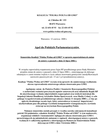 KOALICJA "POLSKA WOLNA OD GMO" ul. Chłodna 48 / 153 00-872 Warszawa tel. 22 654 45 93 fax 22 654 45 92 www.polska-wolna-od-gmo.org Warszawa 12 czerwca 2008 r. Apel do Polskich Parlamentarzystów Stanowisko Koalicji "Polska Wolna od GMO" w sprawie zapowiedzianych zmian do ustawy o paszach z dnia 22 lipca 2006 r. W związku zapowiedzią rozpatrzenia przez Sejm RP przedłożonego przez Radę Ministrów projektu zmian do ustawy o paszach z dnia 22 lipca 2006 r., zmierzającego do dalszego odsunięcia w czasie terminu wejścia w życie zakazu stosowania genetycznie zmodyfikowanych surowców paszowych (art. 15 ust.1 p.4 przedmiotowej ustawy), Koalicja "Polska Wolna od GMO" wyraża swój sprzeciw do zamierzonego wydłużenia okresu wprowadzenia ustawowego zakazu stosowania pasz GMO. Apelujemy zatem do Państwa Posłów i Senatorów Rzeczypospolitej Polskiej o zachowanie ważności powyższych zapisów ustawowych oraz skłonienie Rządu RP do niezwłocznego wydania odpowiednich rozporządzeń oraz ścisłych instrukcji dla Inspekcji Jakości Handlowej Artykułów Rolno-Spożywczych oraz Służby Celnej, w celu pełnego wyegzekwowania przedmiotowego zakazu z dniem 11 sierpnia 2008 r., a więc po upływie dwuletniego vacatio legis, który ustawodawca wyznaczył importerom i użytkownikom pasz dla pełnego wycofania komponentów transgenicznych z żywienia zwierząt na terytorium Rzeczypospolitej Polski. Niniejsze stanowisko zostało przyjęte w wyniku szeroko zakrojonych konsultacji pośród 324 podmiotów, członków Koalicji "Polska Wolna od GMO" w tym naukowców, organizacji rolników i konsumentów żądających zakazu stosowania pasz GMO i sprzeciwiających się jakimkolwiek zmianom w zapisach obowiązującej ustawy o paszach, wydanych w całkowitej zgodności z obowiązującym Ramowym Stanowiskiem Polski dotyczącym GMO z dnia 3 kwietnia 2006 r. 1 Uzasadnienie W marcu b.r. Ministerstwo Rolnictwa, na skutek intensywnego nacisku lobbujących grup interesu zrzeszających przemysłowych producentów pasz oraz drobiu i żywca wieprzowego, przedłożyło projekt zmiany ustawy o paszach z dnia 22 lipca 2006 zmierzający do wydłużenia o dalsze trzy lata okresu vacatio legis przewidzianego przedmiotowa ustawą. W dniu 26 maja 2008 Premier Donald Tusk przedstawił Sejmowi Rzeczypospolitej Polskiej projekt ustawy o zmianie ustawy paszowej. Po dokładnej analizie oraz pogłębionej konsultacji społecznej Koalicja "Polska Wolna od GMO" stwierdza: Przy podejmowaniu decyzji o konieczności wprowadzenia zmian do ustawy, posługiwano się argumentacją zawartą w materiałach sporządzonych na zlecenie Izby Zbożowo Paszowej, Związku Producentów Pasz oraz Rady Gospodarki Żywnościowej, opracowanymi przez naukowców i ekspertów związanych z lobby firm biotechnologicznych żywotnie zainteresowanych rozpowszechnianiem technologii transgenicznych w polskim rolnictwie. Opracowania te zawierają tendencyjne zapowiedzi katastrofalnych skutków ekonomicznych, prowadzących do upadku krajowego sektora paszowego i mięsnego połączone z masowym bezrobociem oraz lawinowym wzrostem cen mięsa drobiowego i wieprzowego. Całość, dodatkowo poparta oświadczeniami prywatnych właścicieli polskich portów morskich, zapowiadających bankructwo oraz zwalnianie pracowników na skutek zaprzestania przeładunków transgenicznej śruty sojowej importowanej z Argentyny i USA w ilości 2 mln ton rocznie. W uzasadnieniu konieczności wprowadzenia zmian wskazano m.in. Istotne niezgodności ustawy w stosunku do obowiązującego prawa Unii Europejskiej, którego naruszenie pociągnie za sobą dotkliwe sankcje prawne i ekonomiczne spowodowane brakiem subordynacji legislatora polskiego. (przypomnijmy ustawa o paszach została uchwalona przez Sejm i Senat RP oraz zatwierdzona podpisem Prezydenta) Brak możliwości kompensaty deficytu białka paszowego, jaki pojawi się w wyniku zakazu stosowania GMO. Nie jest możliwe zwiększenie produkcji roślin wysokobiałkowych na terenie Polski w bieżącym sezonie i latach następnych. Brak możliwości pozyskania odpowiednich ilości śruty sojowej wolnej od GMO. 2 Z takim stanowiskiem Rządu nie można się zgodzić z następujących powodów: Obecna generacja roślin genetycznie modyfikowanych niesie za sobą poważne ryzyko zagrożenia dla zdrowia ludzi i zwierząt oraz środowiska naturalnego. Potwierdzenia faktów zaistnienia groźnych objawów chorobowych wśród zwierząt karmionych paszami GMO, oraz udokumentowana badaniami obecność potencjalnie szkodliwych odcinków rekombinowanego DNA w przewodzie pokarmowym ludzi spożywających żywność genetycznie modyfikowaną są tego ewidentnymi dowodami. Z tego powodu większość obywateli Unii Europejskiej jest przeciwna stosowaniu GMO w żywności i paszach. Ponadto : 1. Procedury dopuszczania do obrotu roślin i żywności GMO na terenie Unii Europejskiej nie gwarantują wykrycia istotnych zagrożeń dla zdrowia i środowiska. Dotychczas, żadna z decyzji zatwierdzających poszczególne rośliny i żywność GMO w Europie nie została podjęta kwalifikowaną większością Komitetu Ministrów Rolnictwa Krajów Członkowskich. Wszystkie dotychczasowe dopuszczenia zatwierdzano arbitralną decyzją Komisji Europejskiej, zaś podstawę do wydania tych decyzji stanowią wątpliwej jakości rekomendacje wydawane przez Europejski Urząd ds. Bezpieczeństwa Żywności ( EFSA). Opinie te sporządzane są na wniosek zainteresowanych firm biotechnologicznych. 2. W Polsce 80% badanych opowiada się przeciw stosowaniu GMO w żywności i żywieniu zwierząt. Jednak na skutek braku ustawowej ochrony, społeczeństwo poddawane jest bezwiednie eksperymentowi poprzez niekontrolowany import i powszechne stosowanie paszy, żywności oraz dodatków spożywczych zawierających GMO. Stanowi to drastyczne naruszenie art. 39 Konstytucji Rzeczypospolitej Polskiej w brzmieniu: „Nikt nie może być poddany eksperymentom naukowym, w tym medycznym, bez do