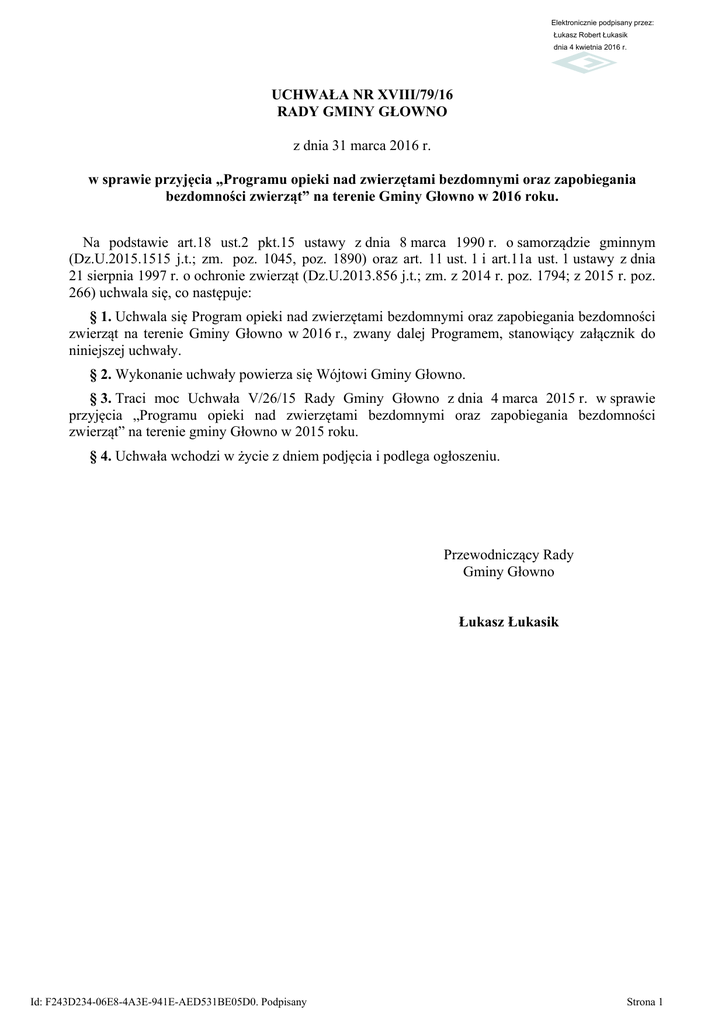 Elektronicznie podpisany przez: Łukasz Robert Łukasik dnia 4 kwietnia 2016 r. UCHWAŁA NR XVIII/79/16 RADY GMINY GŁOWNO z dnia 31 marca 2016 r. w sprawie przyjęcia „Programu opieki nad zwierzętami bezdomnymi oraz zapobiegania bezdomności zwierząt” na terenie Gminy Głowno w 2016 roku. Na podstawie art.18 ust.2 pkt.15 ustawy z dnia 8 marca 1990 r. o samorządzie gminnym (Dz.U.2015.1515 j.t.; zm. poz. 1045, poz. 1890) oraz art. 11 ust. 1 i art.11a ust. 1 ustawy z dnia 21 sierpnia 1997 r. o ochronie zwierząt (Dz.U.2013.856 j.t.; zm. z 2014 r. poz. 1794; z 2015 r. poz. 266) uchwala się, co następuje: § 1. Uchwala się Program opieki nad zwierzętami bezdomnymi oraz zapobiegania bezdomności zwierząt na terenie Gminy Głowno w 2016 r., zwany dalej Programem, stanowiący załącznik do niniejszej uchwały. § 2. Wykonanie uchwały powierza się Wójtowi Gminy Głowno. § 3. Traci moc Uchwała V/26/15 Rady Gminy Głowno z dnia 4 marca 2015 r. w sprawie przyjęcia „Programu opieki nad zwierzętami bezdomnymi oraz zapobiegania bezdomności zwierząt” na terenie gminy Głowno w 2015 roku. § 4. Uchwała wchodzi w życie z dniem podjęcia i podlega ogłoszeniu. Przewodniczący Rady Gminy Głowno Łukasz Łukasik Id: F243D234-06E8-4A3E-941E-AED531BE05D0. Podpisany Strona 1 Załącznik Nr 1 do Uchwały Nr XVIII/79/16 Rady Gminy Głowno z dnia 31 marca 2016 r. Program opieki nad zwierzętami bezdomnymi oraz zapobiegania bezdomności zwierząt na terenie Gminy Głowno w 2016 roku. § 1. Uchwała ma zastosowanie do wszystkich zwierząt domowych i gospodarskich, w tym w szczególności do psów i kotów przebywających w granicach administracyjnych Gminy Głowno. § 2. Celami programu są: 1) zapobieganie bezdomności bezpańskich zwierząt, 2) ograniczenie niekontrolowanego rozrodu psów i kotów, 3) edukacja mieszkańców gminy w zakresie zasad humanitarnego traktowania zwierząt oraz obowiązków właścicieli zwierząt domowych, 4) opieka nad zwierzętami bezdomnymi, 5) zapewnienie bezpieczeństwa mieszkańcom Gminy Głowno. § 3. 1. Koordynatorem Programu jest Wójt Gminy Głowno. 2. Realizatorami Programu są: 1) na poziomie Gminy Głowno - Wójt Gminy Głowno, 2) podmiot prowadzący schronisko dla zwierząt, wyłoniony w drodze przetargu, świadczący usługi na podstawie umowy podpisanej z gminą - Hotel dla Zwierząt i Ptactwa Domowego Longin Siemiński Gabinet Weterynaryjny, Schronisko, Centrum Rehabilitacyjno – Szkoleniowo - Adopcyjne w Łodzi, ul. Kosodrzewiny 56 lok.2, 92-411 Łódź - miejsce prowadzenia działalności - Wojtyszki 18, 98-277 Brąszewice, (WNI 10143402), zwany dalej „Schroniskiem dla zwierząt”, 3) organizacje pozarządowe, których statutowym celem jest ochrona zwierząt, współpracujące z Gminą Głowno, 4) szkoły dla których Gmina Głowno jest organem prowadzącym, 5) sołtysi sołectw położonych na terenie Gminy Głowno, 6) osoby prawne i fizyczne działające na rzecz zapewnienia opieki bezdomnym zwierzętom. § 4. Zapewnienie opieki bezdomnym zwierzętom z terenu Gminy Głowno realizują: 1) Schronisko dla zwierząt (WNI: 10143402) poprzez: a) odłowienie zwierzęcia i transport do miejsca 14 dniowej kwarantanny przy ul. Kosodrzewiny 56 lok. 2 w Łodzi, b) zweryfikowanie nr chip, bądź zachipowanie zwierzęcia w przypadku braku chipa, c) próbę ustalenia właściciela odłapanego zwierzęcia, d) sprawowanie opieki weterynaryjnej obejmującej odpchlenie, odrobaczenie, szczepienia, kontrolę płodności i sterylizację i kastrację. Id: F243D234-06E8-4A3E-941E-AED531BE05D0. Podpisany Strona 1 e) umieszczenie zwierzęcia w schronisku i poszukiwanie osób chętnych do adopcji zwierzęcia, 2) Wójt poprzez wskazanie gospodarstwa rolnego, zapewniającego miejsce dla zwierząt gospodarskich, 3) organizacje pozarządowe poprzez realizację zadań publicznych, obejmujących opiekę nad zwierzętami bezdomnym. § 5. Sprawowanie opieki nad kotami wolno żyjącymi, w tym ich dokarmianie realizują: 1) Wójt Gminy poprzez: a) zakup i wydawanie karmy społecznym opiekunom (karmicielom) kotów wolno żyjących, b) podejmowanie interwencji w sprawach kotów wolno żyjących przy udziale organizacji pozarządowych lub/i przedstawiciela Urzędu Gminy Głowno, c) organizacje pozarządowe poprzez realizację zadań publicznych obejmujących opiekę nad kotami wolno żyjącymi oraz podejmowanie interwencji w sprawach kotów wolno żyjących. § 6. Odławianie bezdomnych zwierząt na terenie Gminy Głowno realizuje Schronisko dla zwierząt (WNI 10143402), na podstawie zawartej umowy na świadczenie usług w tym zakresie. 1) Odławianie bezdomnych i błąkających się zwierząt gospodarskich będzie realizowane na podstawie umowy zawieranej z osobą posiadającą uprawnienia w zakresie stosowania środków usypiających i do używania broni Palmera. Transport odłowionego zwierzęcia do gospodarstwa, które zostało wyznaczone do zapewnienia opieki dla takich zwierząt gospodarskich zapewnia Wójt Gminy Głowno. § 7. Obligatoryjną sterylizację albo kastrację zwierząt realizują: 1) Schronisko dla zwierząt poprzez obligatoryjne przeprowadzanie zabiegów sterylizacji i kastracji zwierząt przyjętych do schroniska, z wyjątkiem zwierząt u których istnieją przeciwwskazania do wykonywania tych zabiegów, z uwagi na stan zdrowia i/lub wiek, 2) Wójt Gminy Głowno poprzez prowadzenie akcji zachęcającej właścicieli psów i kotów do wykonywania zabiegów sterylizacji i kastracji. § 8. Poszukiwanie nowych właścicieli dla bezdomnych zwierząt realizują: 1) Schronisko dla zwierząt poprzez prowadzenie działań zmierzających do pozyskiwania nowych właścicieli i oddawania do adopcji bezdomnych zwierząt osobom zainteresowanym i zdolnym zapewnić im należyte warunki bytowania, 2) Wójt Gminy Głowno poprzez promocję adopcji zwierząt ze schroniska oraz prowadzenie działań zmierzających do pozyskania nowych właścicieli, m. in. umieszczanie og