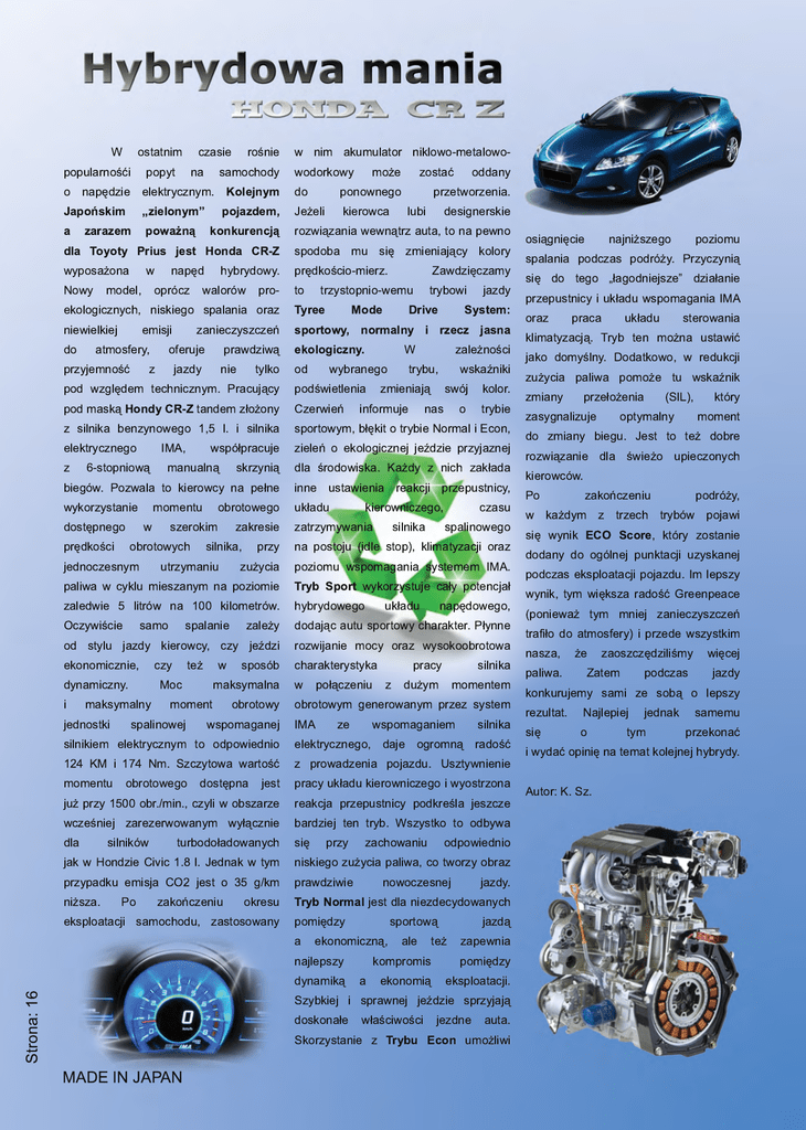 Strona: 1 6 W ostatnim czasie rośnie popularnośći popyt na samochody o napędzie elektrycznym. Kolejnym Japońskim „zielonym” pojazdem, a zarazem poważną konkurencją dla Toyoty Prius jest Honda CR-Z wyposażona w napęd hybrydowy. Nowy model, oprócz walorów proekologicznych, niskiego spalania oraz niewielkiej emisji zanieczyszczeń do atmosfery, oferuje prawdziwą przyjemność z jazdy nie tylko pod względem technicznym. Pracujący pod maską Hondy CR-Z tandem złożony z silnika benzynowego 1 ,5 l. i silnika elektrycznego IMA, współpracuje z 6-stopniową manualną skrzynią biegów. Pozwala to kierowcy na pełne wykorzystanie momentu obrotowego dostępnego w szerokim zakresie prędkości obrotowych silnika, przy jednoczesnym utrzymaniu zużycia paliwa w cyklu mieszanym na poziomie zaledwie 5 litrów na 1 00 kilometrów. Oczywiście samo spalanie zależy od stylu jazdy kierowcy, czy jeździ ekonomicznie, czy też w sposób dynamiczny. Moc maksymalna i maksymalny moment obrotowy jednostki spalinowej wspomaganej silnikiem elektrycznym to odpowiednio 1 24 KM i 1 74 Nm. Szczytowa wartość momentu obrotowego dostępna jest już przy 1 500 obr./min., czyli w obszarze wcześniej zarezerwowanym wyłącznie dla silników turbodoładowanych jak w Hondzie Civic 1 .8 l. Jednak w tym przypadku emisja CO2 jest o 35 g/km niższa. Po zakończeniu okresu eksploatacji samochodu, zastosowany MADE IN JAPAN w nim akumulator niklowo-metalowowodorkowy może zostać oddany do ponownego przetworzenia. Jeżeli kierowca lubi designerskie rozwiązania wewnątrz auta, to na pewno spodoba mu się zmieniający kolory prędkościo-mierz. Zawdzięczamy to trzystopnio-wemu trybowi jazdy Tyree Mode Drive System: sportowy, normalny i rzecz jasna ekologiczny. W zależności od wybranego trybu, wskaźniki podświetlenia zmieniają swój kolor. Czerwień informuje nas o trybie sportowym, błękit o trybie Normal i Econ, zieleń o ekologicznej jeździe przyjaznej dla środowiska. Każdy z nich zakłada inne ustawienia reakcji przepustnicy, układu kierowniczego, czasu zatrzymywania silnika spalinowego na postoju (idle stop), klimatyzacji oraz poziomu wspomagania systemem IMA. Tryb Sport wykorzystuje cały potencjał hybrydowego układu napędowego, dodając autu sportowy charakter. Płynne rozwijanie mocy oraz wysokoobrotowa charakterystyka pracy silnika w połączeniu z dużym momentem obrotowym generowanym przez system IMA ze wspomaganiem silnika elektrycznego, daje ogromną radość z prowadzenia pojazdu. Usztywnienie pracy układu kierowniczego i wyostrzona reakcja przepustnicy podkreśla jeszcze bardziej ten tryb. Wszystko to odbywa się przy zachowaniu odpowiednio niskiego zużycia paliwa, co tworzy obraz prawdziwie nowoczesnej jazdy. Tryb Normal jest dla niezdecydowanych pomiędzy sportową jazdą a ekonomiczną, ale też zapewnia najlepszy kompromis pomiędzy dynamiką a ekonomią eksploatacji. Szybkiej i sprawnej jeździe sprzyjają doskonałe właściwości jezdne auta. Skorzystanie z Trybu Econ umożliwi osiągnięcie najniższego poziomu spalania podczas podróży. Przyczynią się do tego „łagodniejsze” działanie przepustnicy i układu wspomagania IMA oraz praca układu sterowania klimatyzacją. Tryb ten można ustawić jako domyślny. Dodatkowo, w redukcji zużycia paliwa pomoże tu wskaźnik zmiany przełożenia (SIL), który zasygnalizuje optymalny moment do zmiany biegu. Jest to też dobre rozwiązanie dla świeżo upieczonych kierowców. Po zakończeniu podróży, w każdym z trzech trybów pojawi się wynik ECO Score, który zostanie dodany do ogólnej punktacji uzyskanej podczas eksploatacji pojazdu. Im lepszy wynik, tym większa radość Greenpeace (ponieważ tym mniej zanieczyszczeń trafiło do atmosfery) i przede wszystkim nasza, że zaoszczędziliśmy więcej paliwa. Zatem podczas jazdy konkurujemy sami ze sobą o lepszy rezultat. Najlepiej jednak samemu się o tym przekonać i wydać opinię na temat kolejnej hybrydy. Autor: K. Sz.