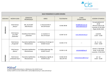 BAZA POZNAŃSKICH KLUBÓW SENIORA PIĄTKOWO GRUNWALD DZIELNICA NAZWA KLUBU JEDNOSTKA PROWADZĄCA ADRES TELEFON/FAX E-MAIL STRONA WWW GODZINY OTWARCIA Klub Seniora „Raszyn” SM „Grunwald” (Klub Raszyn) ul. Rynarzewska 9 60-133 Poznań 61 861 08 84 [email protected] www.klubraszyn.pl Poniedziałekb16.3018.30 Wtorek 16.00-21.00 Czwartek 15.30-18.00 Piątek 18.00-19.00 Klub Seniora przy ODK „Stokrotka” Osiedlowy Dom Kultury „Stokrotka” ul. Cyniowa 11 60-175 Poznań 61 867 19 19 www.dkstokrotka.pl czwartek 12.00 – 14.00 Klub Seniora „Przyjaciele” Poznańska Spółdzielnia Mieszkaniowa os. Bolesława Chrobrego 12 60-681 Poznań 61 825 17 53 --- wt., śr., czw. 14.00 – 18.00 Klub Seniora „Batory” Poznańska Spółdzielnia Mieszkaniowa os. Stefana Batorego 25a 60-687 Poznań 61 824 11 40 [email protected] wtorek, 17.00-20.00 środa, 11.00-14.00 czwartek, 17.00-20.00 Klub Seniora „Królewska Oaza” Poznańska Spółdzielnia Mieszkaniowa os. Władysława Jagiełły 13 60-694 Poznań 61 822 24 92 602 297 675 [email protected] wt – pt 16.00 – 20.00 Centrum Inicjatyw Senioralnych, ul. Mickiewicza 9A, 60-833 Poznań tel./fax: 61 847 21 11 tel. 61 842 35 09 | [email protected] | www.centrumis.pl RATAJE Klub Seniora "Korona" Poznańska Spółdzielnia Mieszkaniowa os. Bolesława Śmiałego 104 60-682 Poznań 61 823 60 21 [email protected] pon, pt 9.00 - 15.00 wt, śr, czw 14.00 20.00 Klub Seniora "Złoty liśc" Poznańska Spółdzielnia Mieszkaniowa os. Łokietka 6c 61-616 Poznań 696 674 813 ---- pon, czw 17.00 -20.00 Klub Seniora "Hetman" Poznańska Spółdzielnia Mieszkaniowa os. Sobieskiego 52 60-688 Poznań 61 825 47 22 --- pon - pt 13.00 - 21.00 Klub Seniora „Feniks” SM „Osiedle Młodych” (DK „Polan Sto”) os. Polan 100 61-249 Poznań 61 879 71 51 [email protected] www.osiedlemlodych.pl środa Klub Seniora „Jubilatki” SM „Osiedle Młodych” (DK „Jubilat”) os. Tysiąclecia 4/5 61-255 Poznań zajęcia: DK os. Tysiąclecia 30 61 876 08 40 [email protected] www.osiedlemlodych.pl poniedziałek 17.00-19.00 Klub Seniora „Piastun” SM „Osiedle Młodych” (DK „Na Skarpie”) os. Piastowskie 104 61-164 Poznań 61 877 05 51 [email protected] www.osiedlemlodych.pl czwartek 17.00-19.00 Klub Seniora „Jarzębina” SM „Osiedle Młodych” (DK „Jagiellonka”) os. Jagiellońskie 120 61-222 Poznań 61 877 51 64 www.osiedlemlodych.pl środa od 16.00 Centrum Inicjatyw Senioralnych, ul. Mickiewicza 9A, 60-833 Poznań tel./fax: 61 847 21 11 tel. 61 842 35 09 | [email protected] | www.centrumis.pl RATAJE CD. Klub Seniora „Złota Jesień” SM „Osiedle Młodych” os. Powstań Narodowych 31 61-215 Poznań 61 879 05 22 www.osiedlemlodych.pl pon – pt 13.30 – 19.30 Klub Seniora „Rodzina” SM „Osiedle Młodych” os. Czecha 114 61-291 Poznań 61 877 61 58 www.osiedlemlodych.pl wtorek i piątek od 16.00 Klub Seniora "Tęcza" SM „Osiedle Młodych” (DK "Jędruś") os. Bohaterów II Wojny Światowej 76 61-382 Poznań 61 877 01 51 --- pon i czw 16.00 - 19.00 Klub Seniora "Brzozy" SM „Osiedle Młodych” os. Rusa 110 61-245 Poznań 692 923 402 [email protected] środa 15.00 - 17.00 Klub Seniora "Wigor" SM „Osiedle Młodych” Dom Kultury "Na Pięterku" os. Orła Białego 5 61-251 Poznań 61 879 63 11 [email protected] Piątek 17.00 - 20.00 Klub Seniora "Spokojna Przystań" Stowarzyszenie na rzecz Osób Niepełnosprawnych i Ich Rodzin AMIKUS os. Rusa 6 61-245 Poznań 61 874 96 12 [email protected] pon – czw 15.00 - 18.00 Centrum Inicjatyw Senioralnych, ul. Mickiewicza 9A, 60-833 Poznań tel./fax: 61 847 21 11 tel. 61 842 35 09 | [email protected] | www.centrumis.pl SM „Osiedle Młodych” ul. Warszawska 93/95 61-035 Poznań 61 879 47 15 [email protected] pon – pt 16.00 - 20.00 STARE MIASTO Klub Seniora „82” Rada Osiedla Rybaki-Piaski ul. Krakowska 10 61-899 Poznań 505 799 074 [email protected] pon. – czw. 16.00 -19.00 Klub Seniora przy parafii p.w. Maryi Królowej Parafia p.w. Maryi Królowej ul. Rynek Wildecki 4 61-546 Poznań 61 833 36 99 --- środa od 10.00 Klub Seniora Oddział Wlkp. Polskiego Związku Głuchych ul. Przemysłowa 45/49 61-541 Poznań 61 649 77 11 --- pon 8.00 - 16.00 wt - pt 8.00 - 20.00 Klub Seniora „U Salezjanów” Parafia Św. Jana Bosko ul. Pszczelna 22 61-458 Poznań 61 820 11 32 (wew.59) 503 840 309 Fax. 61 820 11 32 [email protected] www.winogrady.salezjanie.pl/ klubwww/index.html pon - czw 15.00 – 18.00 Klub Seniora „Nike” Osiedlowy Dom Kultury „Wiktoria” os. Zwycięstwa 25 F 61-651 Poznań 61 826 33 82 --- pon – czw od 16.00 Klub Seniora „Złota Jesień” Osiedlowy Dom Kultury „Pod Lipami” Os. Pod Lipami 13 F 61-637 Poznań 61 820 07 93 --- pon – pt 16.00-19.00 WINOGRADY WILDA OS. WARSZAW SKIE Klub Seniora „Cybinka” Centrum Inicjatyw Senioralnych, ul. Mickiewicza 9A, 60-833 Poznań tel./fax: 61 847 21 11 tel. 61 842 35 09 | [email protected] | www.centrumis.pl