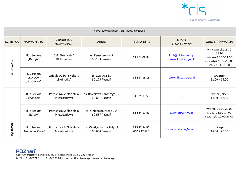 baza poznańskich klubów seniora dzielnica nazwa klubu jednostka