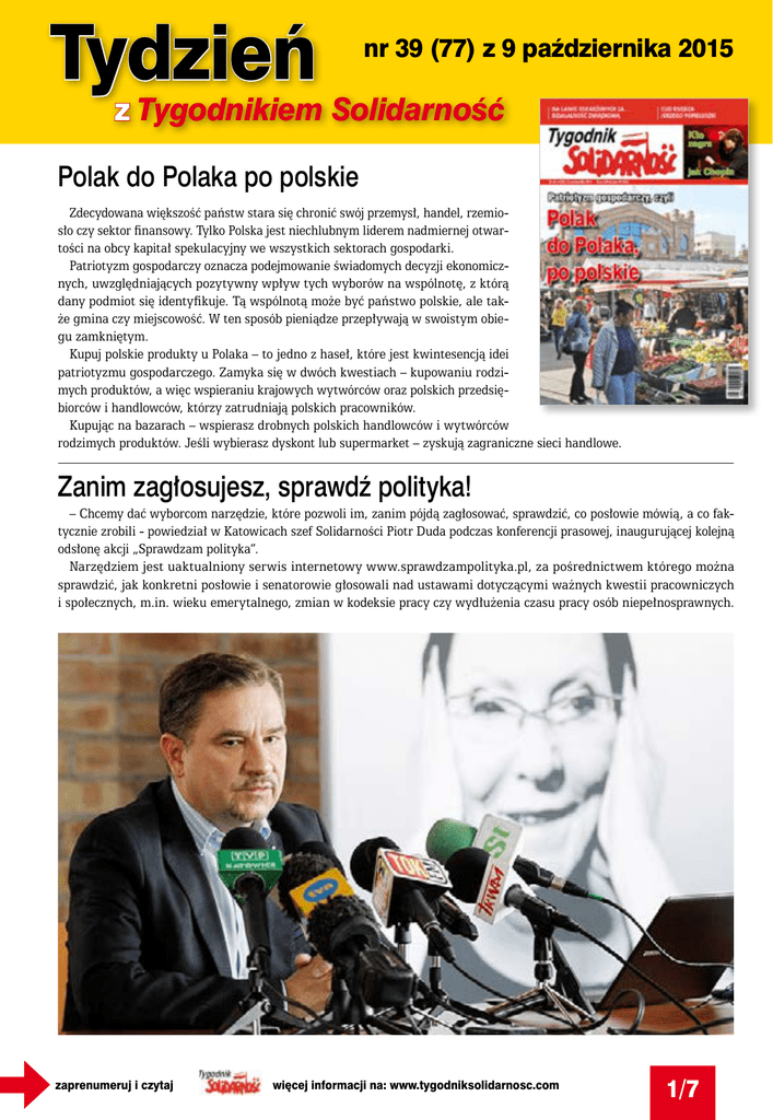 Tydzień z Tygodnikiem Solidarność nr 39 (77) z 9 października 2015 Polak do Polaka po polskie Zdecydowana większość państw stara się chronić swój przemysł, handel, rzemiosło czy sektor finansowy. Tylko Polska jest niechlubnym liderem nadmiernej otwartości na obcy kapitał spekulacyjny we wszystkich sektorach gospodarki. Patriotyzm gospodarczy oznacza podejmowanie świadomych decyzji ekonomicznych, uwzględniających pozytywny wpływ tych wyborów na wspólnotę, z którą dany podmiot się identyfikuje. Tą wspólnotą może być państwo polskie, ale także gmina czy miejscowość. W ten sposób pieniądze przepływają w swoistym obiegu zamkniętym. Kupuj polskie produkty u Polaka – to jedno z haseł, które jest kwintesencją idei patriotyzmu gospodarczego. Zamyka się w dwóch kwestiach – kupowaniu rodzimych produktów, a więc wspieraniu krajowych wytwórców oraz polskich przedsiębiorców i handlowców, którzy zatrudniają polskich pracowników. Kupując na bazarach – wspierasz drobnych polskich handlowców i wytwórców rodzimych produktów. Jeśli wybierasz dyskont lub supermarket – zyskują zagraniczne sieci handlowe. Zanim zagłosujesz, sprawdź polityka! – Chcemy dać wyborcom narzędzie, które pozwoli im, zanim pójdą zagłosować, sprawdzić, co posłowie mówią, a co faktycznie zrobili - powiedział w Katowicach szef Solidarności Piotr Duda podczas konferencji prasowej, inaugurującej kolejną odsłonę akcji „Sprawdzam polityka”. Narzędziem jest uaktualniony serwis internetowy www.sprawdzampolityka.pl, za pośrednictwem którego można sprawdzić, jak konkretni posłowie i senatorowie głosowali nad ustawami dotyczącymi ważnych kwestii pracowniczych i społecznych, m.in. wieku emerytalnego, zmian w kodeksie pracy czy wydłużenia czasu pracy osób niepełnosprawnych. zaprenumeruj i czytaj więcej informacji na: www.tygodniksolidarnosc.com 1/7 nr 42 z 16 października 2015 Porozumienie złamane, górnicy wyszli na ulice Ulicami Brzeszcz przeszła niemal 10-tysięczna manifestacja górników oburzonych postępowaniem rządu, który złamał porozumienie podpisane 17 stycznia. Protest był pierwszą z akcji zaplanowanych przez Międzyzwiązkowy Komitet Protestacyjno-Strajkowy (MKPS) Regionu Śląsko-Dąbrowskiego. Przypomnijmy, że pod koniec września MKPS odwiesił czynną akcję protestacyjno-strajkową na Śląsku. Na ławie oskarżonych za… działalność związkową Józefowi Mozolewskiemu, szefowi Zarządu Regionu Podlaskiego „S”, policja postawiła zarzut poprowadzenia nielegalnej demonstracji 9 marca – w dniu, gdy związkowcy odwiedzali biura posłów PO i manifestacji nie organizowali. Ten proces sądowy to ewidentna zemsta polityków władzy. St ałe felietony zamieszc zają: Nie pozwólmy sfałszować wyborów! – apeluje dr Paweł Janowski. Zdrajcy powiedzą, że jest bezpiecznie. Złodzieje dodadzą, że nie ma już czego kraść. Malkontenci, machając ręką, będą mruczeć pod nosem: „I tak nic się nie zmieni”. Hasło Platformy, banksterskiej Nowoczesnej, PSL i po raz piąty Zjednoczonej Lewicy powinno brzmieć: „Nie patrzcie nam na ręce. Pozwólcie nam policzyć głosy”. Jak to wymsknęło się przy okazji ostatnich wyborów prezydenckich Grzegorzowi Schetynie: „…choćbyśmy DOKŁADNIE liczyli głosy, to do rana nic się nie zmieni”. Tak w wolnym tłumaczeniu przytaczam i przypominam. I dlatego bardzo ucieszył mnie apel m.in. Józefa Orła i Artura Dmochowskiego, wygłoszony w Klubie Ronina w minionym tygodniu, aby przypilnować wyborów, Ryszard Bugaj Marek Lewandowski Cezary Krysztopa Jan Pietrzak Stanisław Żaryn Marek Jan Chodakiewicz Rafał Górski zasilać szeregi Ruchu Kontroli Wyborów, zgłaszać mężów zaufania do każdej komisji wyborczej. Najważniejszym jest, by za dwa tygodnie patrzeć władzy na ręce. By za dwa tygodnie nie pozwolić na oszustwo wyborcze. Porad Poradprawnych prawnychudzielają udzielająeksperci ekspercizwiązkowi. związkowi.WWtym tymwydaniu wydaniuTS TSnastępujące następującetematy: tematy:Trybunał Sprawiedliwości o czasie pracy pracowników dojeżdżających do klienta, zapomogi przyznane międzyzakładowa komisja koordynacyjna (MKK), prawo do zasiłku przedemerytalnego pracownikowi a podatek, nie bądź stratny, reklamuj nieudane zakupy! a dochód z wynajmu zaprenumeruj i czytaj więcej informacji na: www.tygodniksolidarnosc.com 2/7 nr 42 z 16 października 2015 Cud za wstawiennictwem księdza Jerzego Tuż przed 31. rocznicą męczeńskiej śmierci błogosławionego ks. Jerzego Popiełuszki, patrona Solidarności, sprawa jego kanonizacji wkroczyła w drugą, decydującą fazę. Komisja powołana przez diecezję Creteil pod Paryżem rozpoczęła procedurę badania niedającego się wyjaśnić naukowo uleczenia śmiertelnie chorego na białaczkę za wstawiennictwem polskiego męczennika. Ustaliła, że doszło do „niewytłumaczalnego i zadziwiającego uzdrowienia”, czyli cudu. Kto zagra jak Chopin Nie wystarcza materia, czyli opanowanie nut, potrzeba jeszcze duszy. Konkurs chopinowski wygra ten pianista, który ożywi ducha Chopina. W I etapie rywalizacji wirtuozerią błysnęli Rosjanie, szczególnie Arseny Tarasewicz-Nikołajew. Taśma umierania Ten, kto wymyślił domy starców – sam powinien w nich zamieszkać. Ta instytucja – z założenia dobroczynna – jest czymś absolutnie społecznie nienaturalnym – gettem starości, chorób, „taśmą umierania”. Starzec czy staruszka, zdolni do dorobienia sobie przez własną aktywność – pisanie tekstów, malowanie etc. – k a ż d y zarobiony grosz muszą zgłaszać w Domu Pomocy Społecznej, aby pobrano z niego stosowny haracz w niesłychanej wysokości 70 proc.! Ponadto w każdym numerze oprócz tematyki związkowej i społecznej: gospodarka, historia, kultura, sport, krzyżówka i wiele więcej... zaprenumeruj i czytaj więcej informacji na: www.tygodniksolidarnosc.com 3/7 Redaguje Dz