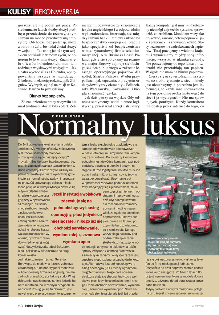 KULISY REKONWERSJA goszczy, ale nie podjął już pracy. Po siedemnastu latach służby złożył prośbę o przeniesienie do rezerwy, a tym samym na mocno przedwczesną emeryturę. Odchodził bez pretensji, może z odrobiną żalu, bo nadal chciał służyć w wojsku: – Tak to się jakoś z tym wojskiem poukładało w moim życiu, że honorem było w nim służyć. Znam wielu oficerów holenderskich, mam tam rodzinę z wojskowymi tradycjami. Jak siostra wychodziła za Holendra, występowaliśmy wszyscy w mundurach. Z kolei członek mojej rodziny, ppłk Zbigniew Wydrych, zginął na misji w Kosowie. Bardzo to przeżyliśmy. Biurko bez papierów Ze znalezieniem pracy w cywilu nie miał trudności, dostał kilka ofert. Żoł- nierzami, oczywiście ze znajomością języka angielskiego i z odpowiednim wykształceniem, interesują się między innymi banki. Ponieważ ukończył bezpieczeństwo europejskie, pracuje jako specjalista od bezpieczeństwa w międzynarodowej firmie teleinformatycznej. A w Business Lease Poland, gdzie się spotykamy na rozmowę, major Borowy zajmuje się obsługą sektora publicznego w zakresie leasingu operacyjnego pojazdów dla spółek Skarbu Państwa. W obu przypadkach, jak zapewnia, o przyjęciu zadecydowały trzy elementy – Politechnika Warszawska, „Koźmiński” i biegła znajomość języka. Jak dziś patrzy na wojsko? Gdy odrzuca sentymenty, widzi niemoc logistyczną, przestarzał sprzęt i struktury. Każdy komputer jest inny: – Przełożony nie mógł zajrzeć do systemu, sprawdzić, co zrobiłem. Musiałem wszystko drukować, zanosić, potem poprawki, jakiś przecinek... i znowu drukować. Stosy bezsensownie zadrukowanych papierów! Tutaj pracujemy z wieloma krajami i wymieniamy między sobą informacje, wszystko w ułamku sekundy. Nie potrzebujemy do tego faksu i niszczarki nie przerabiają ton papieru. W ogóle nie mam na biurku papierów. Cieszy się oczywistościami: wszystko, co zrobi, rejestruje w sieci, i kiedy jest nieuchwytny, a potrzebna jest informacja, to każda inna upoważniona na tym poziomie osoba może wejść do sieci i ją wyciągnąć: – Nie ma spraw tajnych, poufnych. Każdy kontrahent ma dostęp przez internet do tego, co Normalny luksus PIOTR BERNABIUK Do Syrii przyjechała kolejna zmiana polskich tym z życia: eksploatując przykładowo sto „misjonarzy”. Młodych oficerów zafascynowasamochodów osobowych i dostawczych ły służbowe samochody terenowe. w bazie lotniczej, musimy mieć tam kompa– Rzeczywiście są do naszej dyspozycji? nię transportową. Do żołnierzy kierowców – pytali. – Bez kierowcy, bez dysponenta, bez potrzebny jest dowódca kompanii, szef podpisania zapotrzebowania z uzasadnieniem tyoddziału, dowódcy plutonów i drużyn, nadzień wcześniej? Bardzo często luksusy zustępnie służba logistyczna, bo ktoś musi ich pełnie przerastające naszą wyobraźnię gdzie ubrać i wykarmić, oraz finansowa, żeby to indziej są normalnością, zwykłymi narzędziawszystko porozliczać. Utrzymanie aut mi pracy. Od opisywanego epizodu minęło w sprawności zapewnia pododdział remonładne parę lat, a w kraju sytuacja niewiele się towy, borykający się z planowaniem, zakuw tym względzie zmienipem części zamiennych, obła. Wiele wprawdzie osią- Jeżeli instytucja wojskowa sługami i naprawami. Auta, gnęliśmy w cywilizowaniu dziś zbyt skomplikowane zdecyduje się na sił zbrojnych, ale samodla mechaników żołnierzy, pełnoobsługowy leasing aby sami mogli je naprachód służbowy, nie mylić z pojazdem bojowym, zalegają na postojach operacyjny, płaci jedynie co wiać, nadal jest luksusem naprawczych. Pojazdy eksi miarą prestiżu. A także miesiąc ratę, i nikogo już nie ploatowane są latami, po zjawiskiem generującym czym nie bardzo wiadomo, pokaźne i zbędne koszty. obchodzi serwisowanie, co z nimi zrobić. Do tego Na razie trudno sobie wy- wymiana oleju, sezonowa wszystkiego doliczmy podobrazić, by żołnierz zawooddział zabezpieczenia, wymiana opon dowy średniej rangi mógł służbę dyżurną, zużycie wowziąć kluczyki z dyżurki, odpalić służbowe dy, energii, utrzymanie obiektów, a także auto i pojechać w pilnej sprawie na drugi sprawy związane z ochroną środowiska, koniec miasta. z zanieczyszczeniami. Wszystko razem jest Jednakże zdaniem mjr. rez. Gerarda zupełnie niepotrzebne, a bardzo dużo koszBorowego, do niedawna jeszcze żołnierza tuje. Alternatywą jest pełnoobsługowy lezawodowego, a od paru tygodni menażera asing operacyjny (FSL), zwany wynajmem w holenderskiej firmie leasingowej, nie ma długoterminowym. Nagle cała opisana żadnych przeszkód, aby tak się stało. W tej struktura staje się zbędna. Instytucja wojdziedzinie, uważa major, istnieje jedynie baskowa płaci jedynie co miesiąc ratę, i nikoriera mentalna, bo w żadnym przypadku figo już nie obchodzi serwisowanie, wymiana nansowa! Posługuje się tu obrazem, jeśli oleju, sezonowa wymiana opon. Nowe sanawet nieco przerysowanym, to zaczerpnięmochody się nie psują, ale jeśli już przyda- 58 Polska Zbrojna Nowe samochody się nie psują, ale jeśli już przydarzy się coś nadzwyczajnego, wystarczy telefon do firmy obsługującej jednostkę. rzy się coś nadzwyczajnego, wystarczy telefon do firmy obsługującej jednostkę. Oczywiście na czas naprawy zostaje podstawione auto zastępcze. Po trzech latach flota jest wymieniana. Nowsze modele dodają prestiżu, używane dotąd auta zostają sprzedane na rynku. Jedyny problem z nowymi maszynami polega na tym, że jeśli chcemy zadawać szyku szcze- nr 13/2008 | | | | | | | | | ARMIE | | ŚWIATA ZAPIS FORUM NA CELOWNIKU WOJSKO PORADY PO SŁUŻBIE HISTORIA MILITARIA ŚWIAT PRASA KULISY TO I OWO się u nas dzieje np. z jego flotą aut. Śmieje się, że w służbowym komputerze nie może jedynie grać w „kulki”, bo karta graficzna jest zintegrowana: – Pracujemy od ósmej do osiemnastej, ale jak potrzeba, jest przetarg, wszyscy 