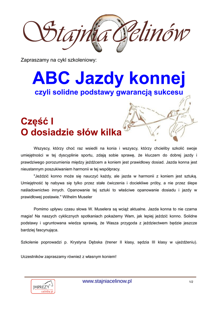 Zapraszamy na cykl szkoleniowy: ABC Jazdy konnej czyli solidne podstawy gwarancją sukcesu Część I O dosiadzie słów kilka Wszyscy, którzy choć raz wsiedli na konia i wszyscy, którzy chcieliby szkolić swoje umiejętności w tej dyscyplinie sportu, zdają sobie sprawę, że kluczem do dobrej jazdy i prawdziwego porozumienia między jeźdźcem a koniem jest prawidłowy dosiad. Jazda konna jest nieustannym poszukiwaniem harmonii w tej współpracy. "Jeździć konno może się nauczyć każdy, ale jazda w harmonii z koniem jest sztuką. Umiejętność tę nabywa się tylko przez stałe ćwiczenia i dociekliwe próby, a nie przez ślepe naśladownictwo innych. Opanowanie tej sztuki to właściwe opanowanie dosiadu i jazdy w prawidłowej postawie." Wilhelm Museler Pomimo upływu czasu słowa W. Muselera są wciąż aktualne. Jazda konna to nie czarna magia! Na naszych cyklicznych spotkaniach pokażemy Wam, jak lepiej jeździć konno. Solidne podstawy i ugruntowana wiedza sprawią, że Wasza przygoda z jeździectwem będzie jeszcze bardziej fascynująca. Szkolenie poprowadzi p. Krystyna Dębska (trener II klasy, sędzia III klasy w ujeżdżeniu). Uczestników zapraszamy również z własnym koniem! www.stajniacelinow.pl 1/2 OPIS SZKOLENIA: – – – – spotkanie szkoleniowe pt. "O dosiadzie słów kilka" jest pierwszym spotkanie z cyklu "ABC jazdy konnej – czyli solidne podstawy gwarancją sukcesu"; szkolenie prowdzone jest w formie wykładów multimedialnych (zdjęcia, filmy, prezentacje) prowadzonych na przemian z zajęciami praktycznymi na koniach; przewidziane są dwa bloki zajęć praktycznych na koniach – ćwiczenia, obserwacja jeźdzców i korekta błędów; w cenie szkolenia zawarte są materiały szkoleniowe; DATA I MIEJSCE SZKOLENIA: – – – 18/04/2015 w godzinach 9.00 – 18.00; "Stajnia Celinów", Celinów 63 k/Warszawy, gm. Dębe Wielkie, www.stajniacelinow.pl; dojazd i lokalizacja na stronie internetowej: www.stajniacelinow.pl > Kontakt, proszę o wydrukowanie Mapki Dojazdu; WYŻYWIENIE: – – – w trakcie szkolenie do dyspozycji jest barek kawa-herbata oraz ciastka; przerwa obiadowa planowana jest ok. godziny 14.00; obiad dodatkowo płatny 30,00 zł/ osobę, możliwe jest zamówienie obadu wegetariańskiego. Zamówienie obiadu należy zgłosić w zgłoszeniu na szkolenie; CENA: – – – 150,00 zł dla osoby uczestniczącej w szkoleniu - jeźdźca; 100,00 zł dla obserwatora szkolenia; 50,00 zł boks dla konia INFORMACJE I ZAPISY: – – – wszelkich informacji o szkoleniu, zapisach udzielają: Krystyna Dębska kom. 604-774-481 oraz Tomasz Węgliński kom. 601-998-390; ilość miejsc jest ograniczona, o przyjeciu na szkolenie decyduje kolejność zgłoszeń; zgłoszenia przyjmowane są mailowo na adres: [email protected]. W zgłoszeniu proszę podać informacje: jeździec/obserwator, obiad tak/nie; Stajnia Celinów – miejsce spotkań ... www.stajniacelinow.pl 2/2
